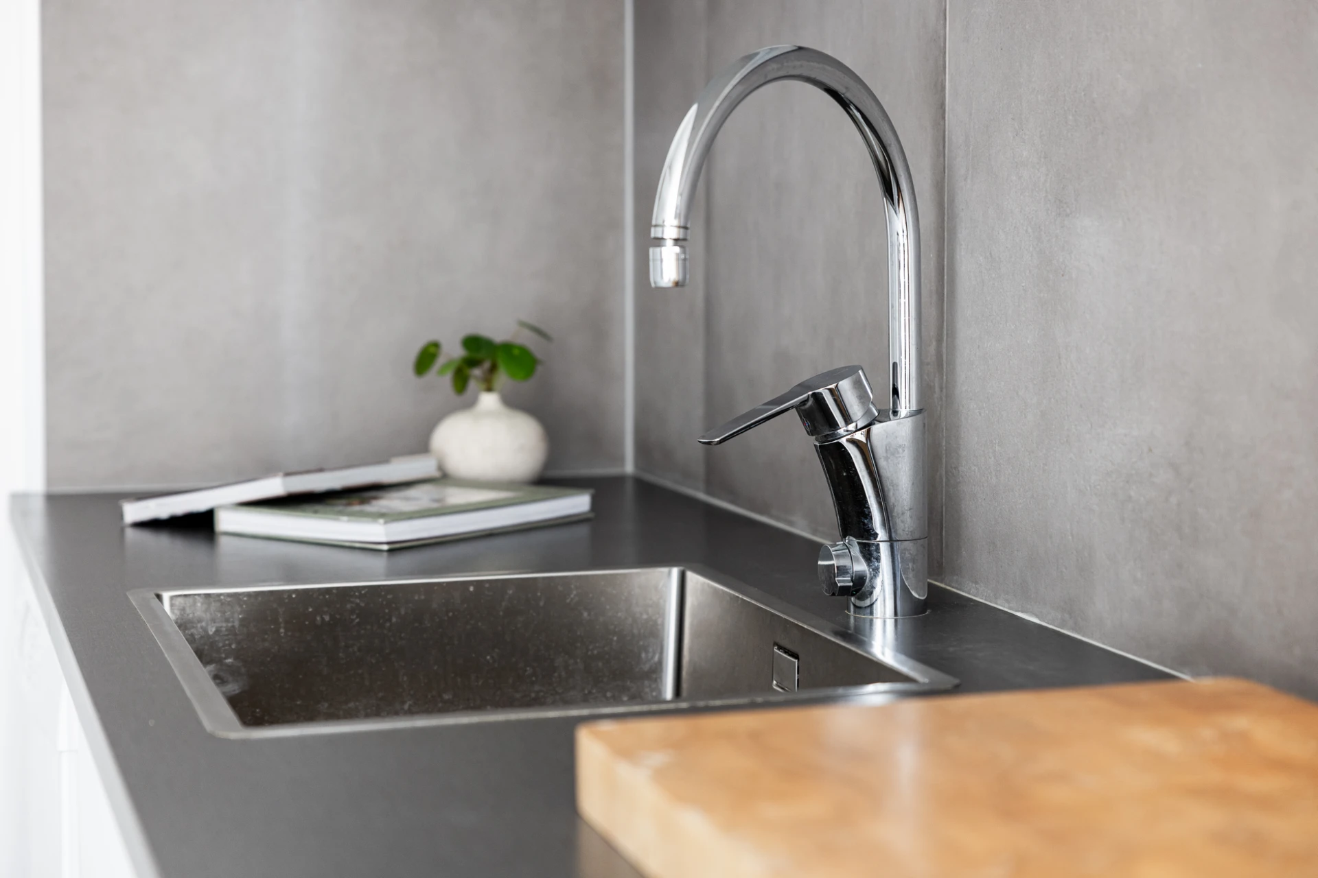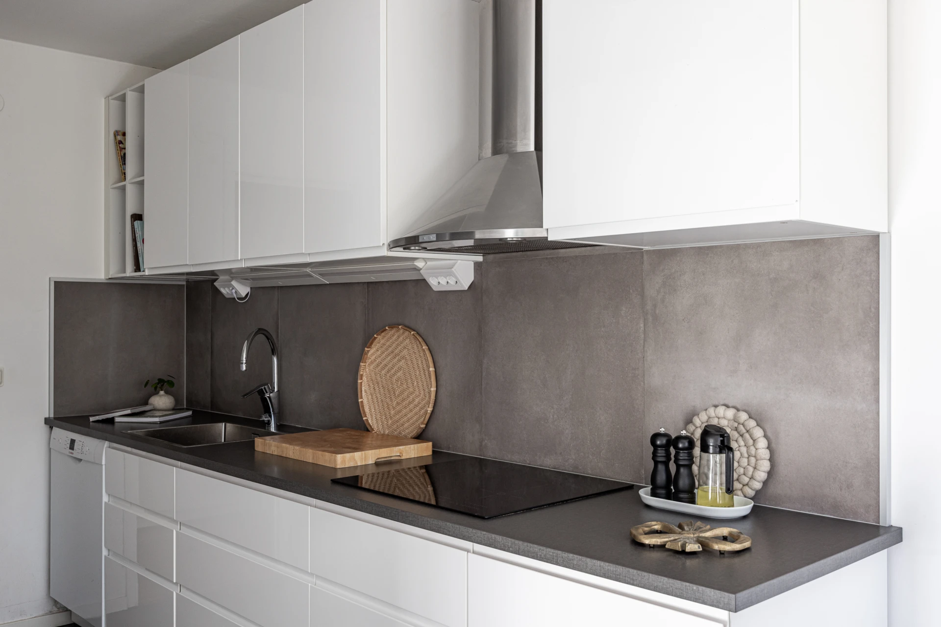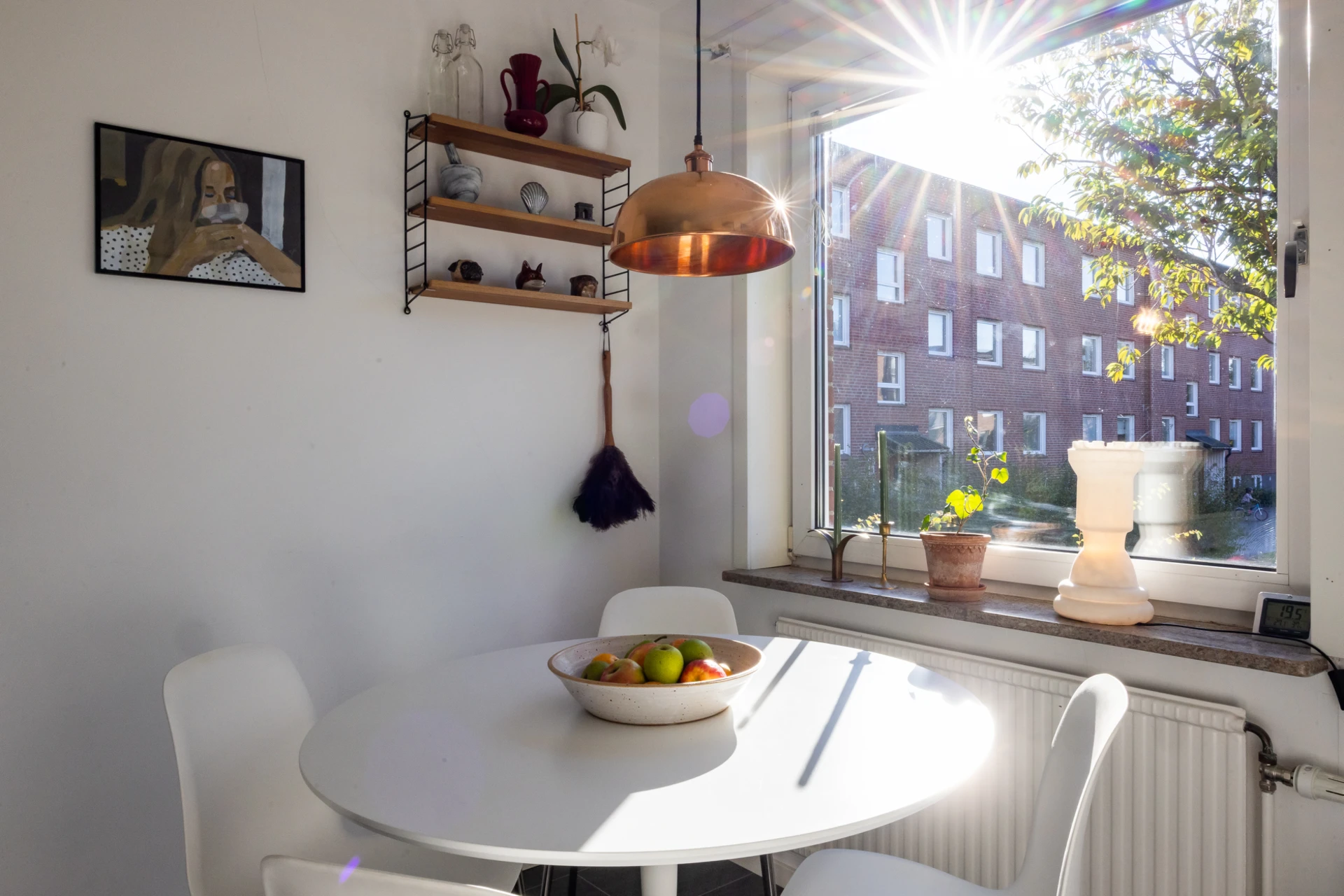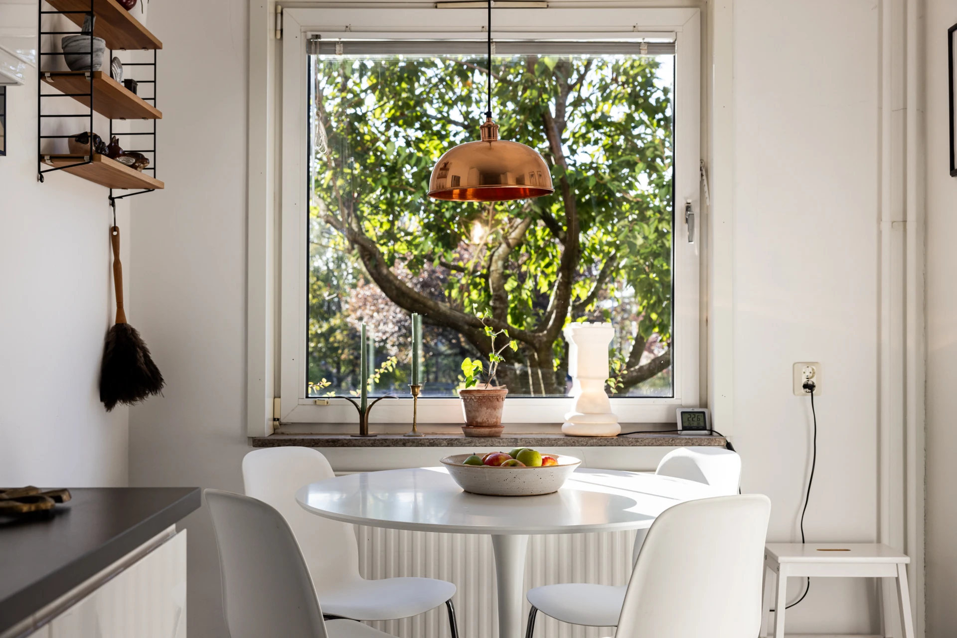 Grått laminatgolv och vita väggar med fönsterbänkar i natursten. Köksinredning i vitt från IKEA och ovan bänkskivan i grå laminat sitter grå klinker. Köket är utrustat med kyl och frys, mikrovågsugn, diskmaskin, induktionshäll, varmluftsugn samt köksfläkt. Matplats för ca fyra personer.
