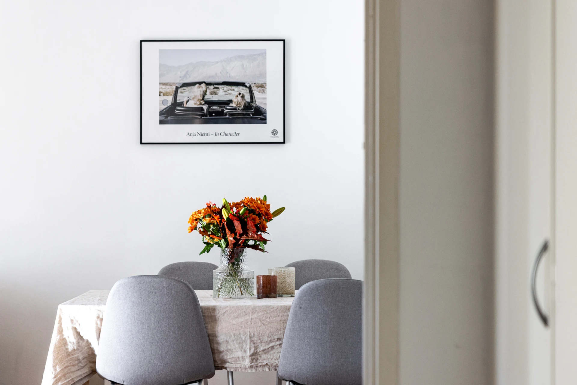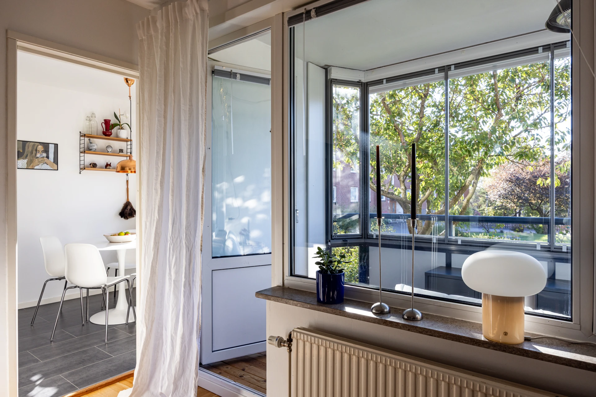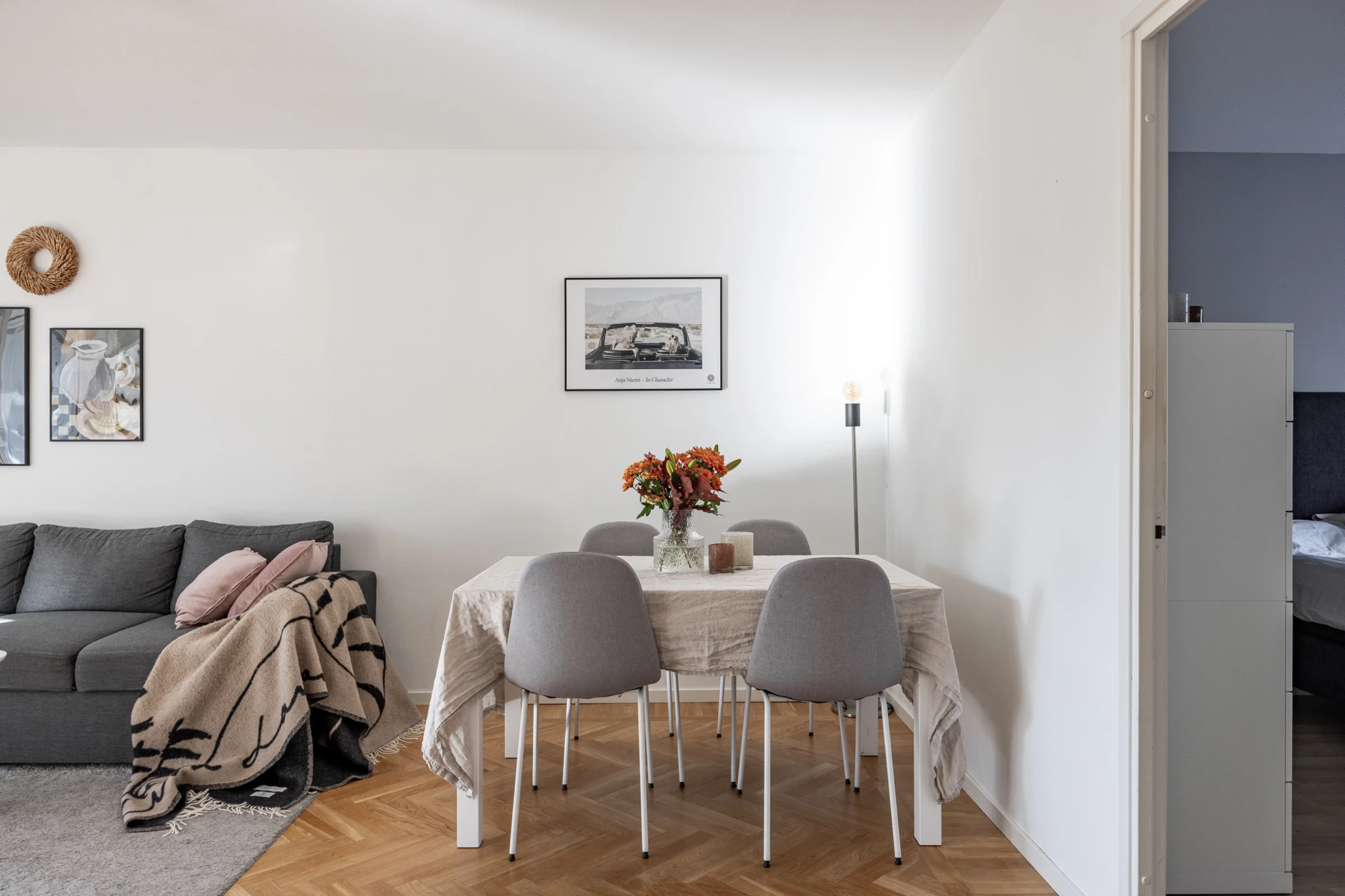 Parkettgolv och vita väggar med fönsterbänkar i natursten. Här finns plats för soffgrupp med tillhörande möblemang, matsalsbord samt skrivbord. Utgång till bostadens inglasade balkong i nordvästläge med plats för utemöbler.