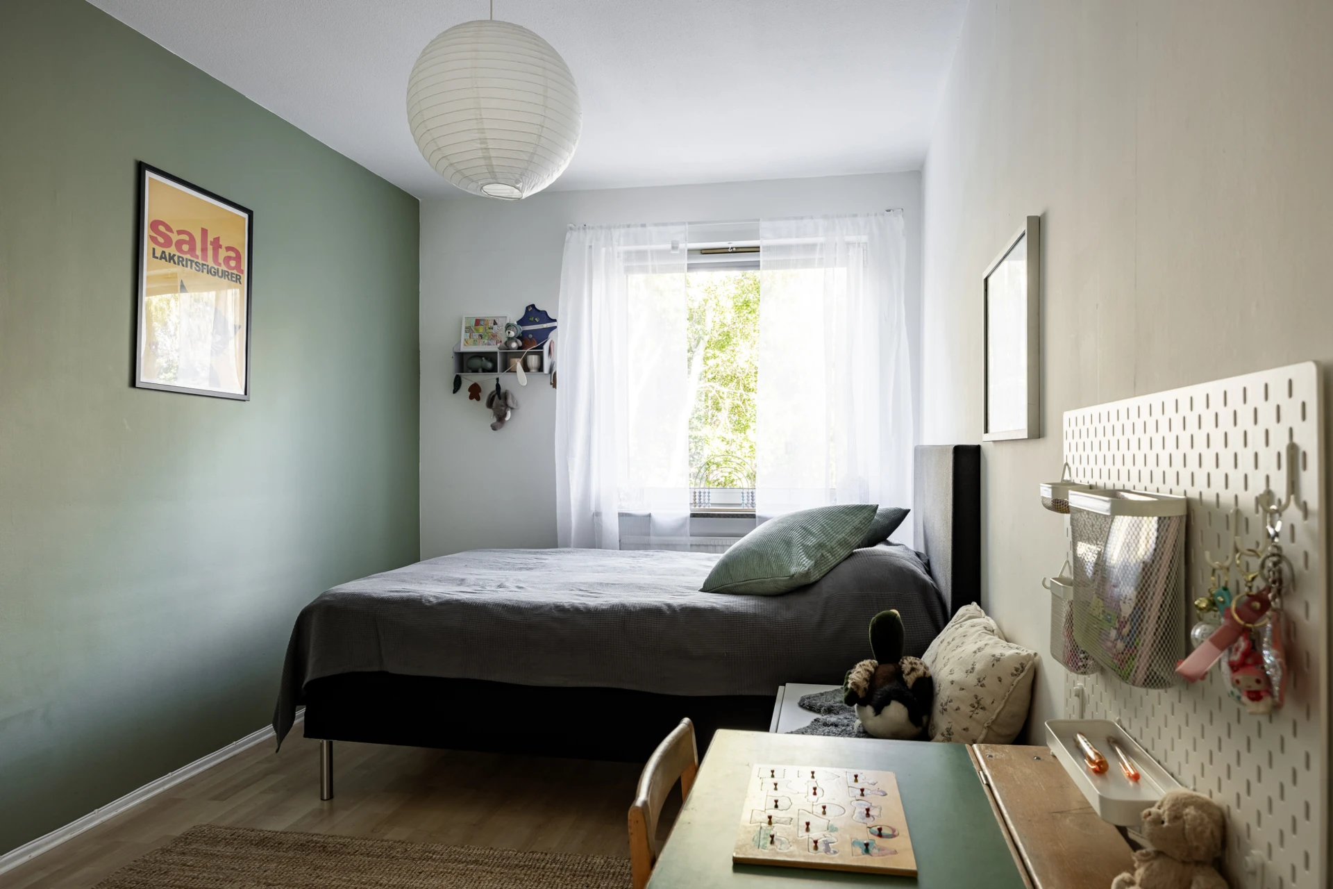 Laminatgolv och vita väggar med grön fondvägg samt fönsterbänkar i natursten. Här finns plats för enkelsäng med tillhörande möblemang.