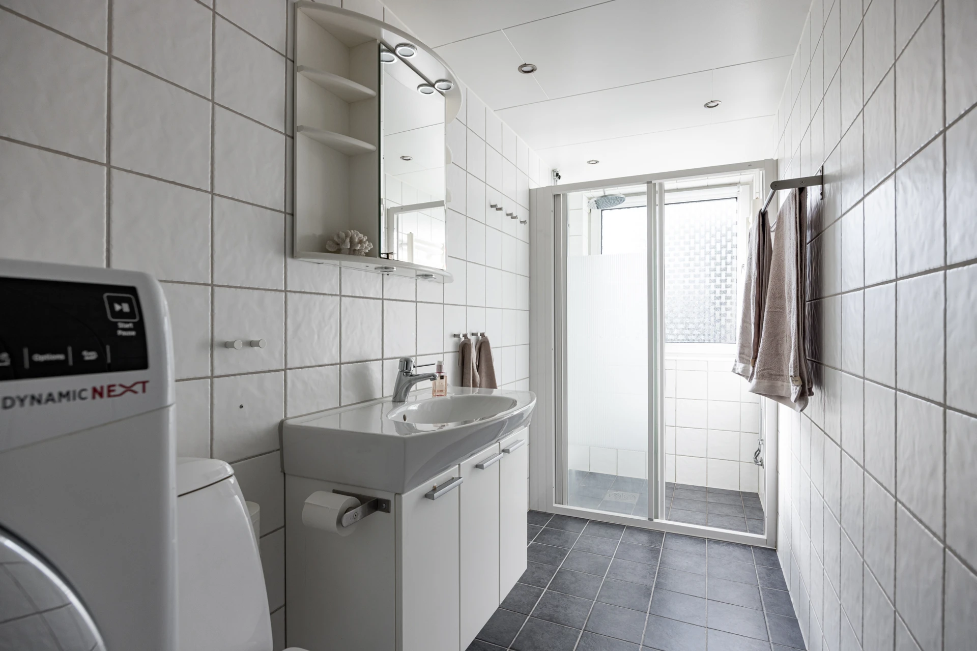 Grått klinkergolv med golvvärme och vita helkaklade väggar samt infällda spotlights med dimmer. Badrummet är utrustat med WC, handfat med kommod, spegelskåp, takdusch med skjutdörrar, handdukstork samt tvättmaskin. Ett fönster för vädringsmöjligheter och ljusinsläpp.