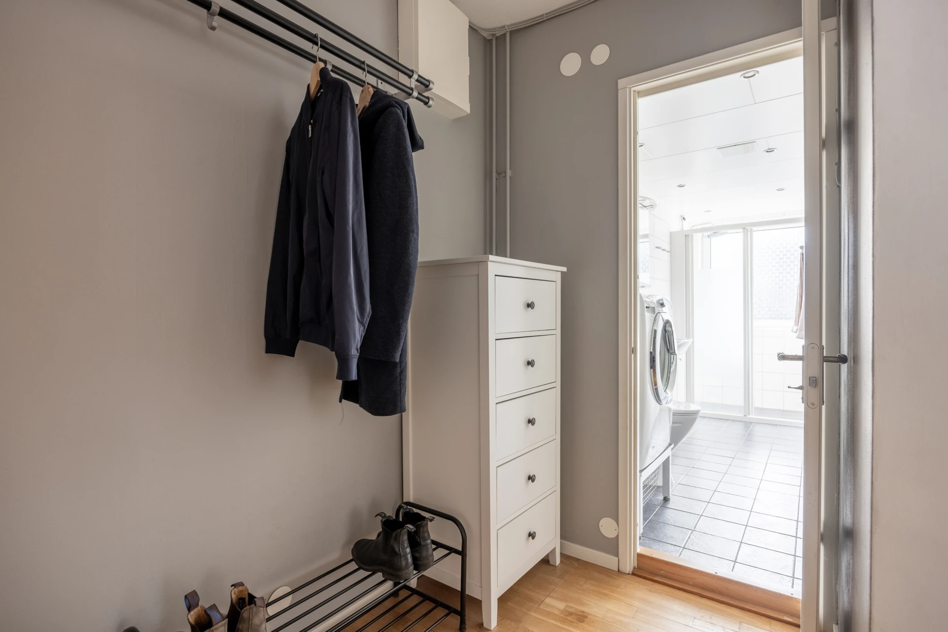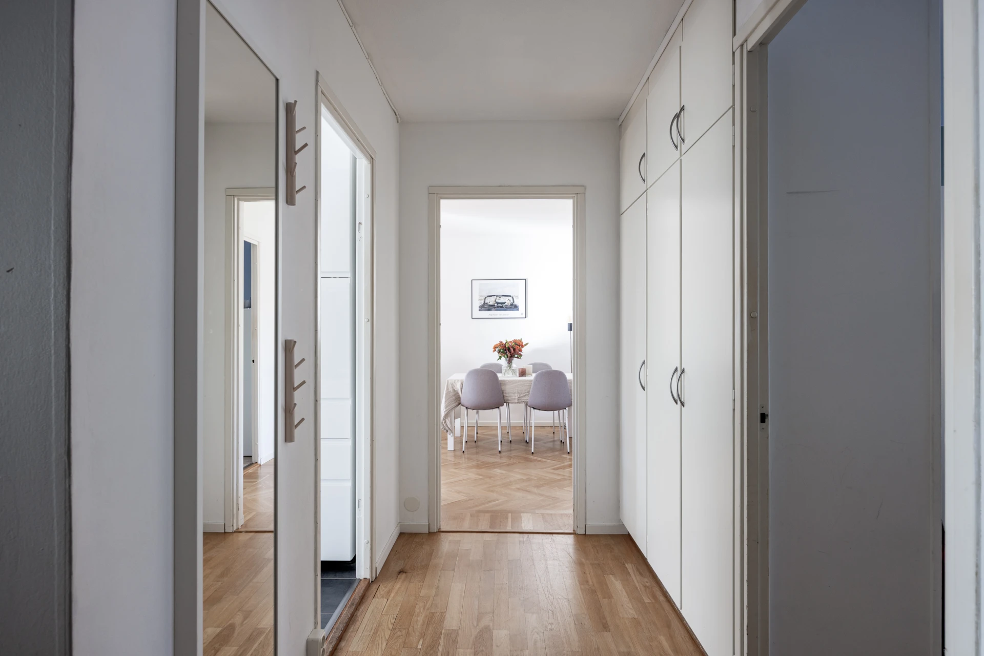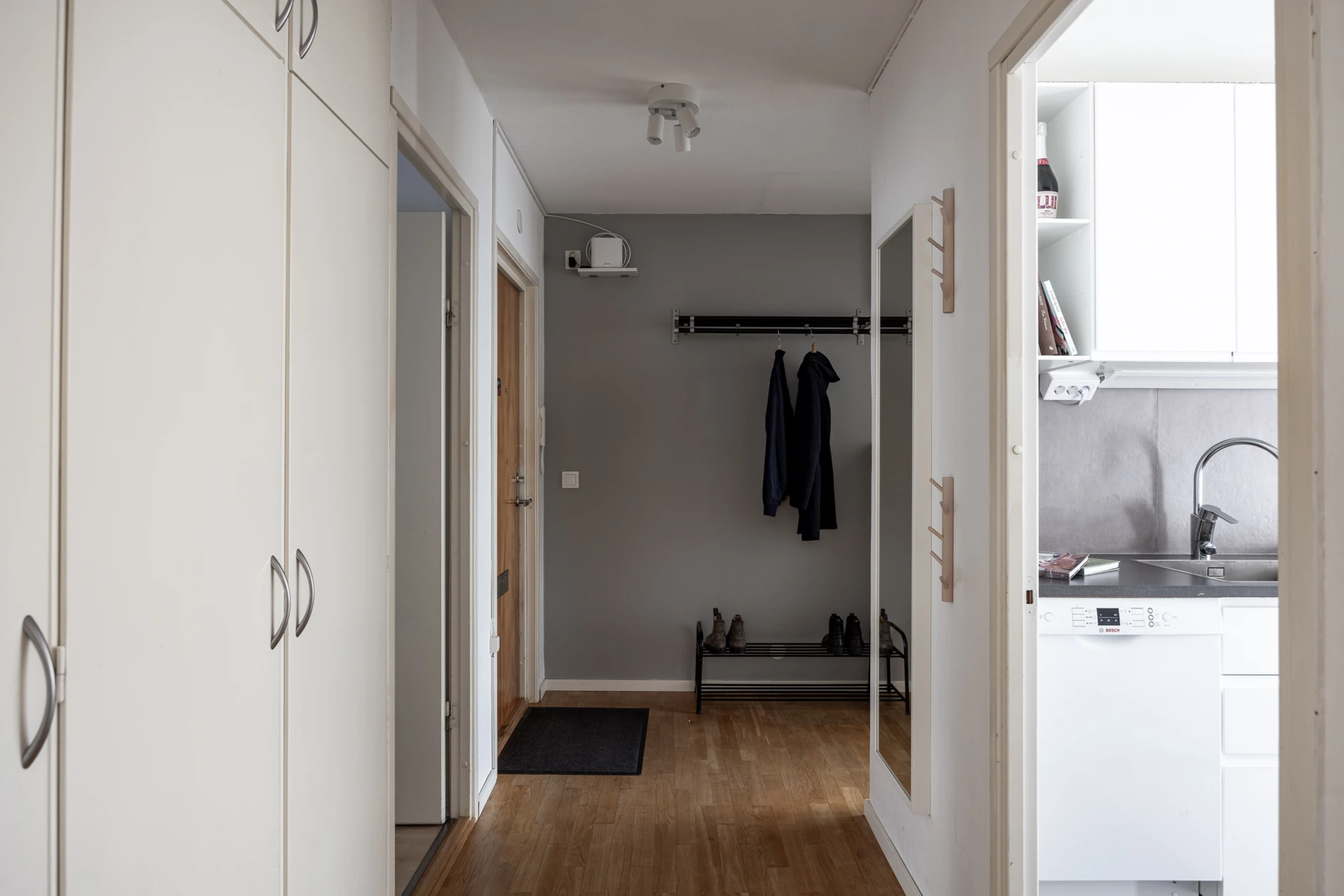Parkettgolv och vita/grå väggar. Här finns plats för avhängning och förvaring i tre inbyggda garderober varav ett städskåp.