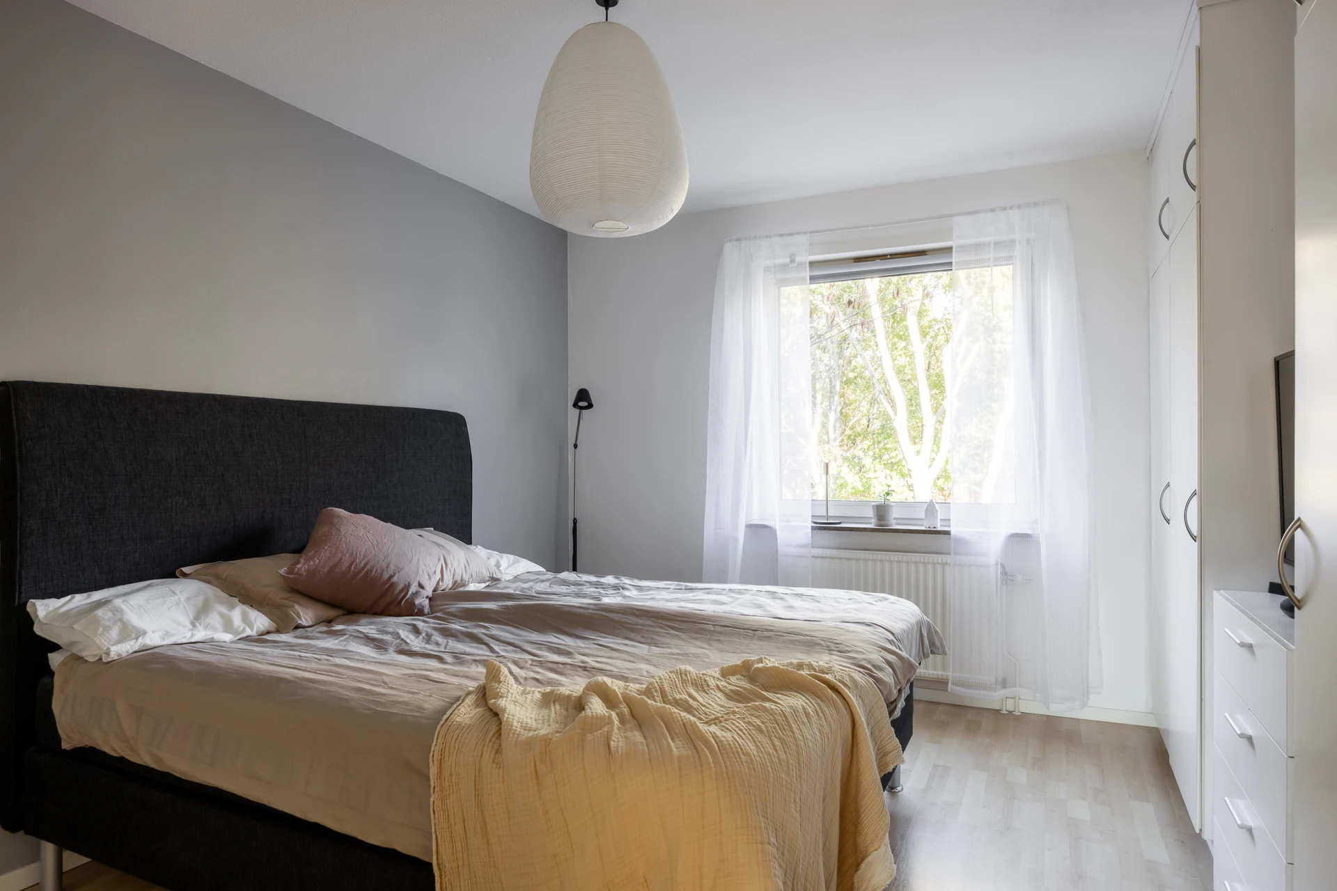 Laminatgolv och vita väggar med grå fondvägg samt fönsterbänkar i natursten. Här finns plats för dubbelsäng med tillhörande möblemang. Förvaring i fem inbyggda garderober varav ett linneskåp.