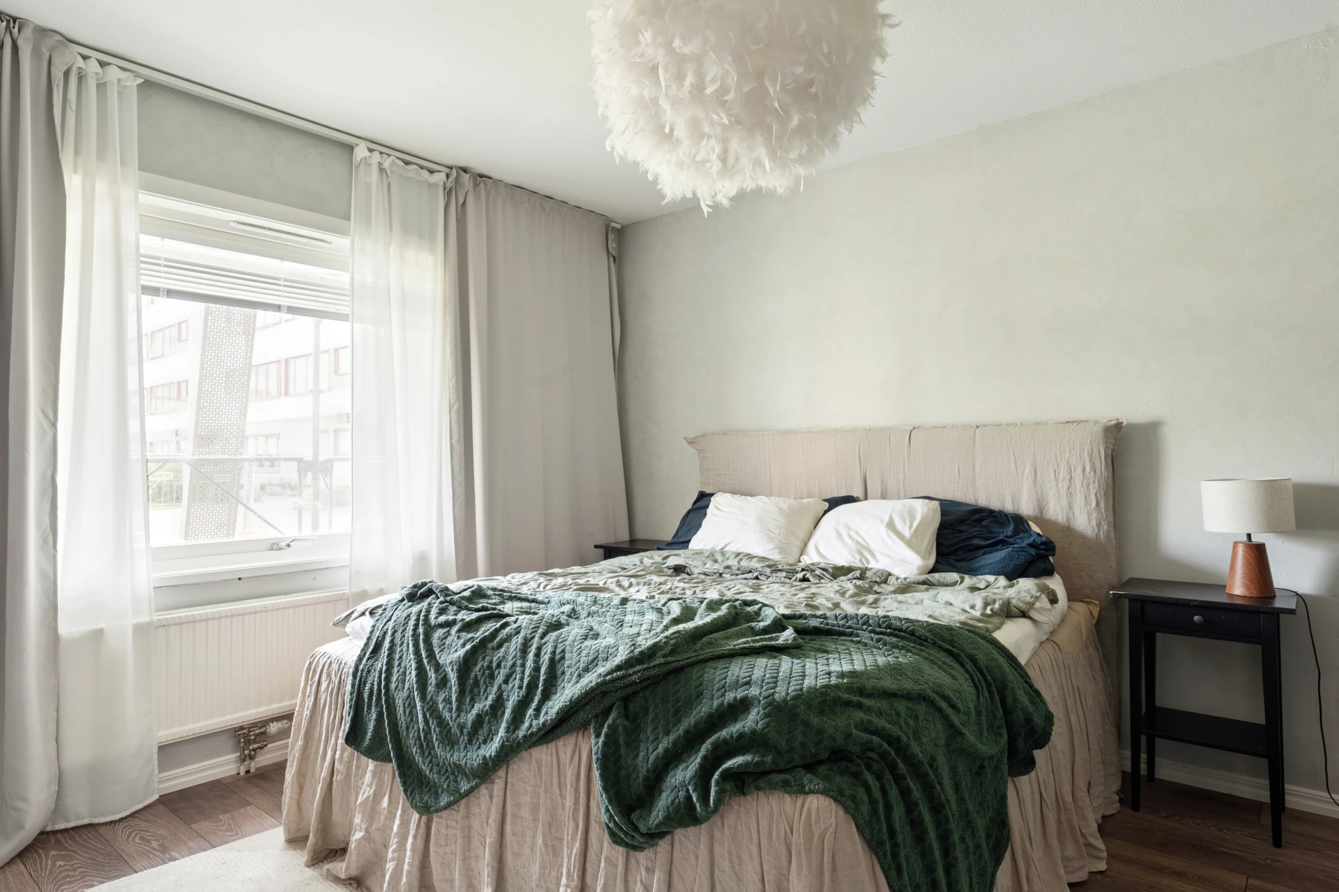 Laminatgolv och målade väggar. Här finns plats för dubbelsäng med tillhörande möblemang. Förvaring sker i en platsbyggd hyllsystem längst med väggen.