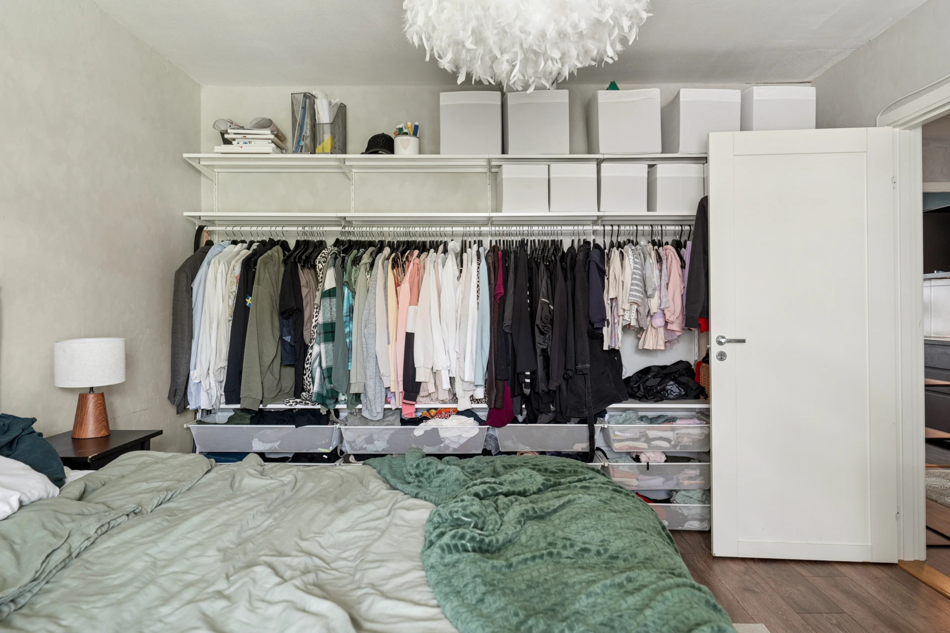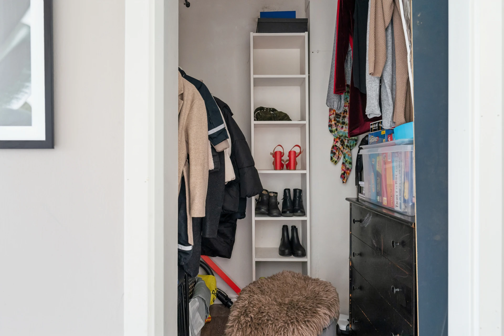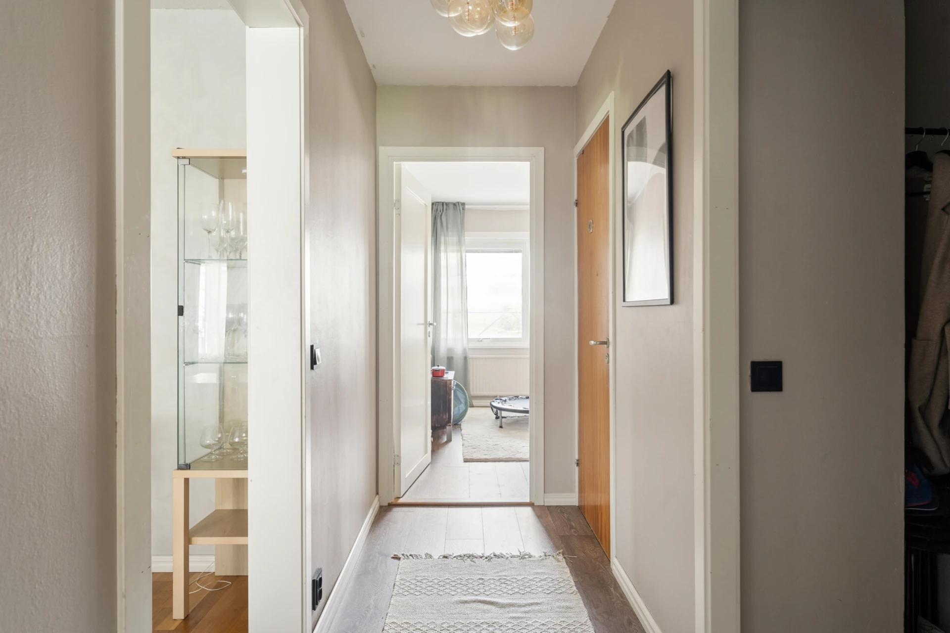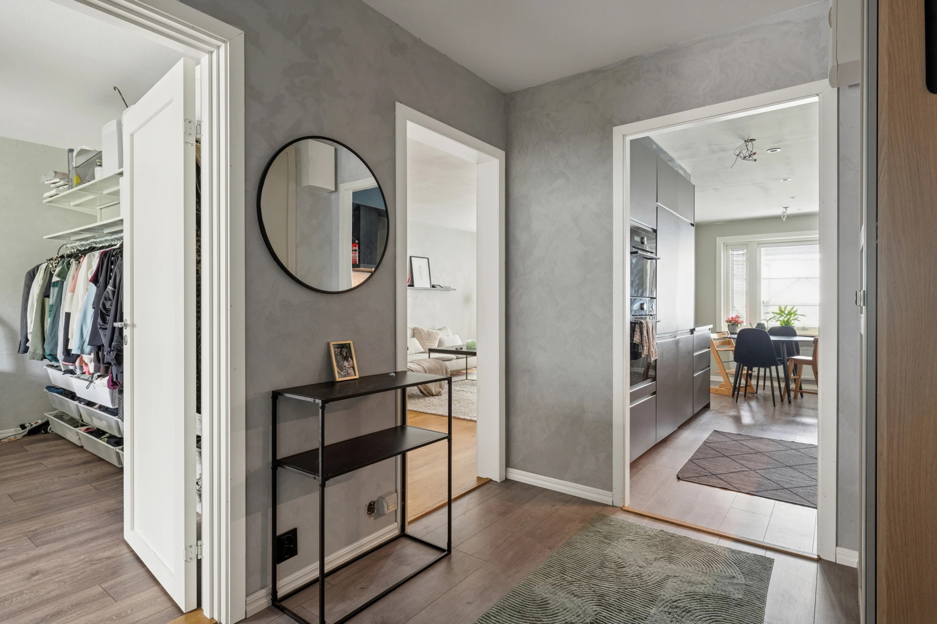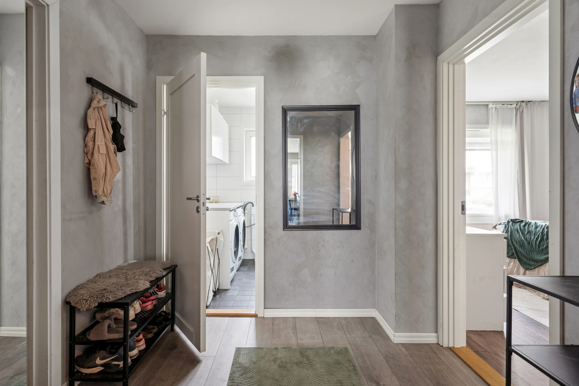 Laminatgolv samt målade väggar. Här finns plats för avhängning och förvaring i en garderob.