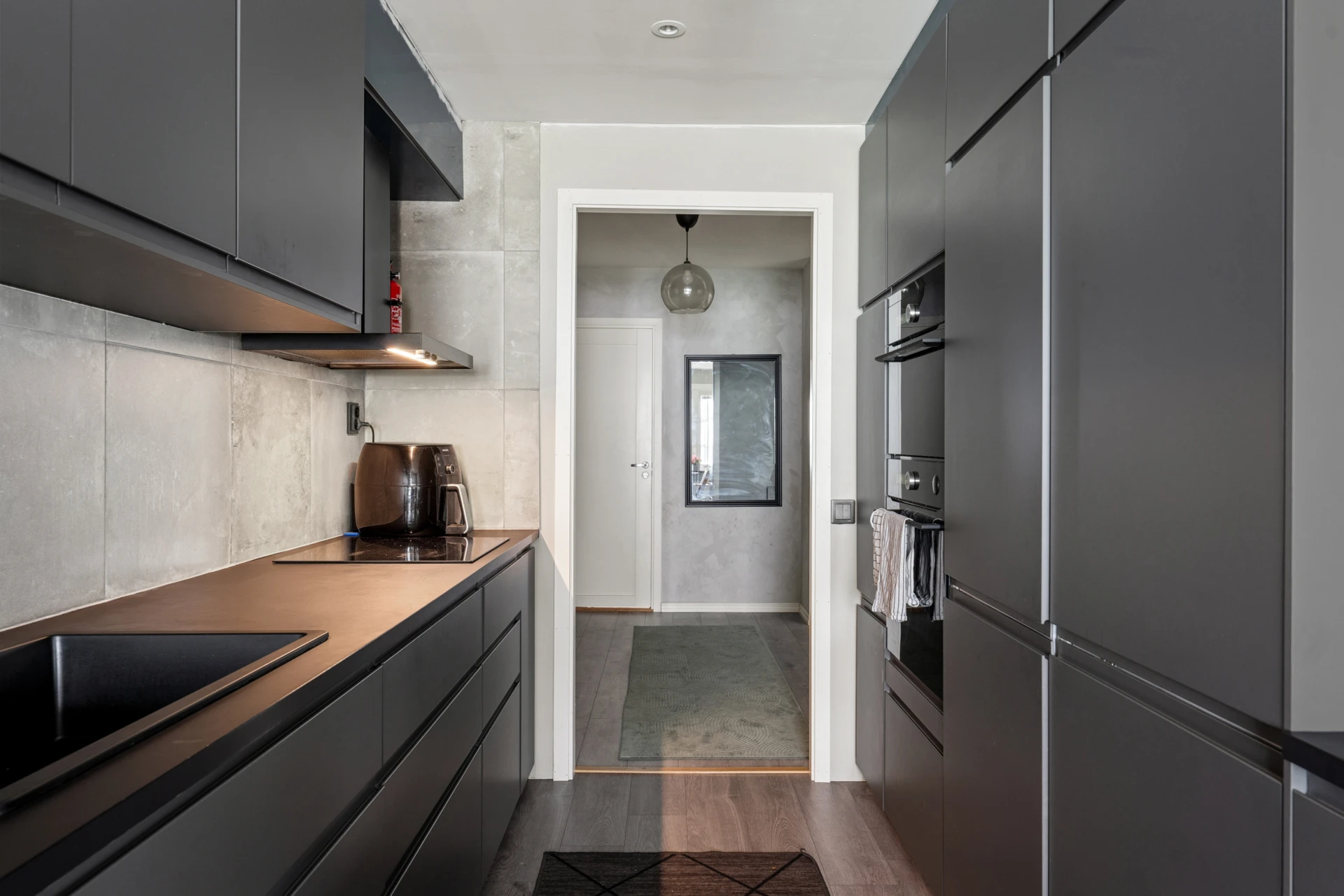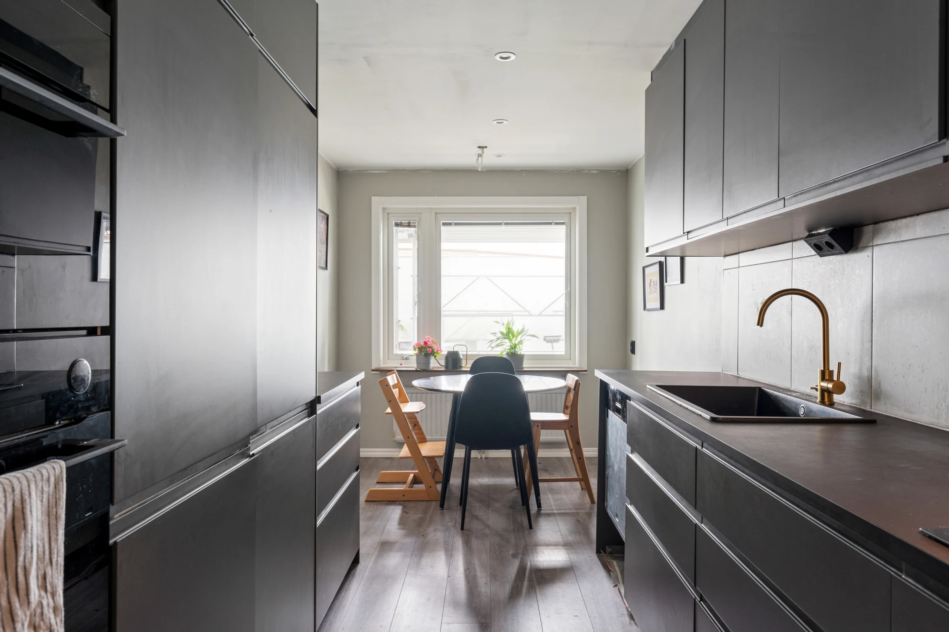 Laminatgolv och målade väggar. Köksinredning i svart och ovan bänkskivan i laminat sitter stänkskydd. Köket är utrustat med kyl och frys i fullhöjd, inbyggd mikro, diskmaskin, inbyggd varmluftsugn med fukt samt fläkt. Inbyggt skafferi. Köket är från IKEA Voxtorp, maskinparken är från Electrolux, blandaren från Tapwell. Matplats för ca 4-6 personer. Belysning genom spottar i taket.