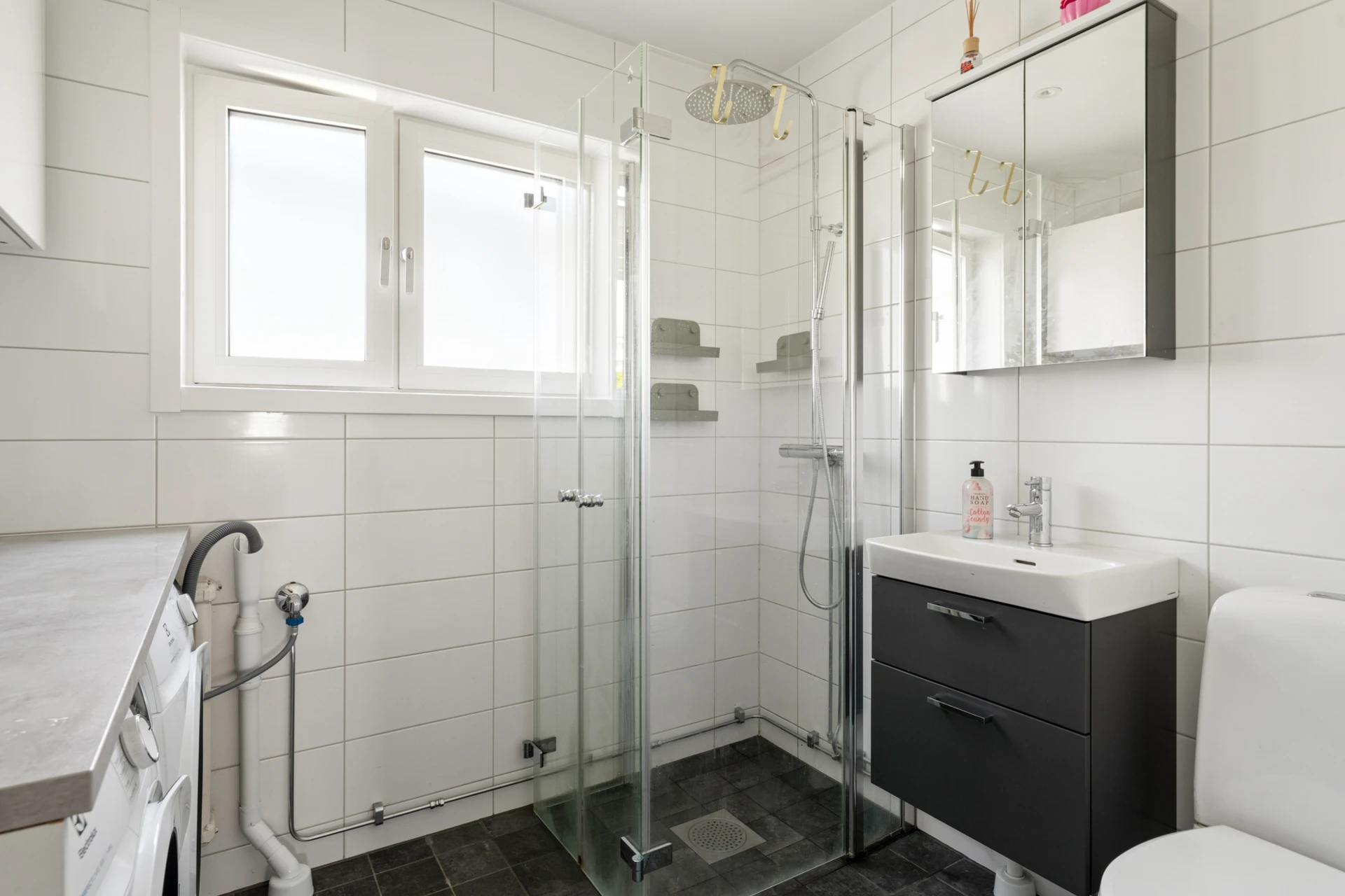 Klinkergolv i mörk nyans och vita helkaklade väggar. Badrummet är utrustat med WC, takdusch med vikbara glasdörrar, handfat med kommod, spegel, handdukstork, vägghängt förvaringsskåp, avlastningsbänk samt tvättmaskin och torktumlare (Electrolux). Belysning genom spottar i taket.