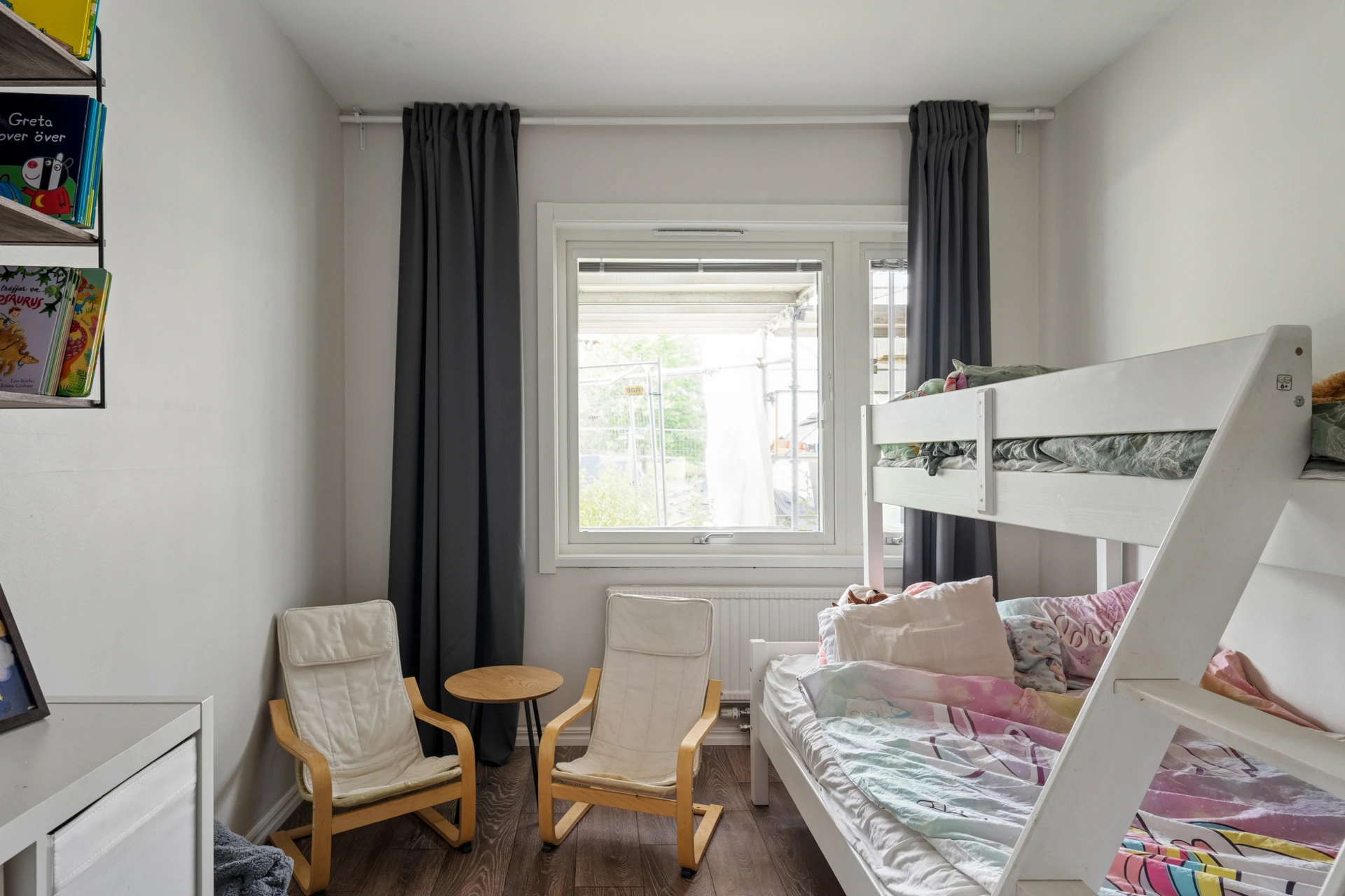 Laminatgolv och målade väggar. Här finns plats för säng och skrivbord med tillhörande möblemang.