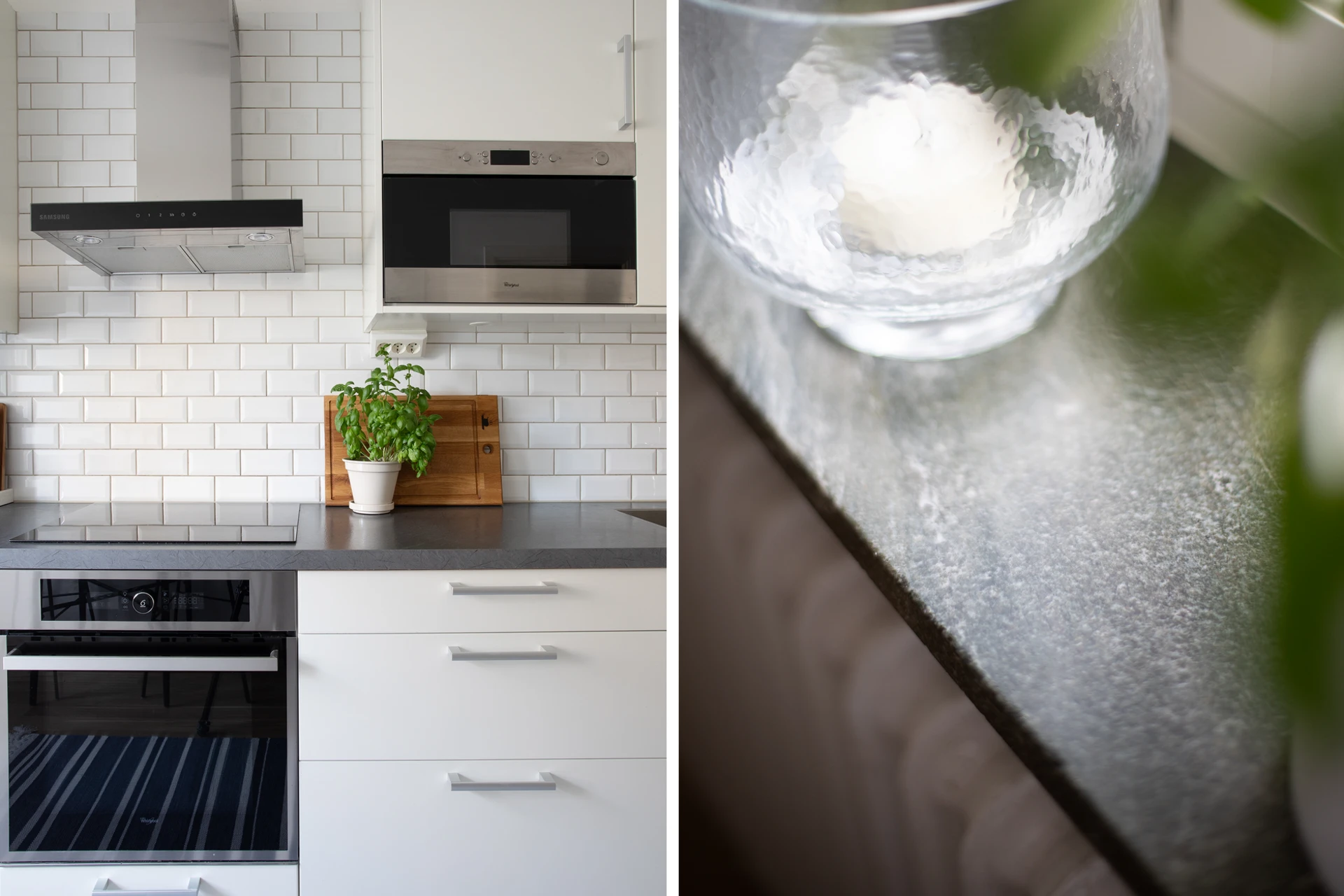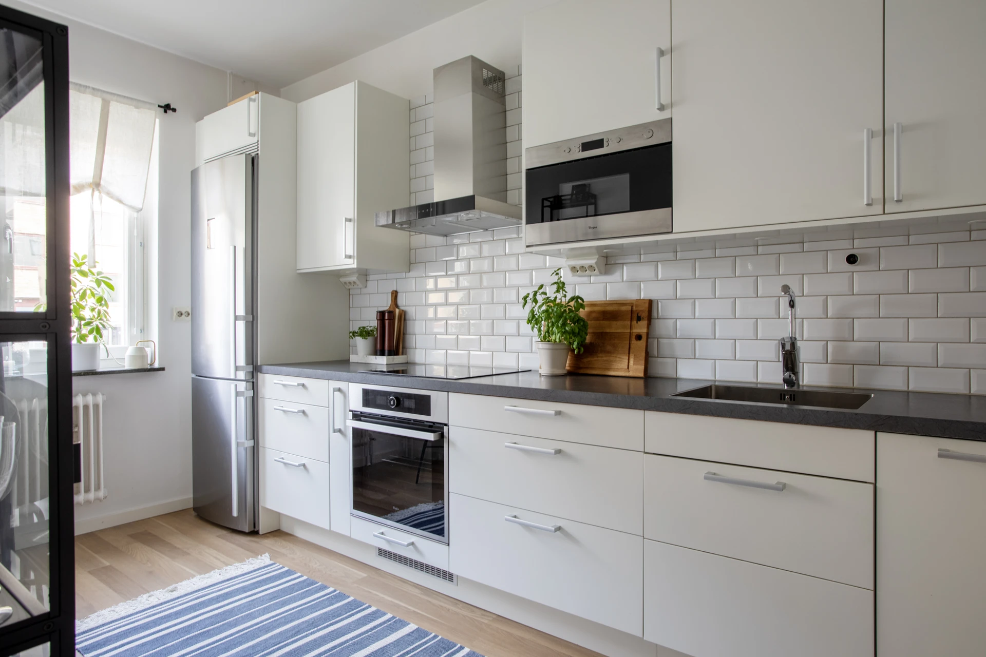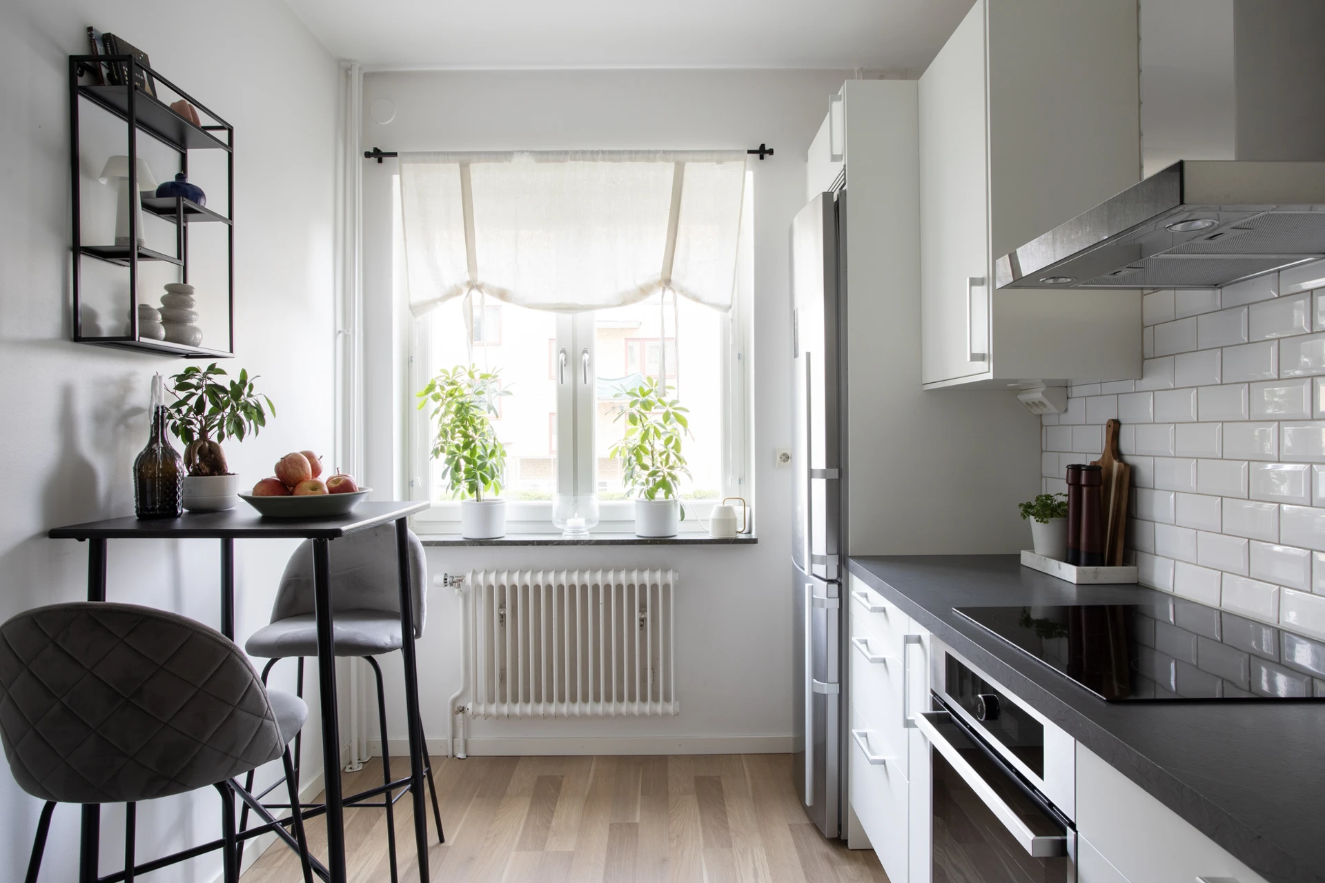• Det uppdaterade köket är både stilrent och praktiskt, med gott om arbetsyta och förvaring samt plats för ett matbord intill fönstret – en naturlig plats för både vardag och helg. Vardagsrummet erbjuder gott om utrymme för möblering med både soffgrupp och matbord.
