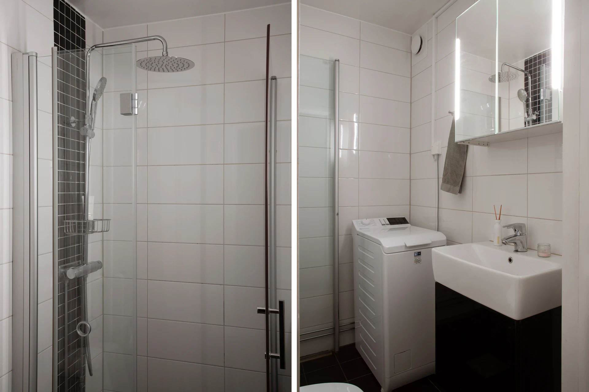 • Sovrummet är lugnt och rofyllt med plats för garderober som ger smidig förvaring. I anslutning till hallen finns dessutom en väl tilltagen klädkammare – ett stort plus för dig som vill ha extra utrymme utan att kompromissa med ytan. Badrummet är helkaklat i klassisk stil och utrustat med både dusch och tvättmaskin.