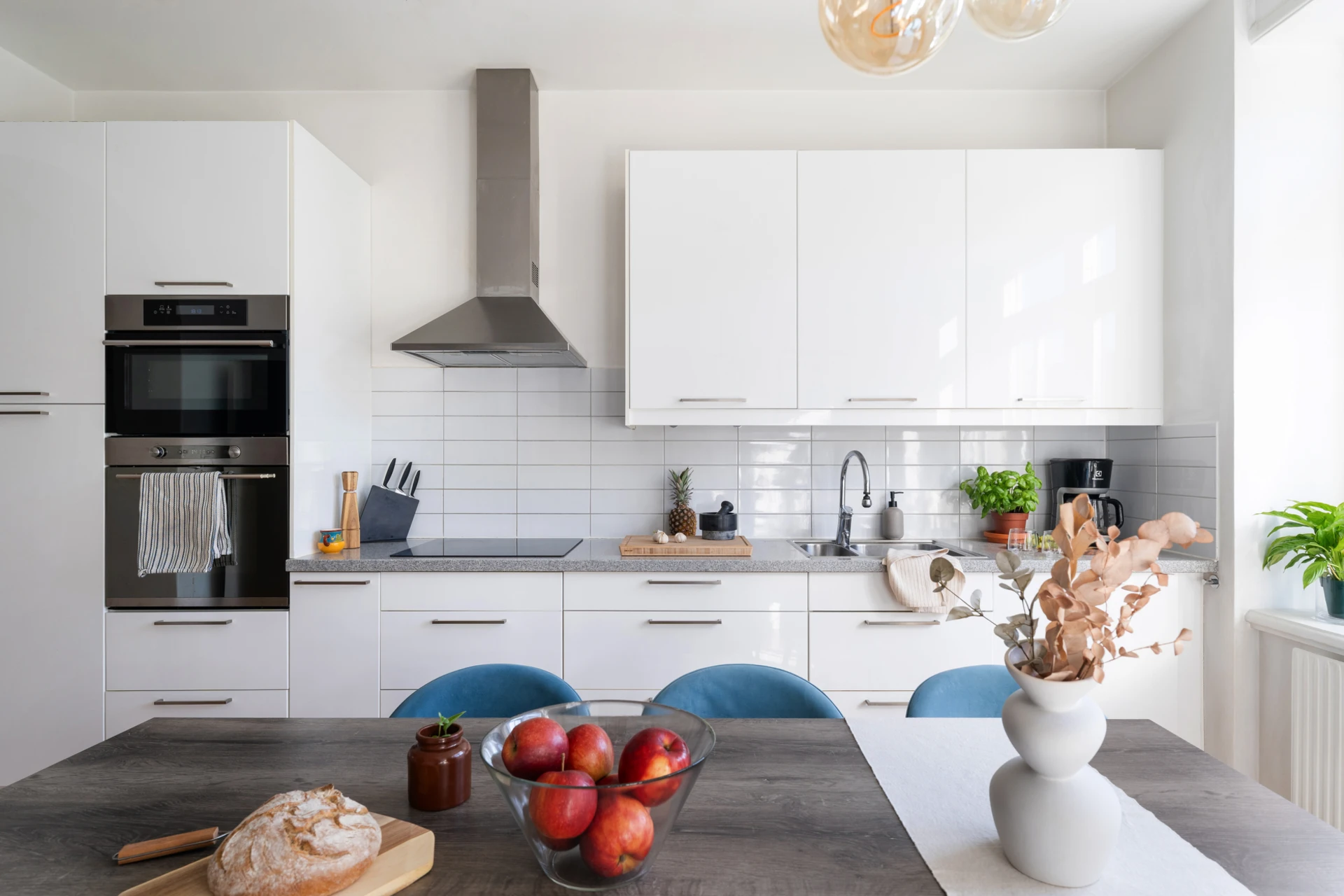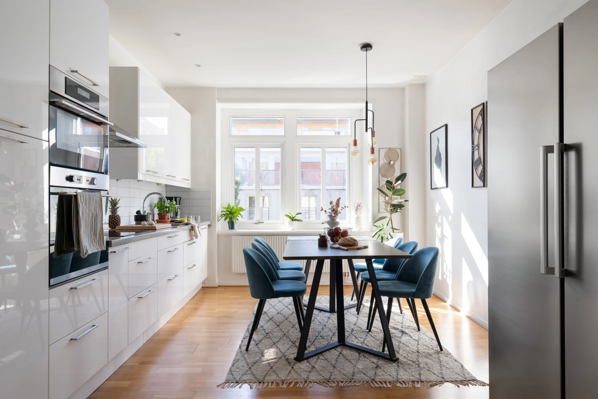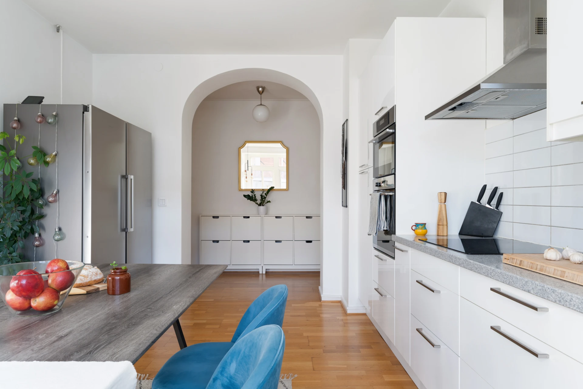 Ekparkett och vitmålade väggar. Köksinredning i vitt med släta luckor och ovan bänkskivan i grå sten sitter vitt kakel. Gott om förvaring i både bänk- och väggskåp samt ett skafferi. Den maskinella utrustningen består av varmluftsugn och mikro i högskåp, integrerad diskmaskin, induktionshäll, vägghängd köksfläkt samt kyl och frys med ismaskin. Samtliga vitvaror är i rostfritt utförande. Plats för stort matsalsbord.