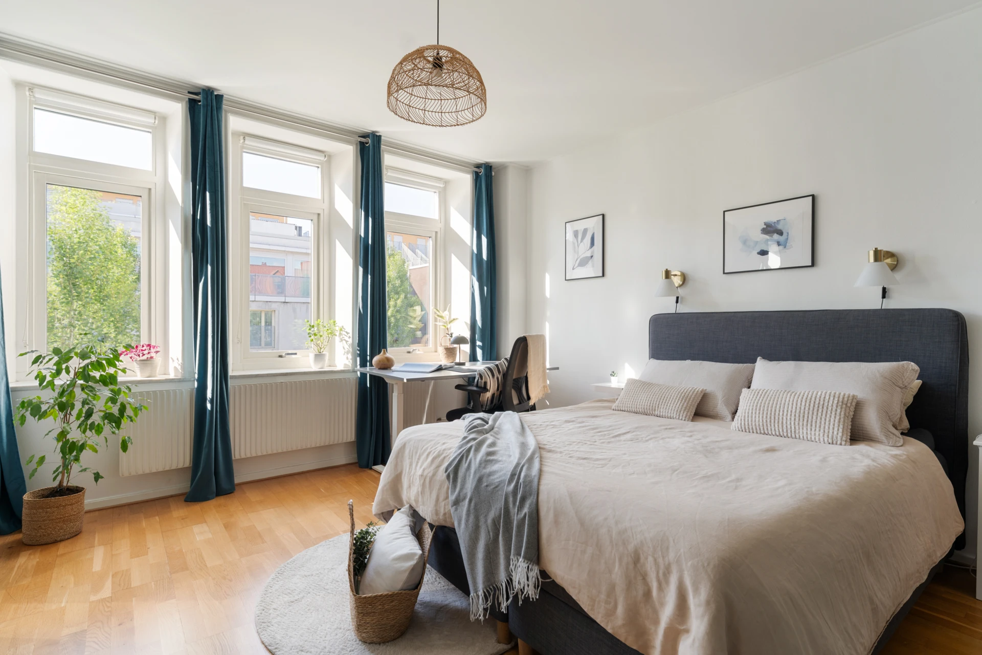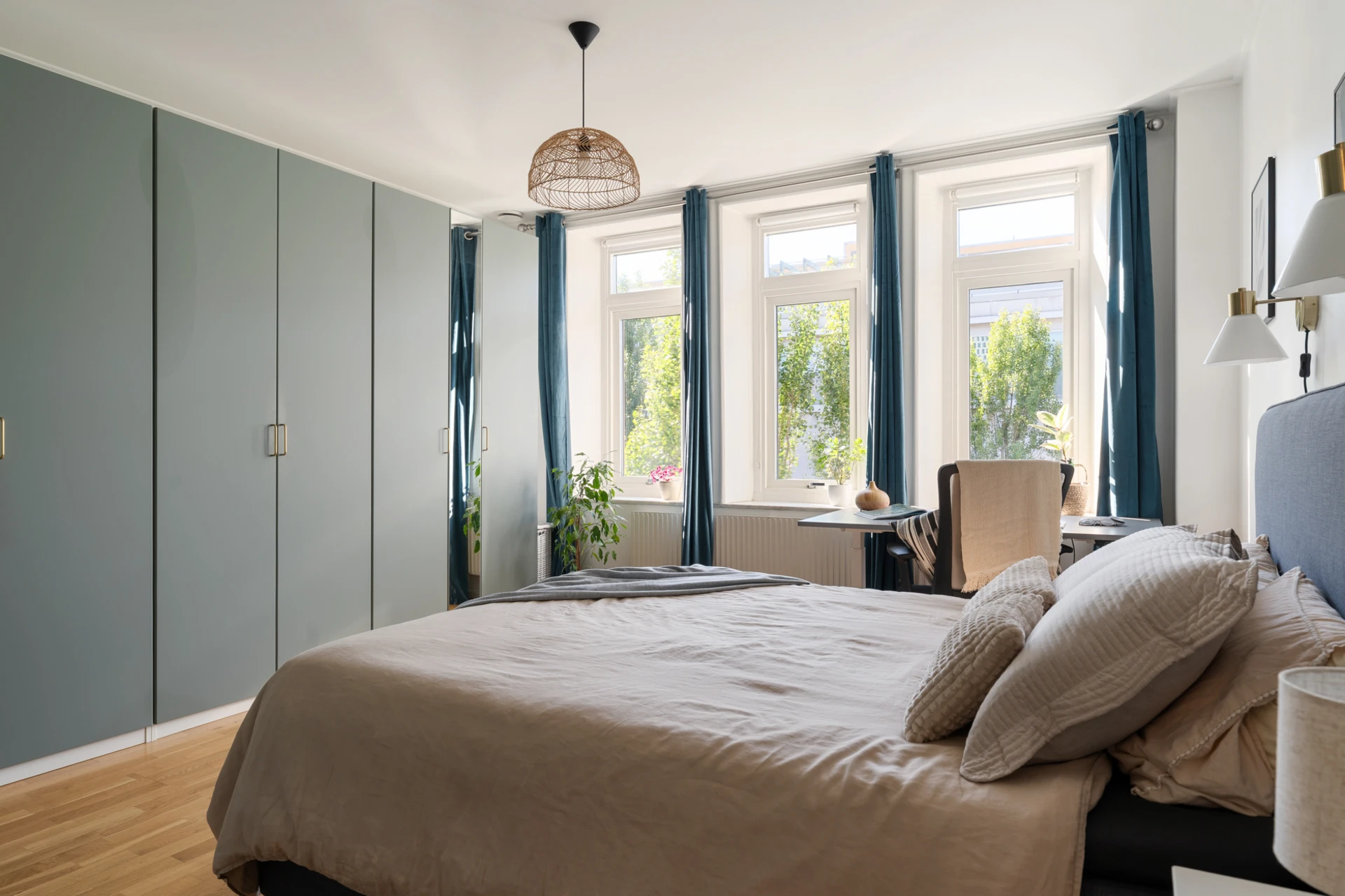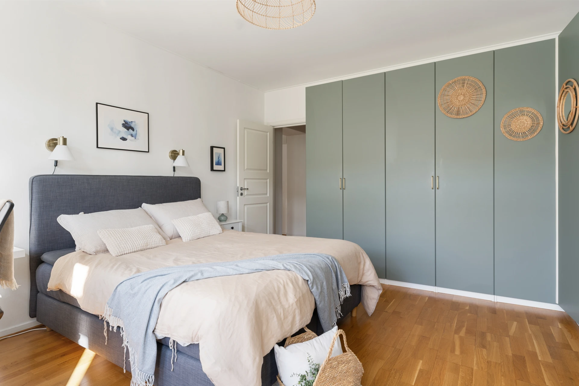 Ekparkett och vitmålade väggar med stora härliga fönsterpartier. Rummet rymmer en dubbelsäng med tillhörande sängbord. Förvaring finns i flertalet platsbyggda garderober.