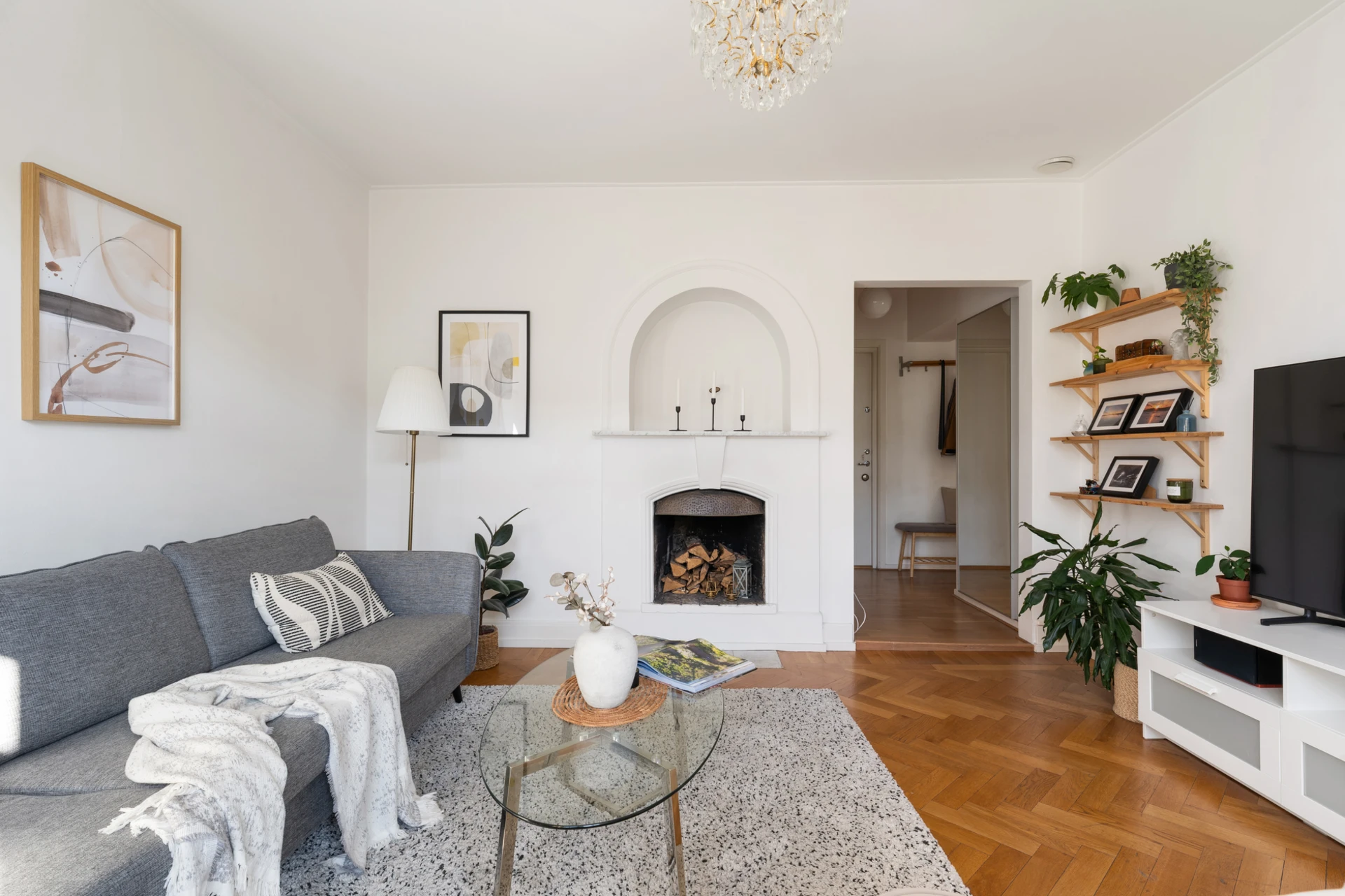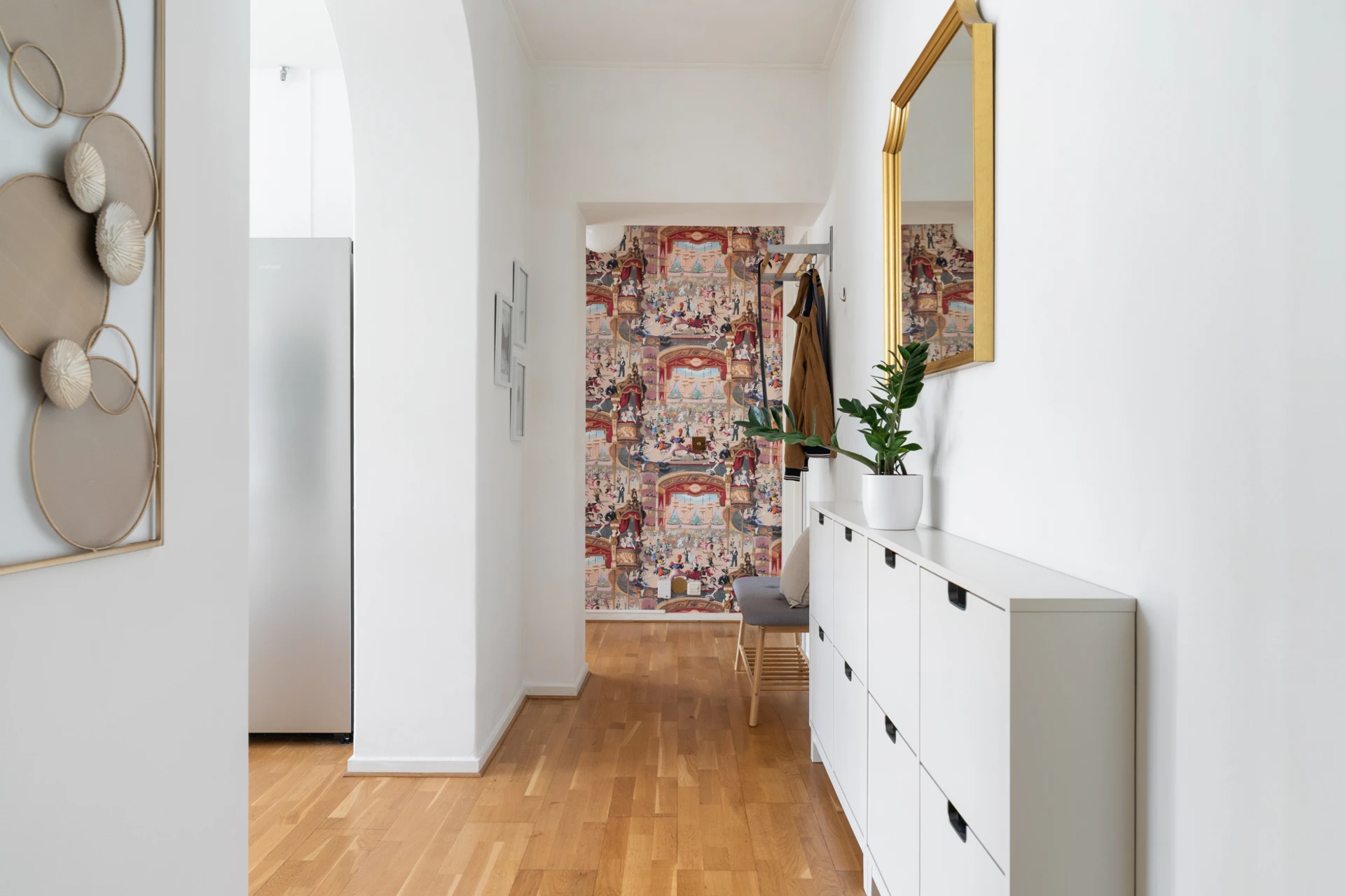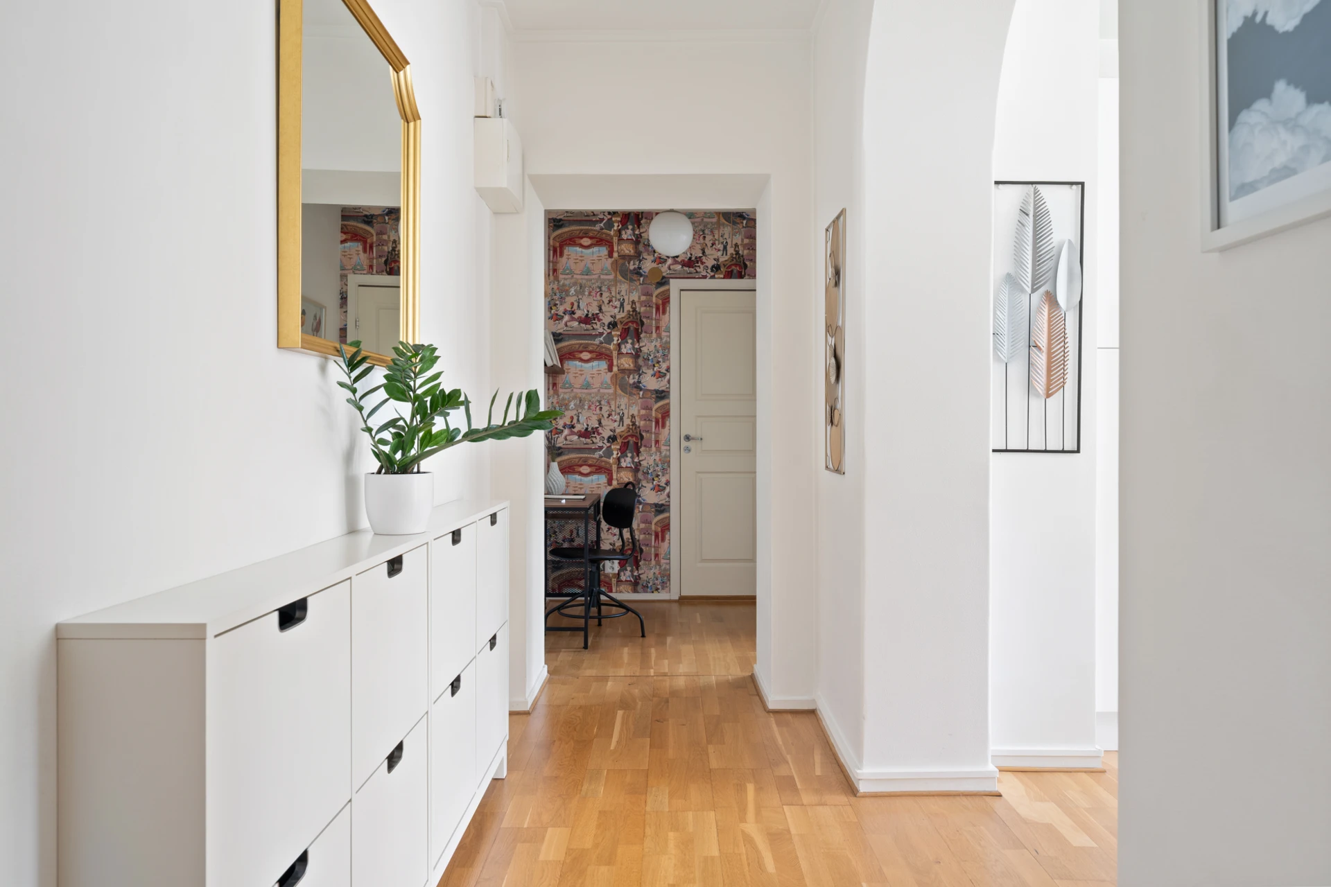 Ekparkett och vitmålade väggar samt tapetserad fondvägg. Möblerbar hall med plats för avhängning av ytterkläder.