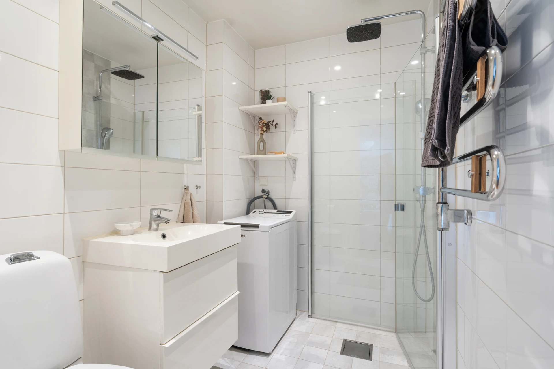 Ljusgrått klinkergolv och helkaklade väggar i vitt. Badrumsinredningen består av WC, handfat med kommod, spegelskåp, takdusch med glasvägg samt tvättmaskin.