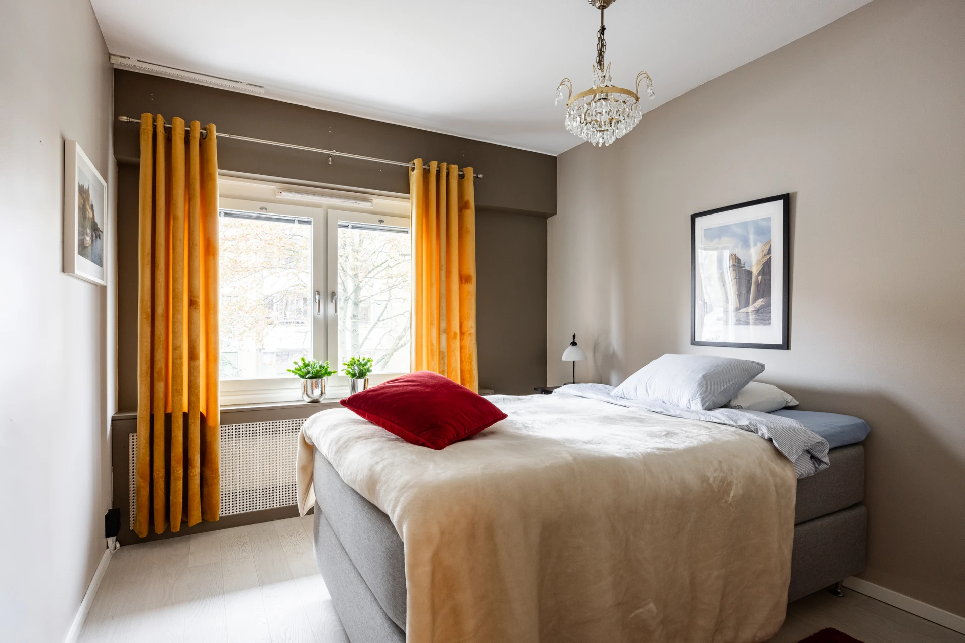 Parkettgolv och väggar i beigebrun kulör samt en mörkare fondvägg vid fönstret. Plats för dubbelsäng och förvaringsmöbel. Platsbyggt elementskydd. Belysningen kan justeras med dimmer. Plejd smart-belysning.
