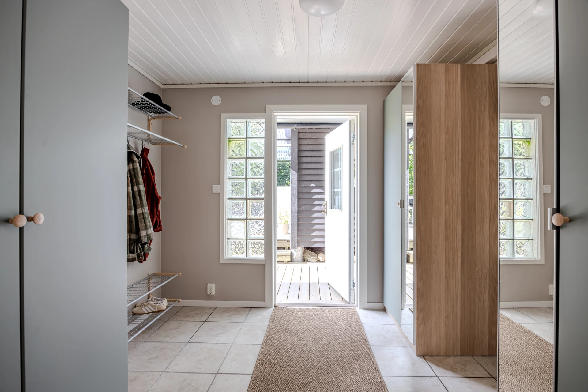 Klinkergolv och väggar i grålila. Här finns plats för avhängning och förvaring sker i två garderober. Här finns även ett frostat fönster som släpper in ljus men samtidigt förhindrar insyn. Stor hall med gott om förvaring.