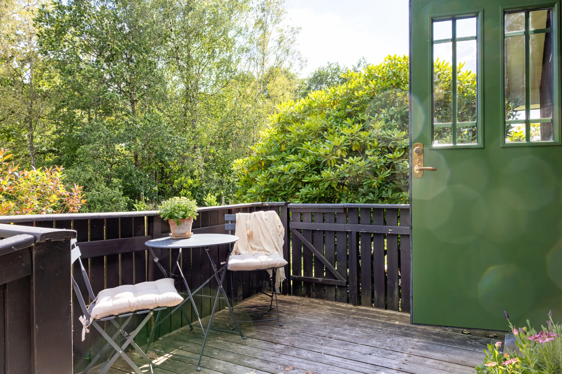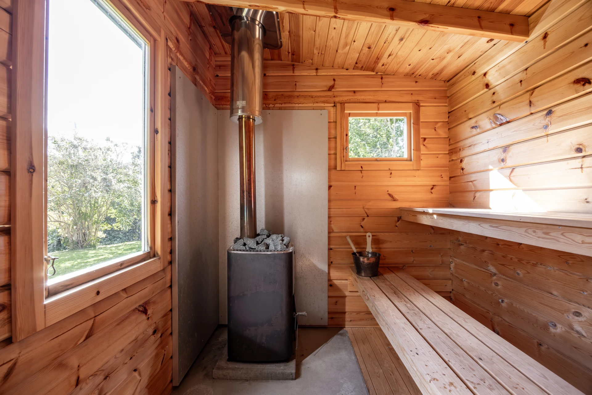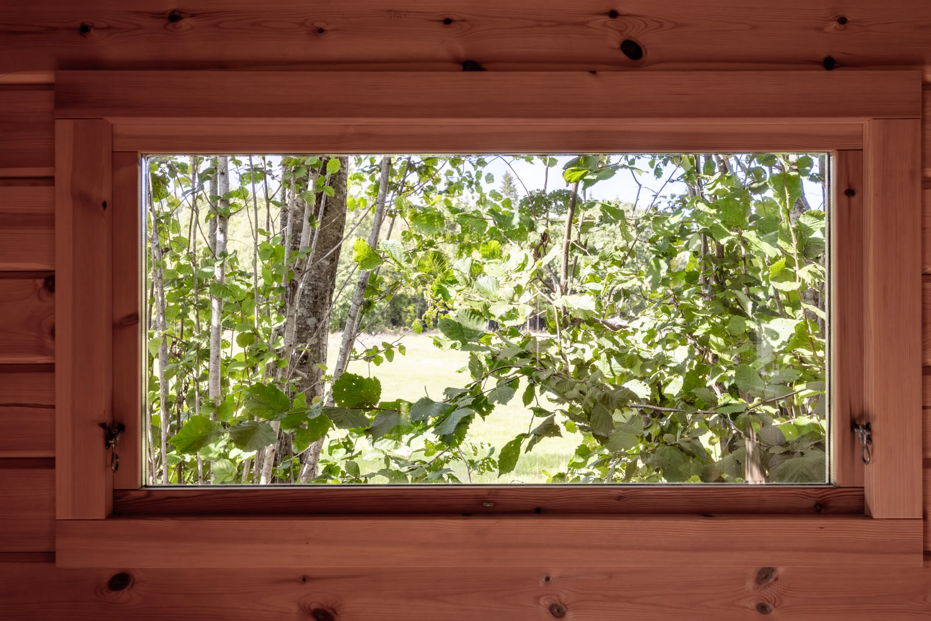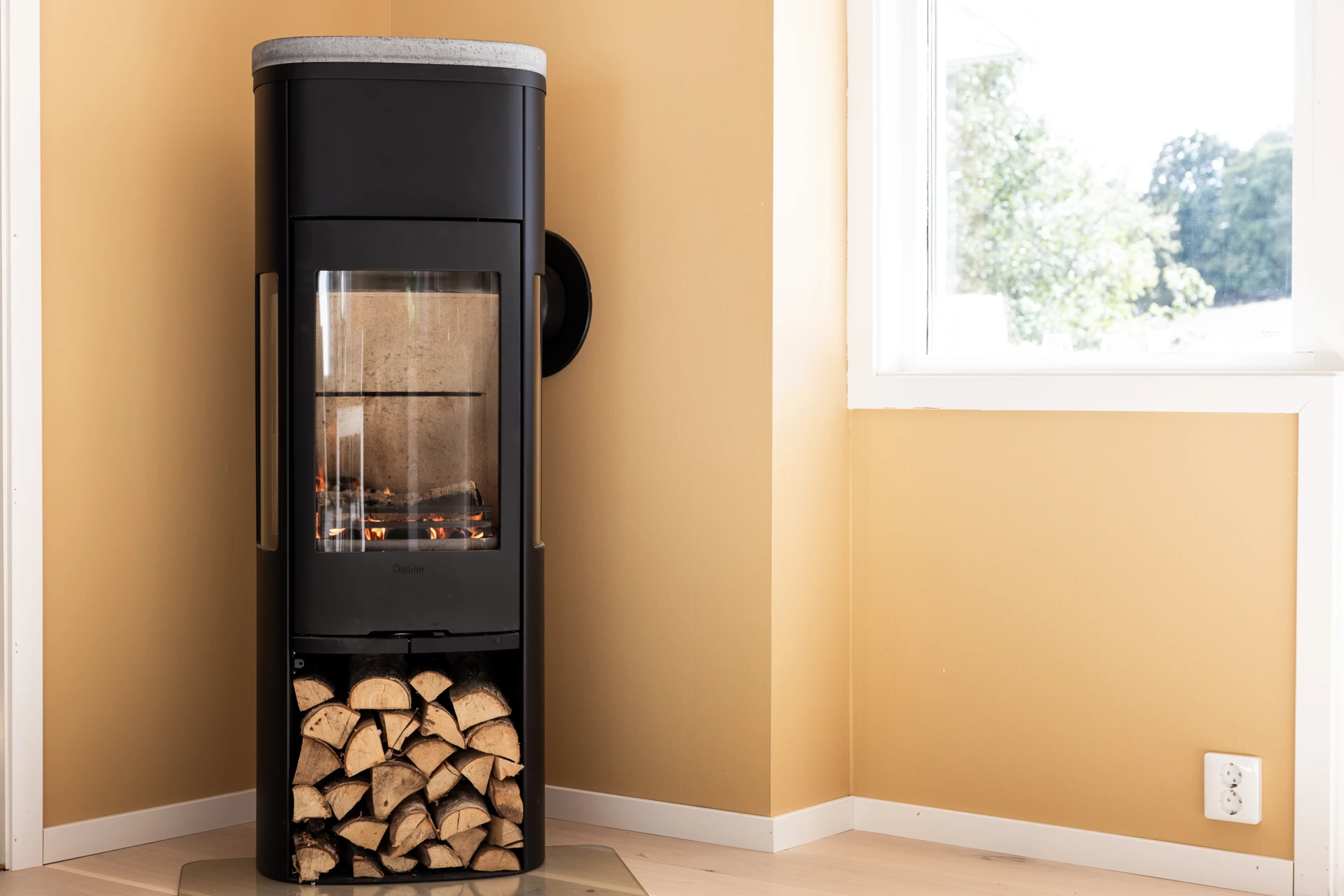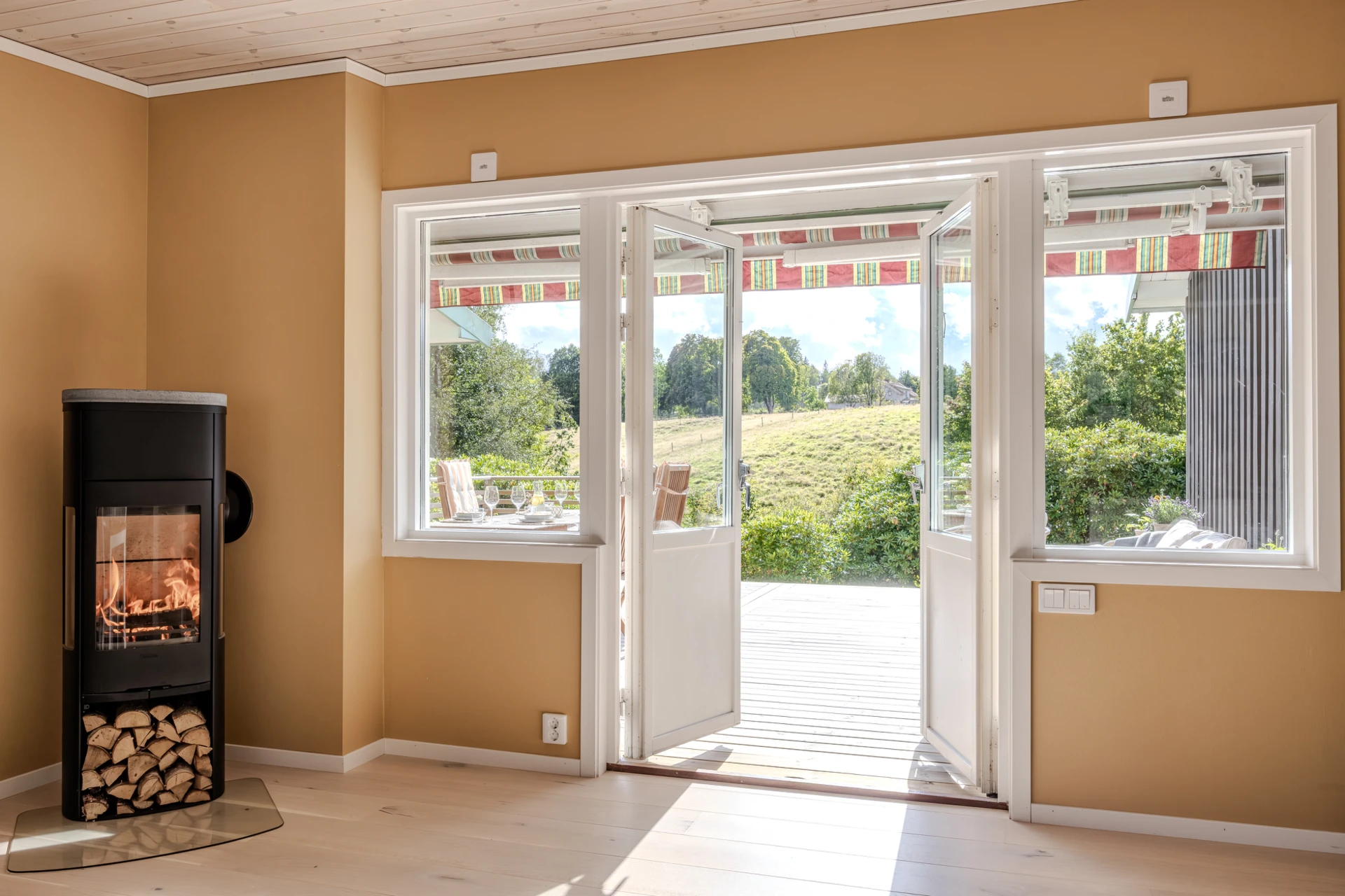 Vedeldad kamin med sittplatser och rofylld utsikt.