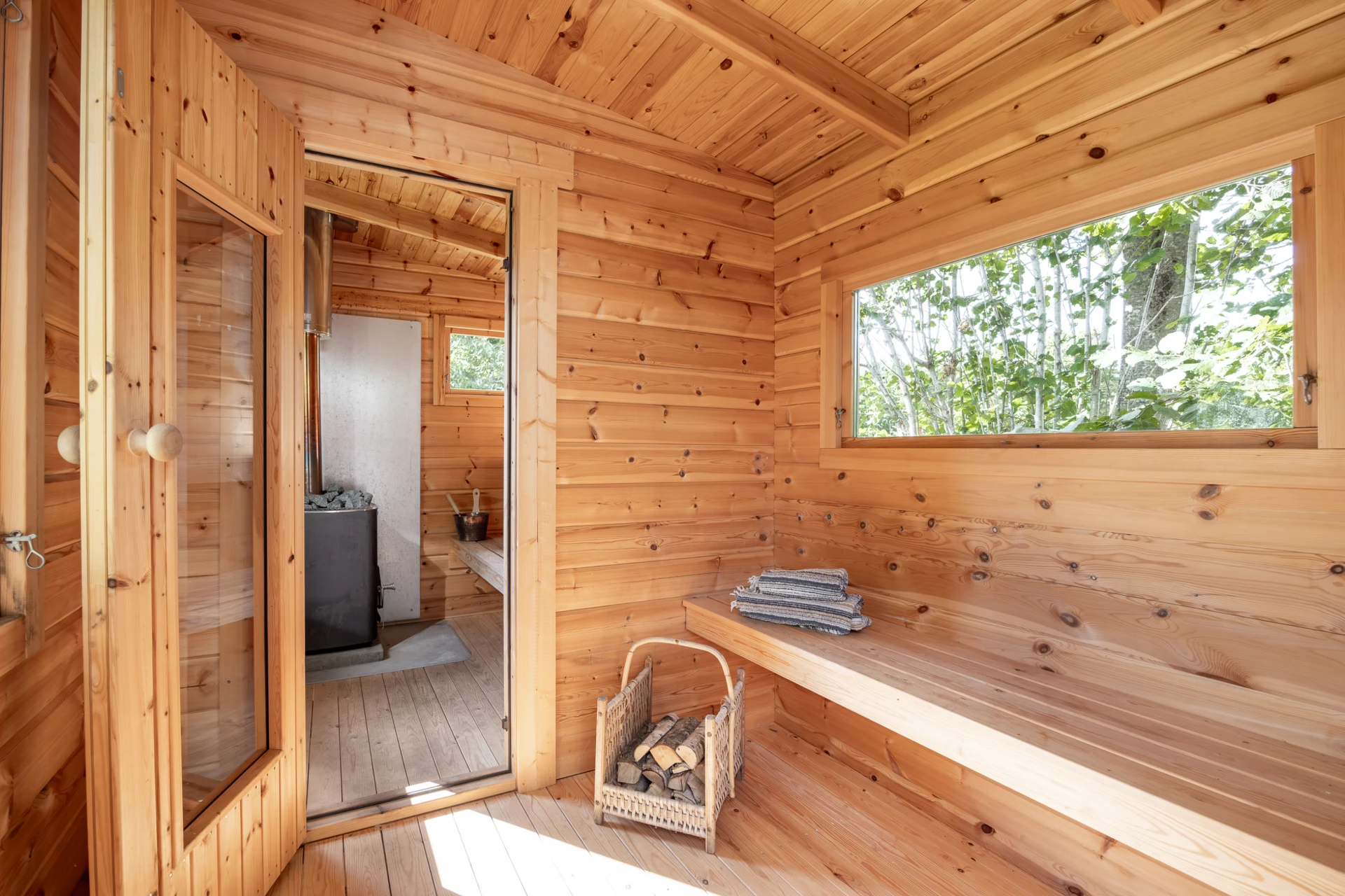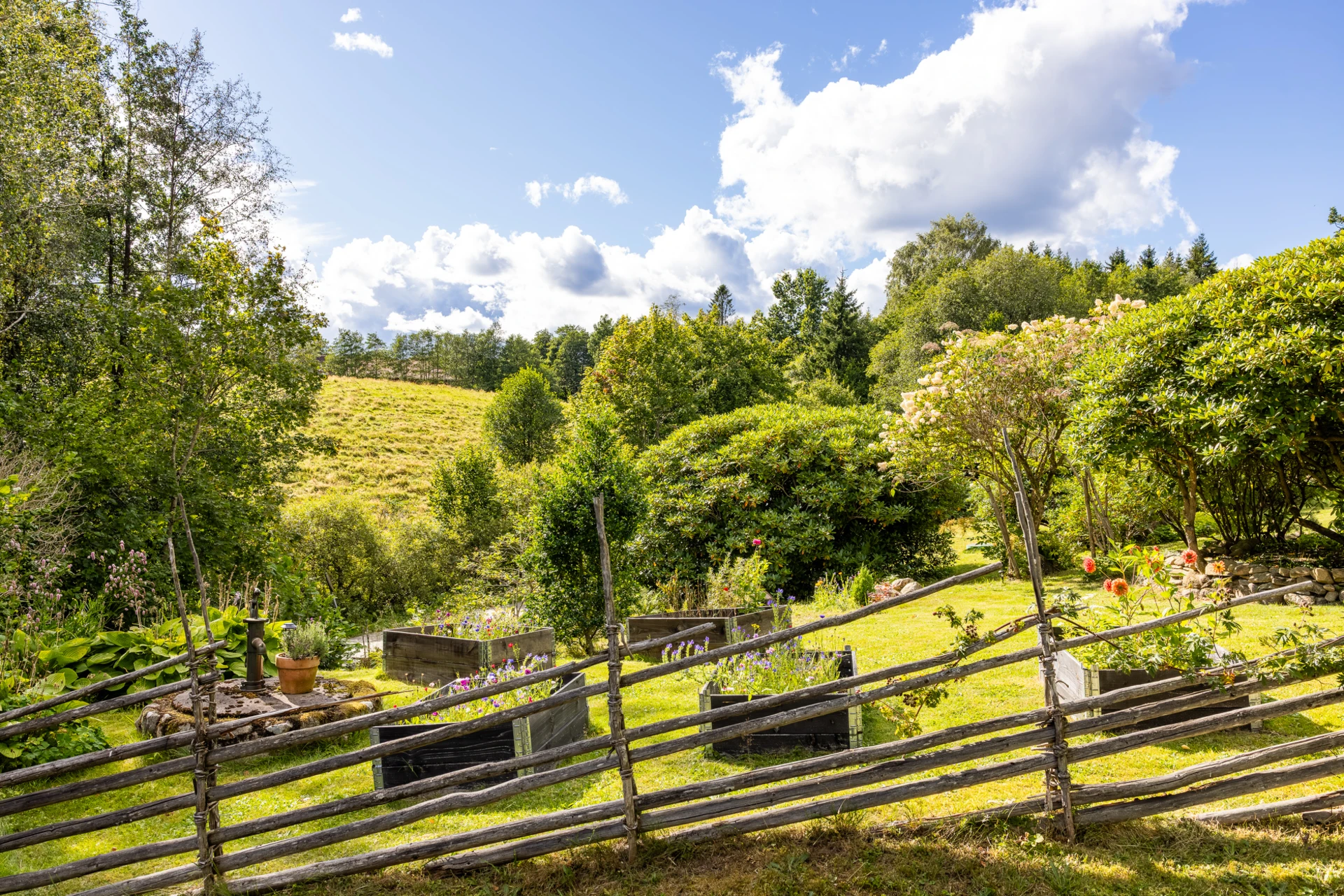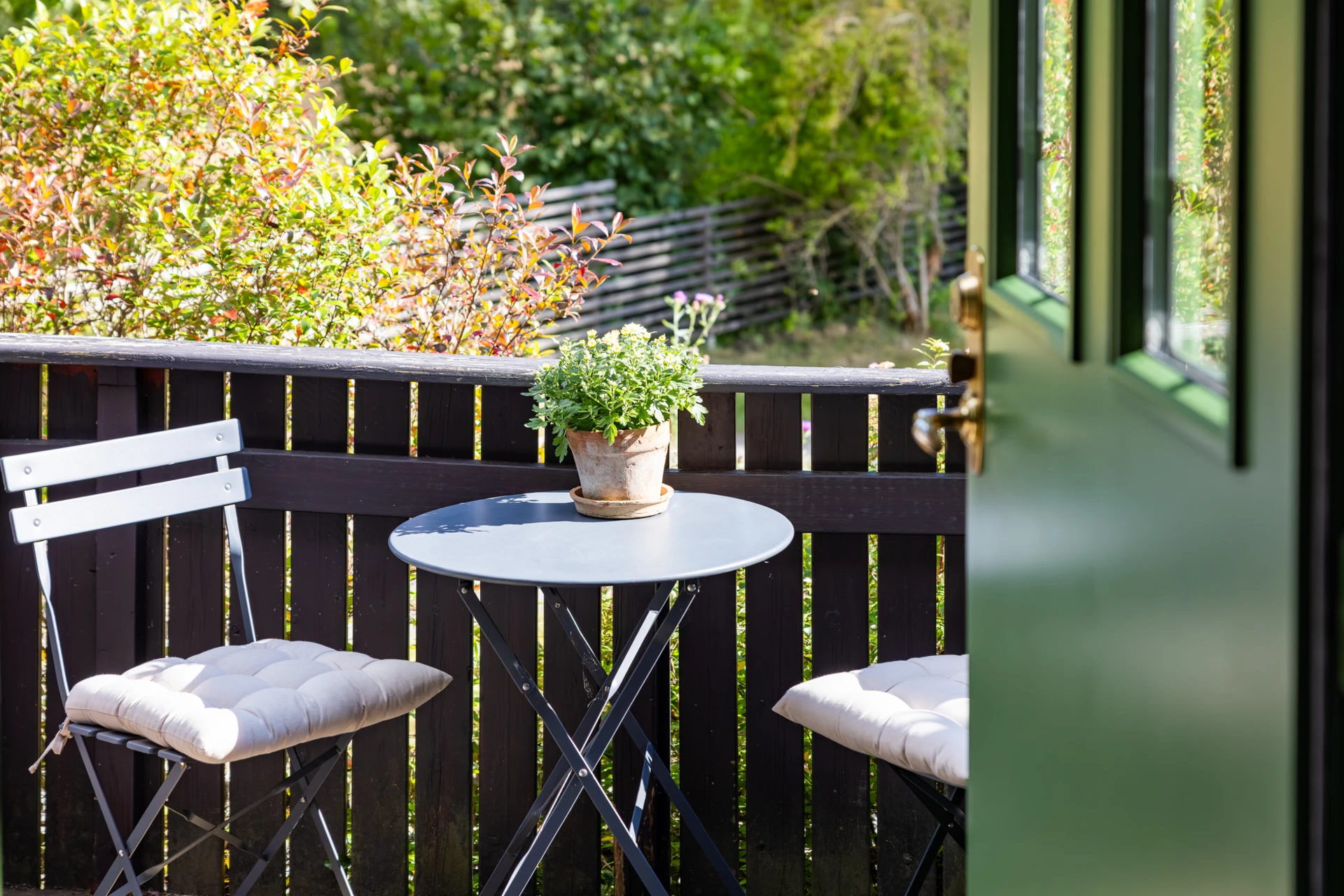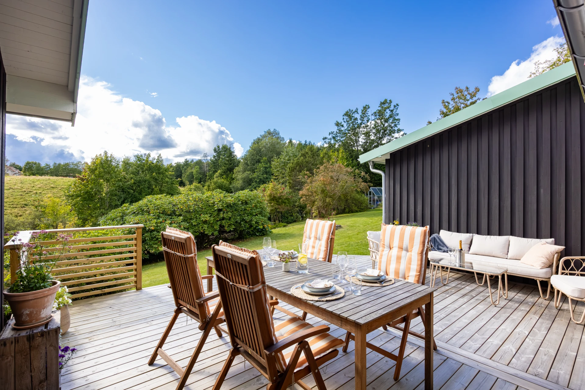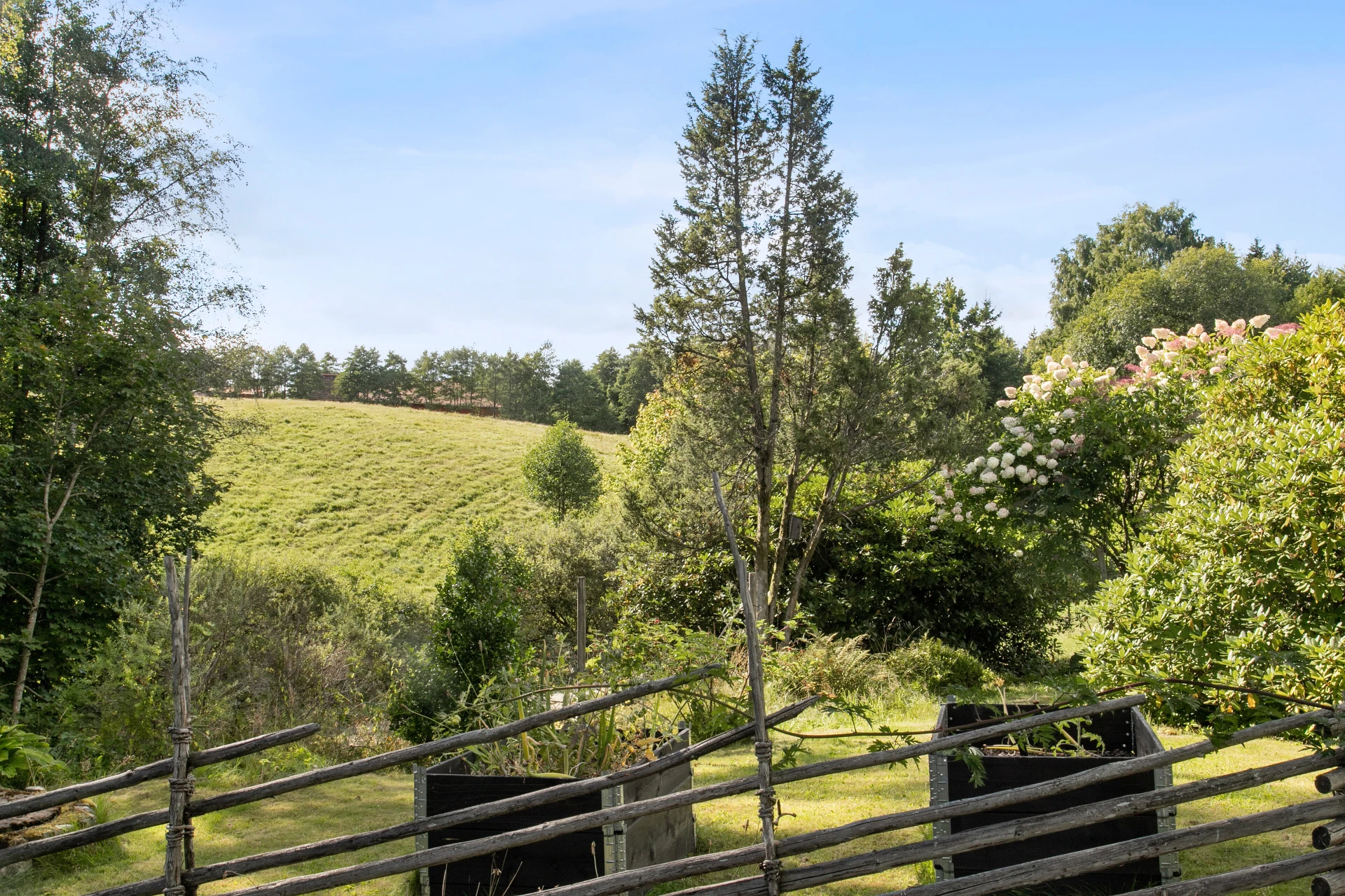 Vedeldad kamin med sittplatser och rofylld utsikt.