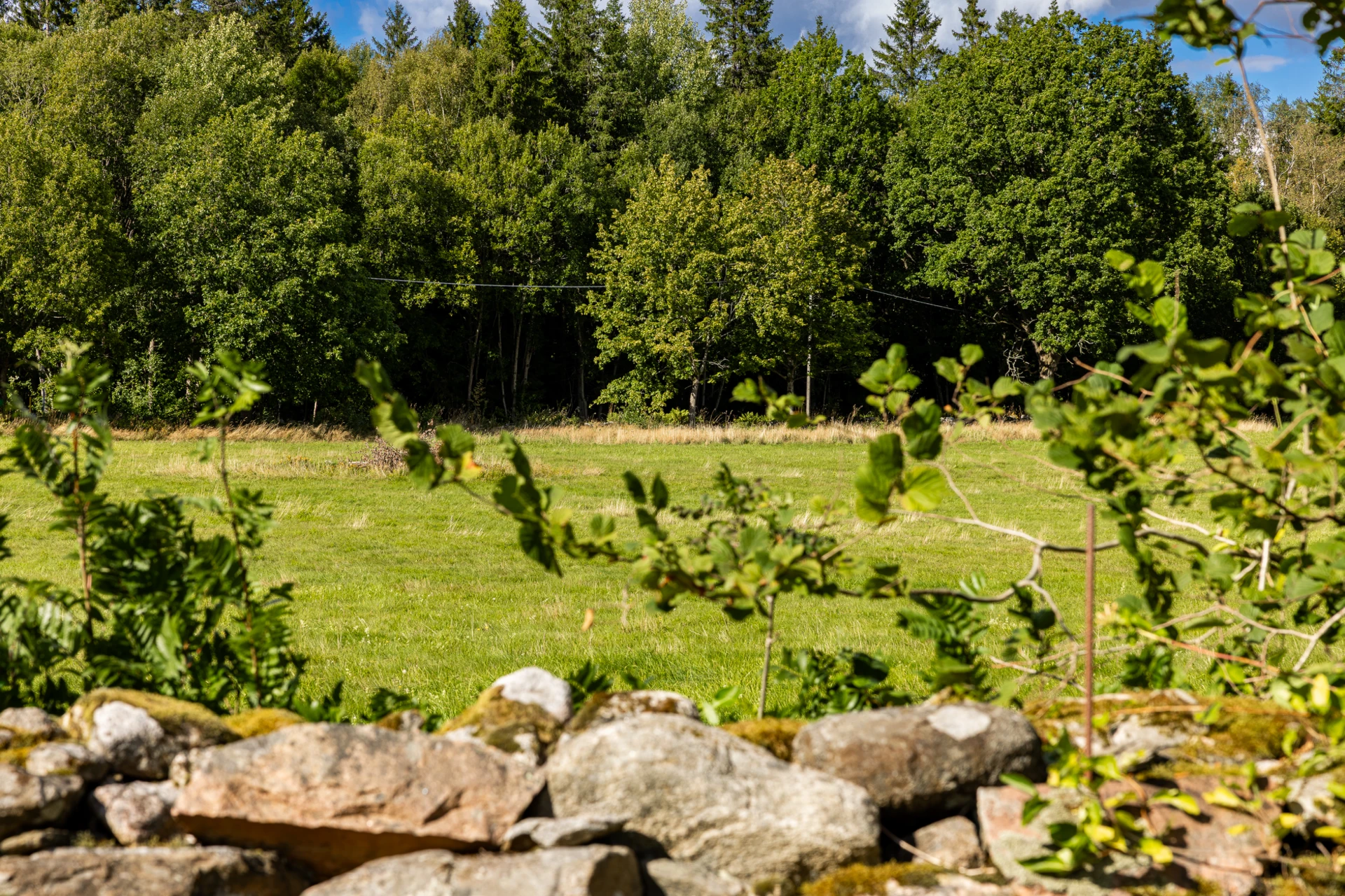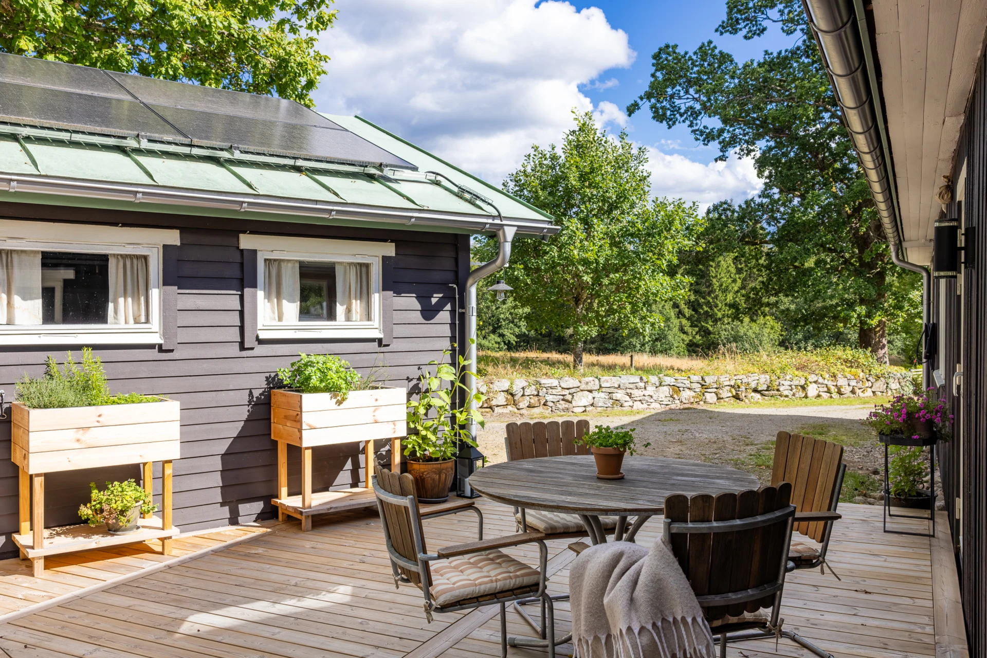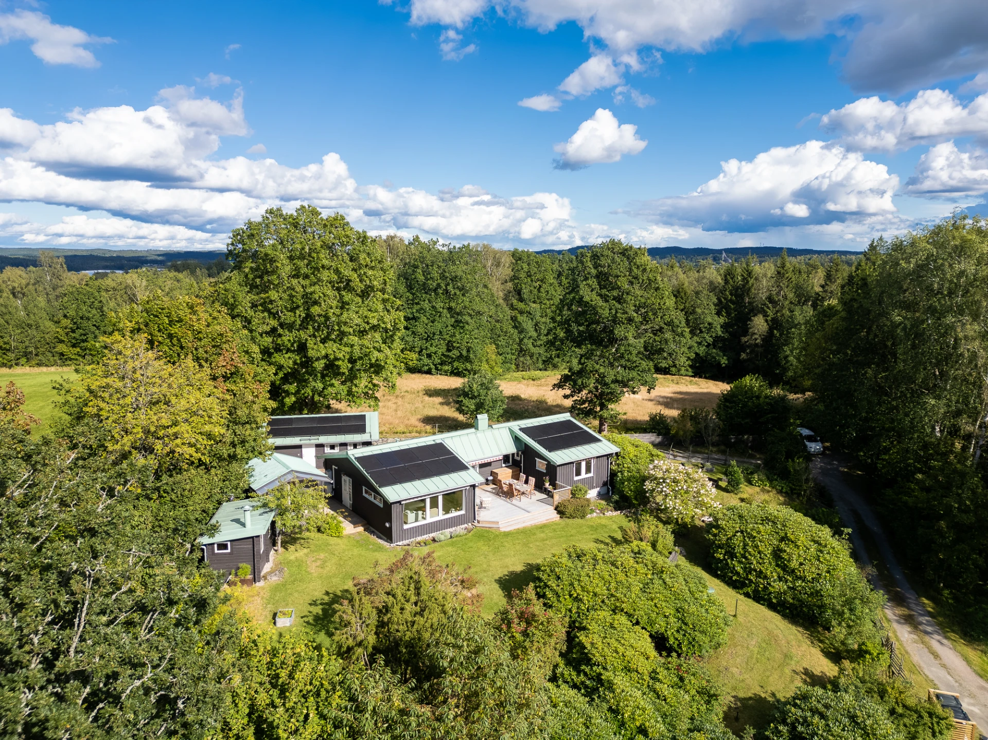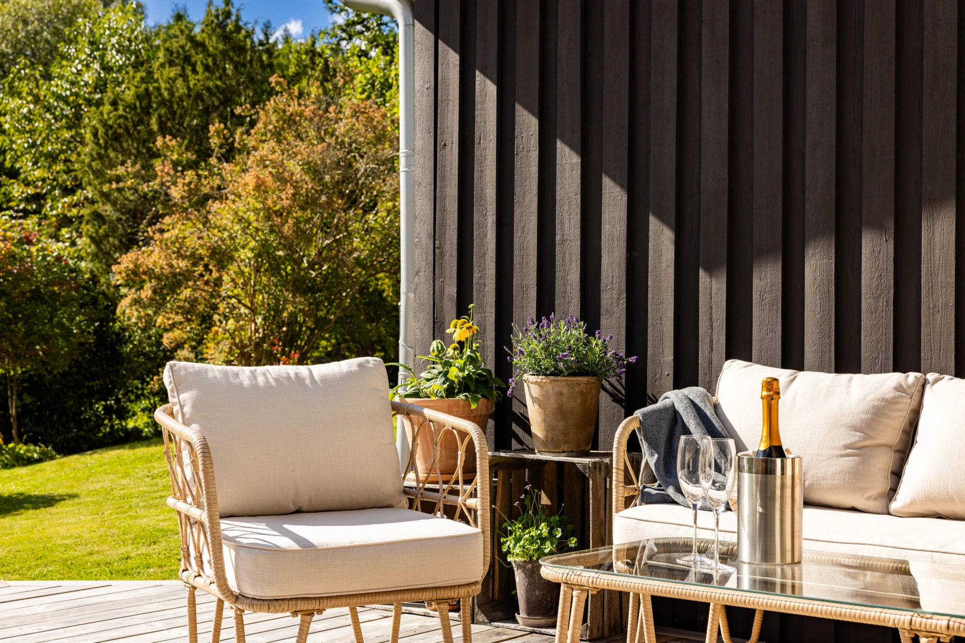 Vedeldad kamin med sittplatser och rofylld utsikt.