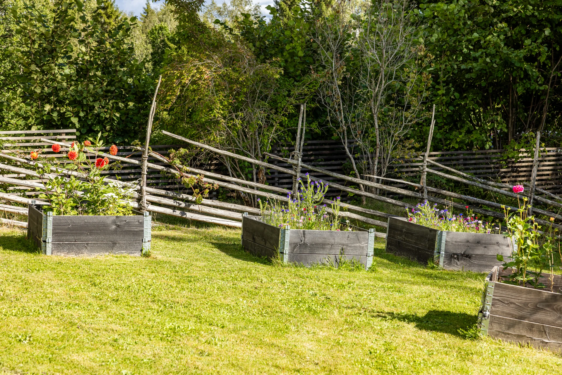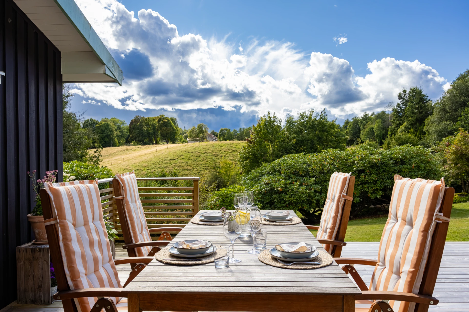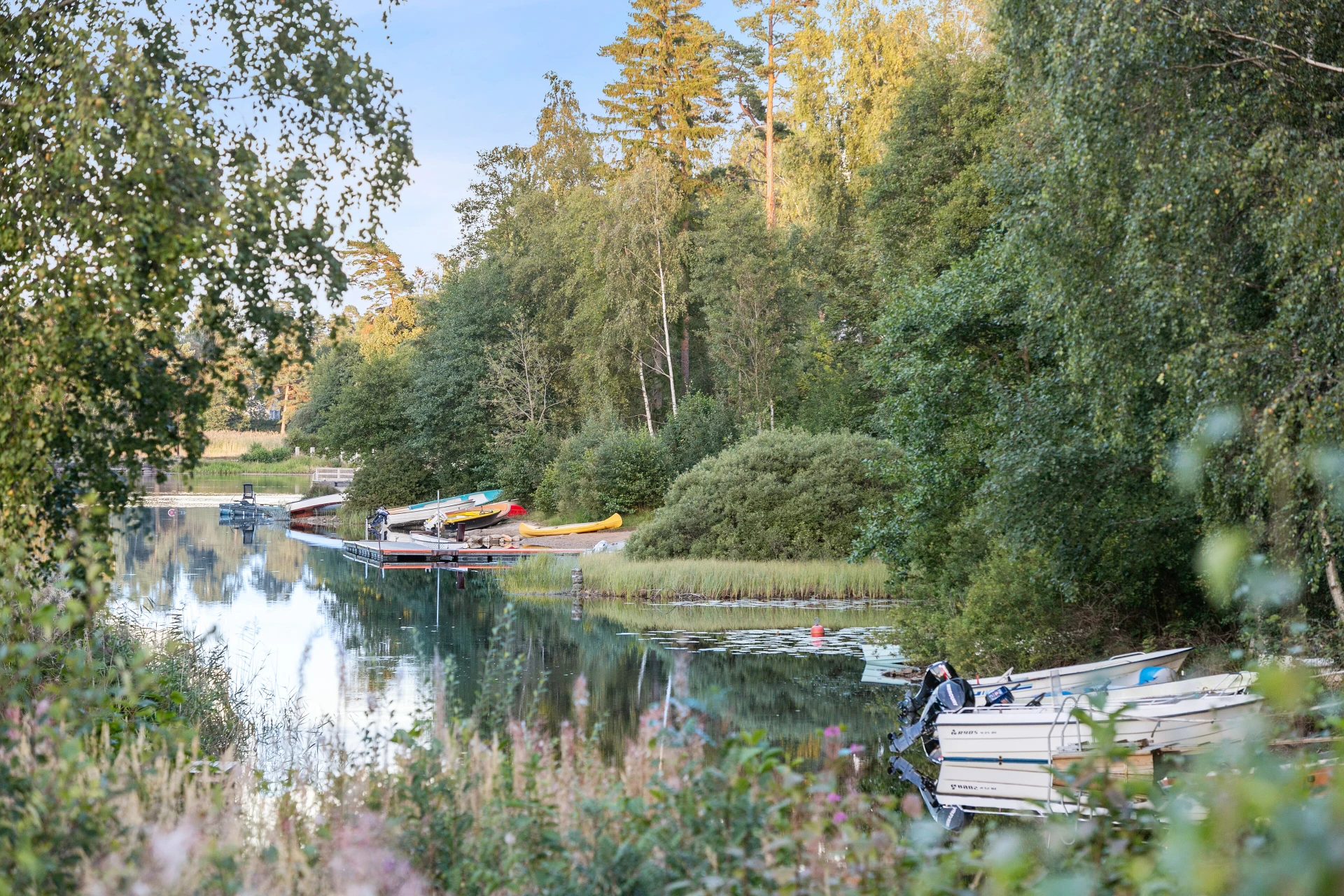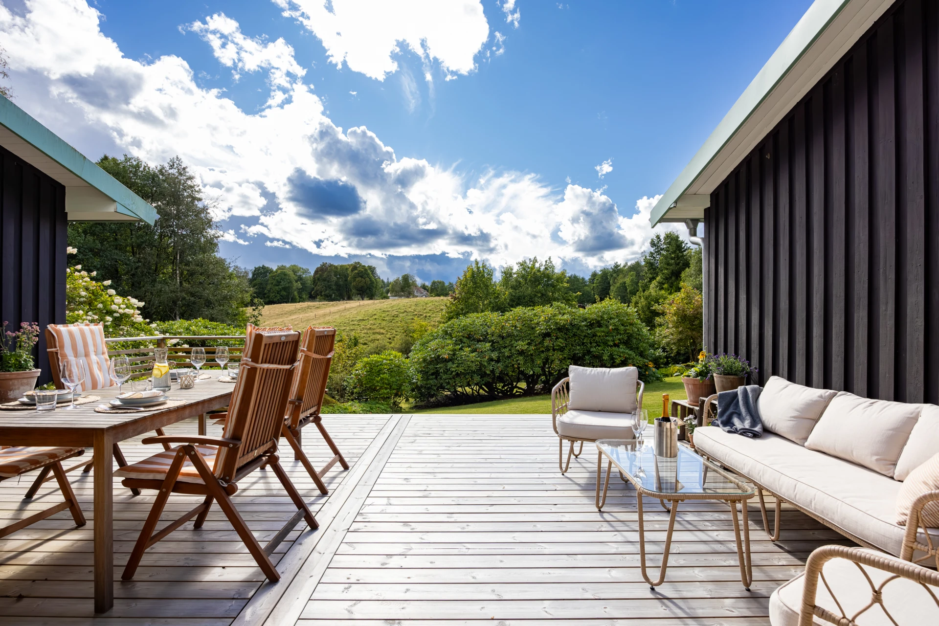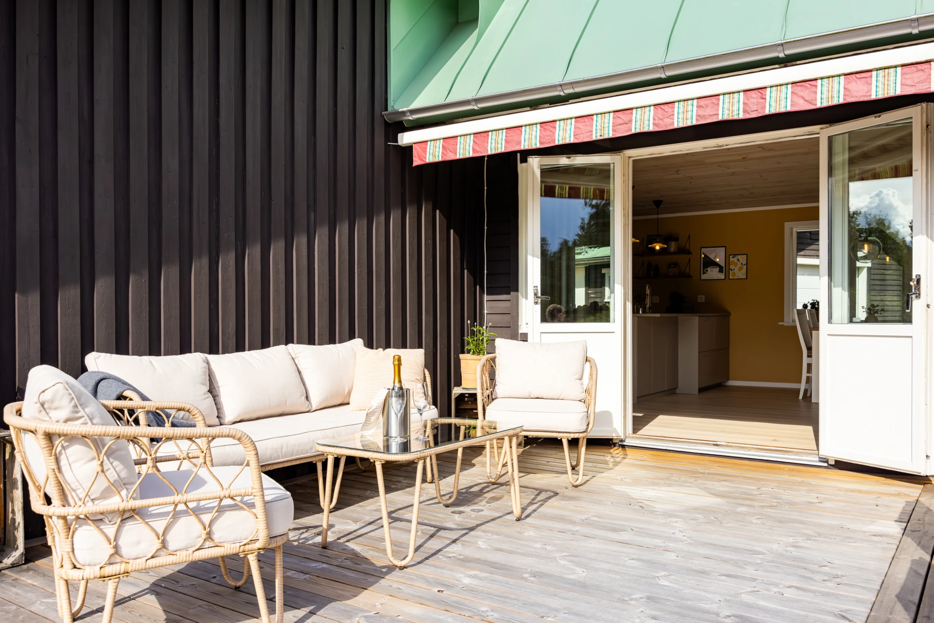 Vedeldad kamin med sittplatser och rofylld utsikt.
