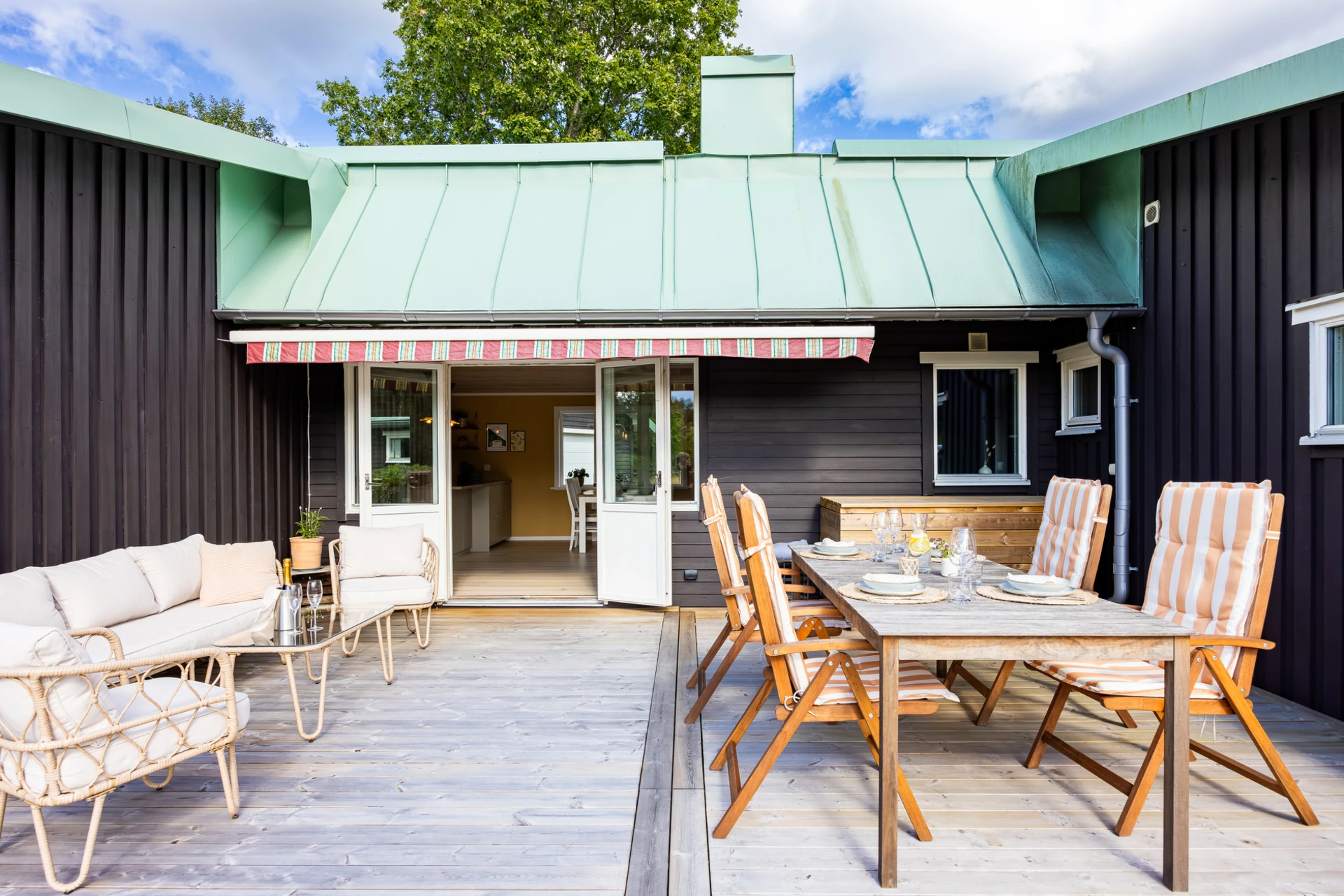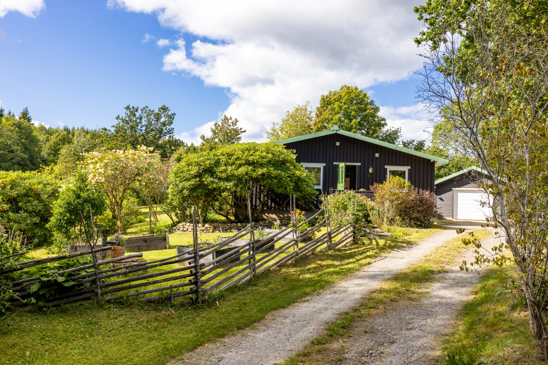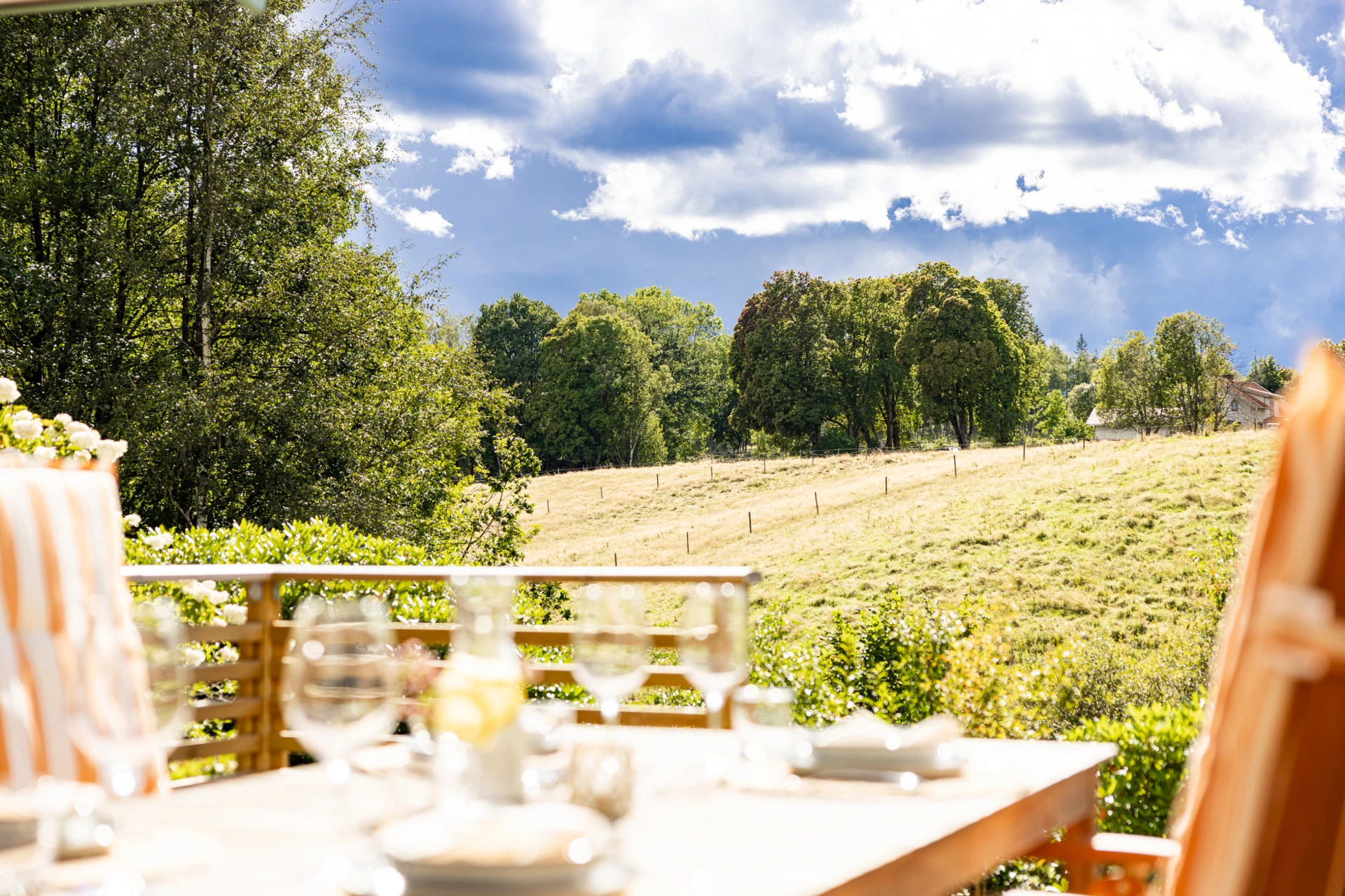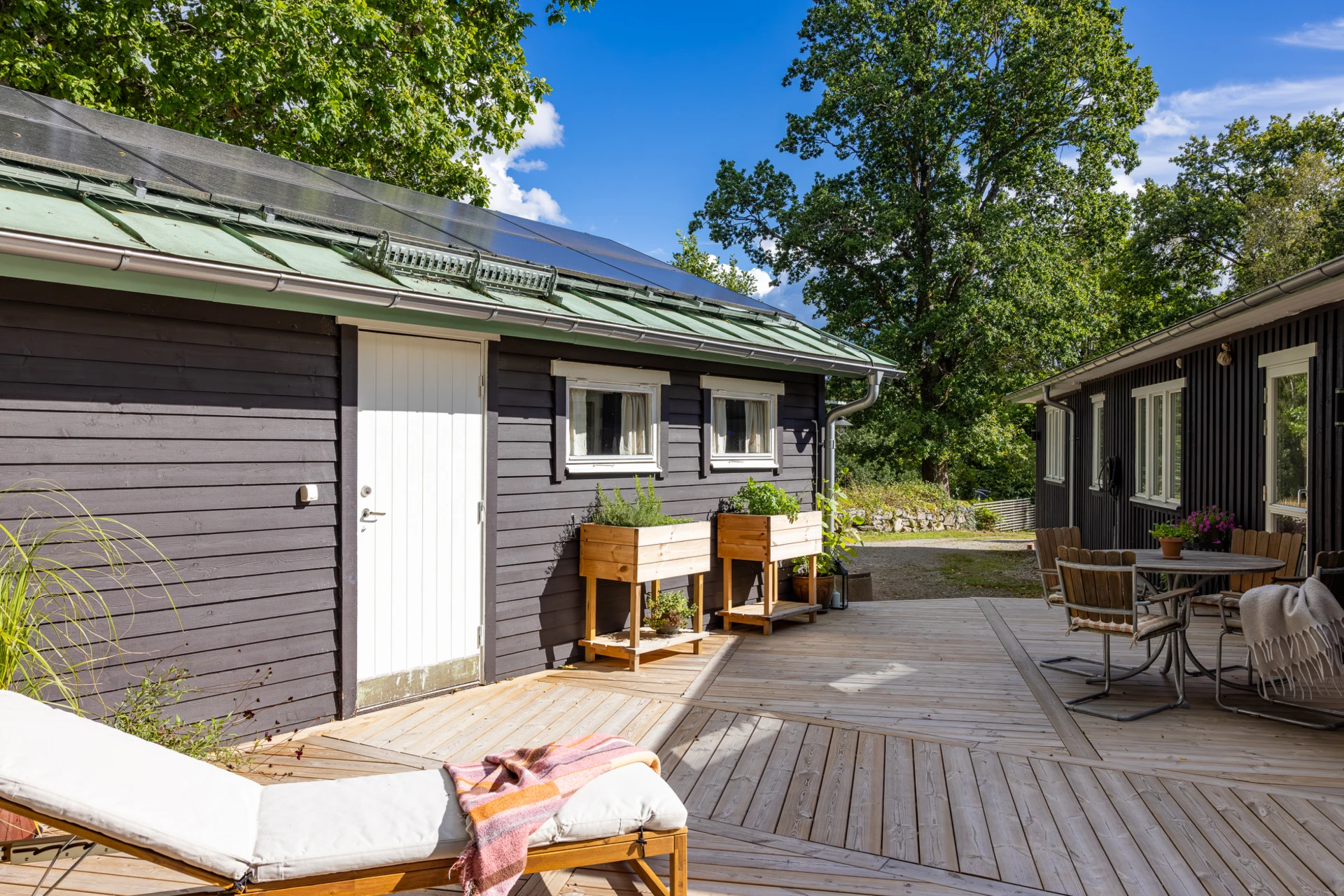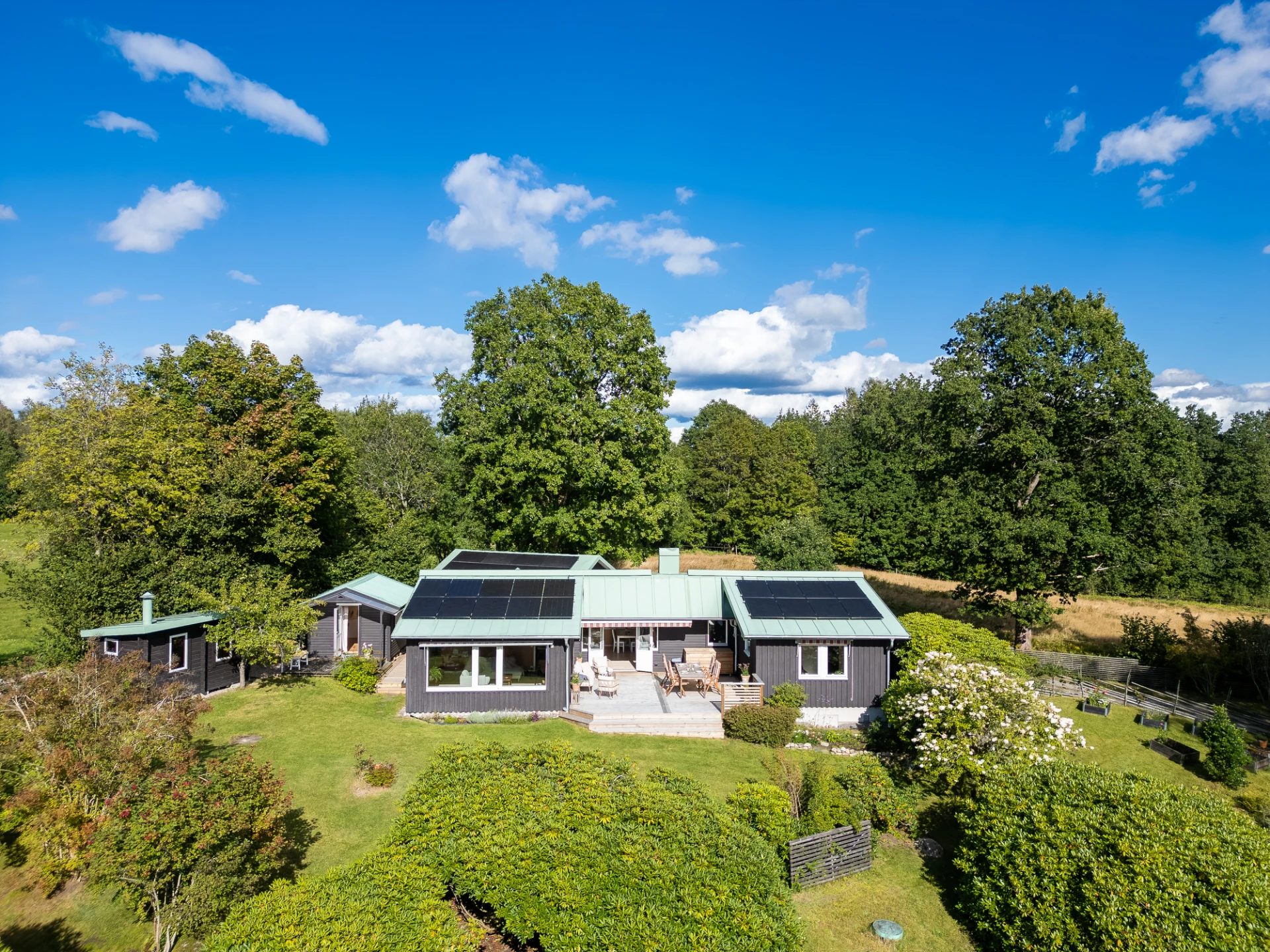 Vedeldad kamin med sittplatser och rofylld utsikt.
