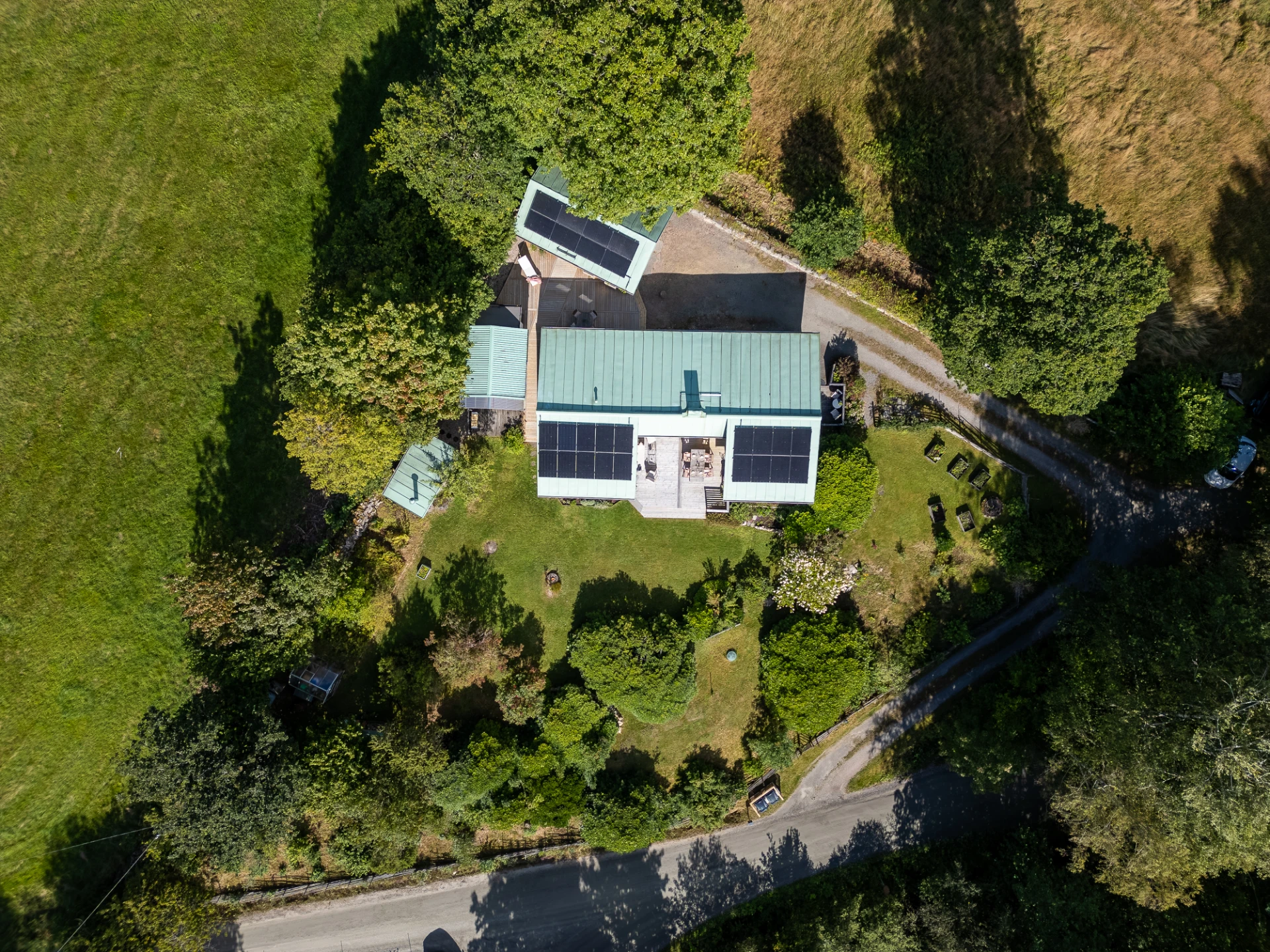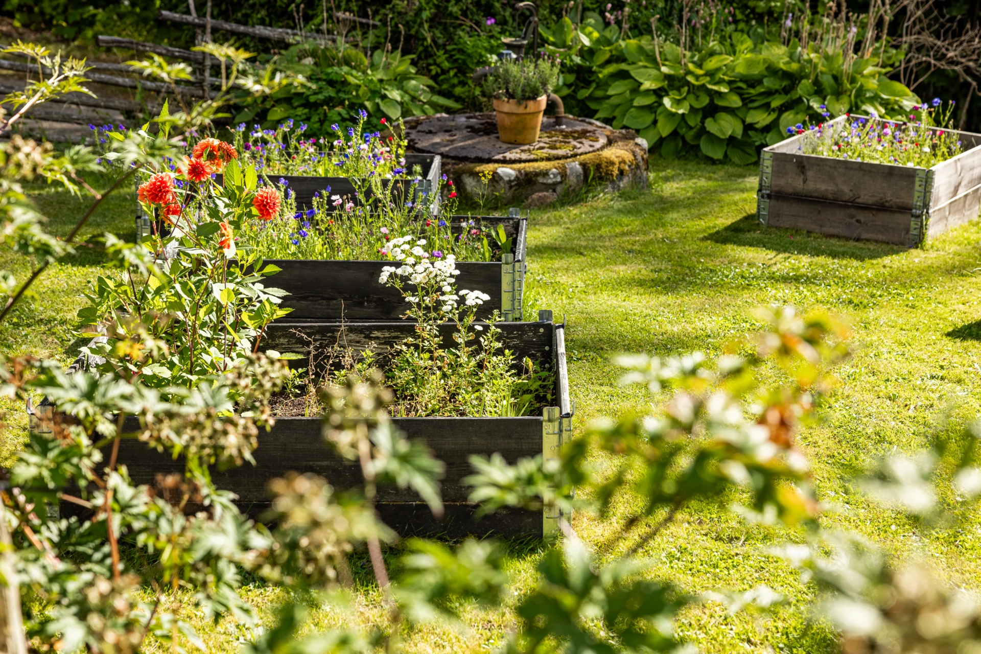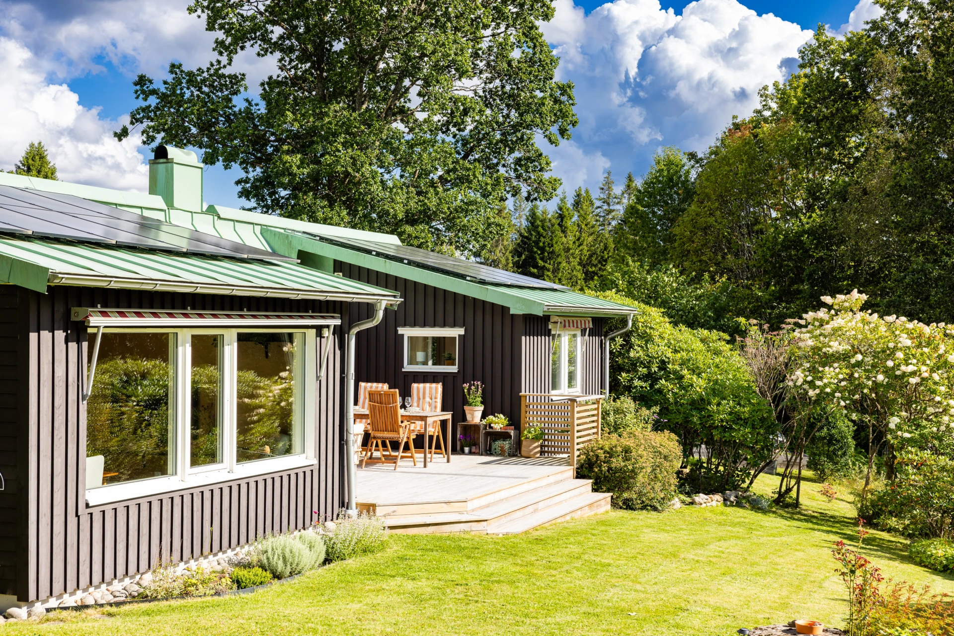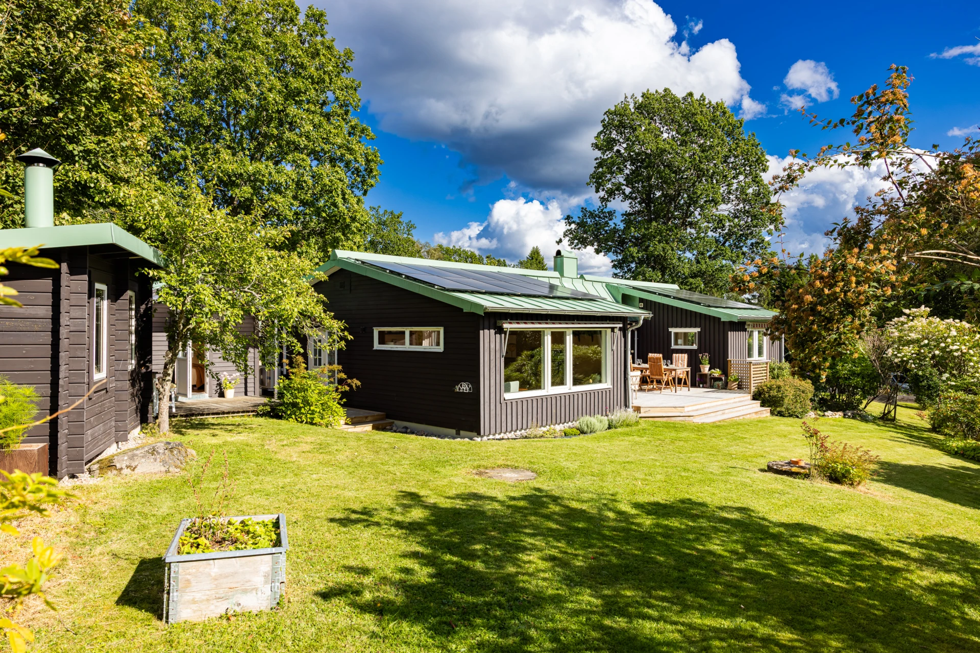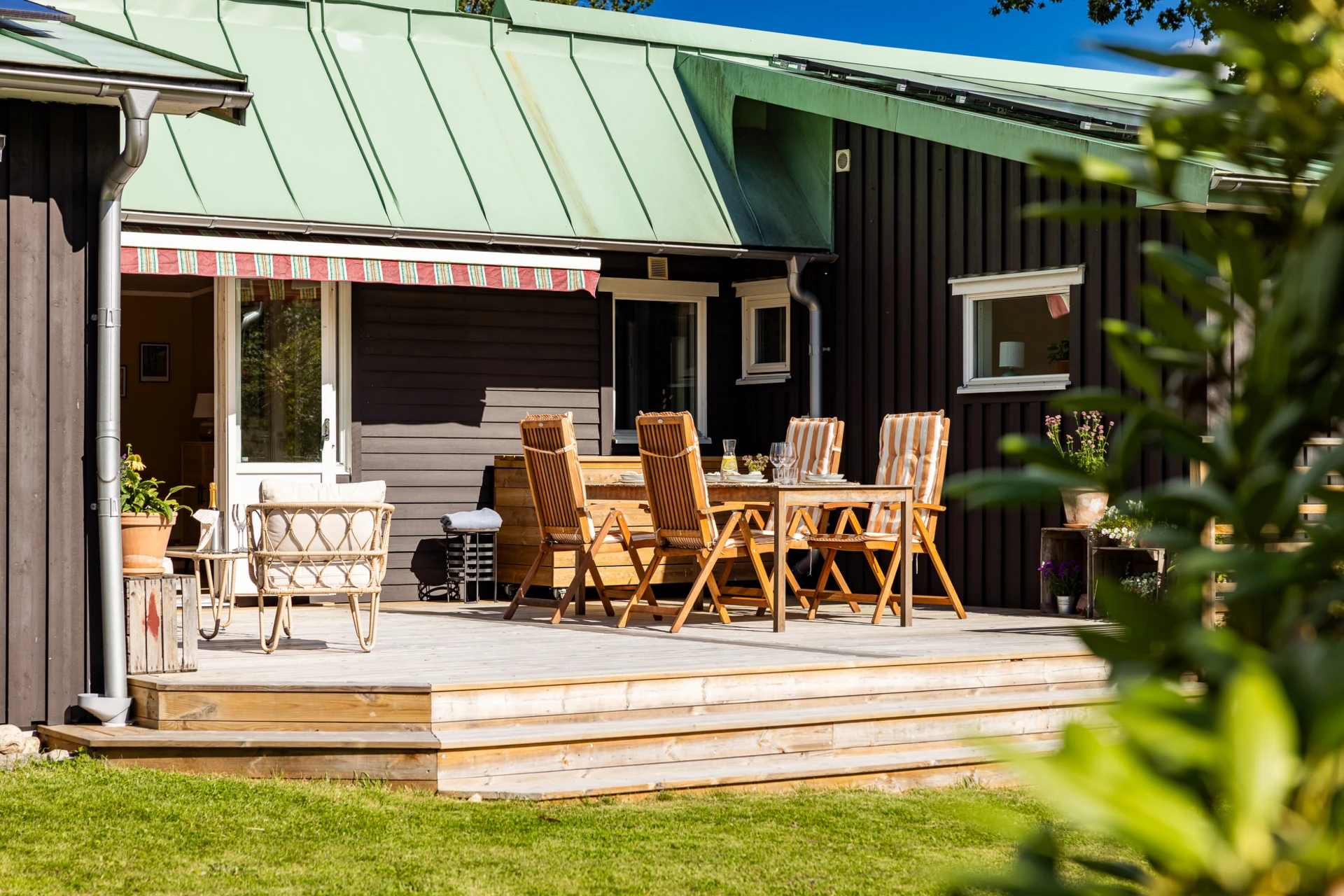 Vedeldad kamin med sittplatser och rofylld utsikt.