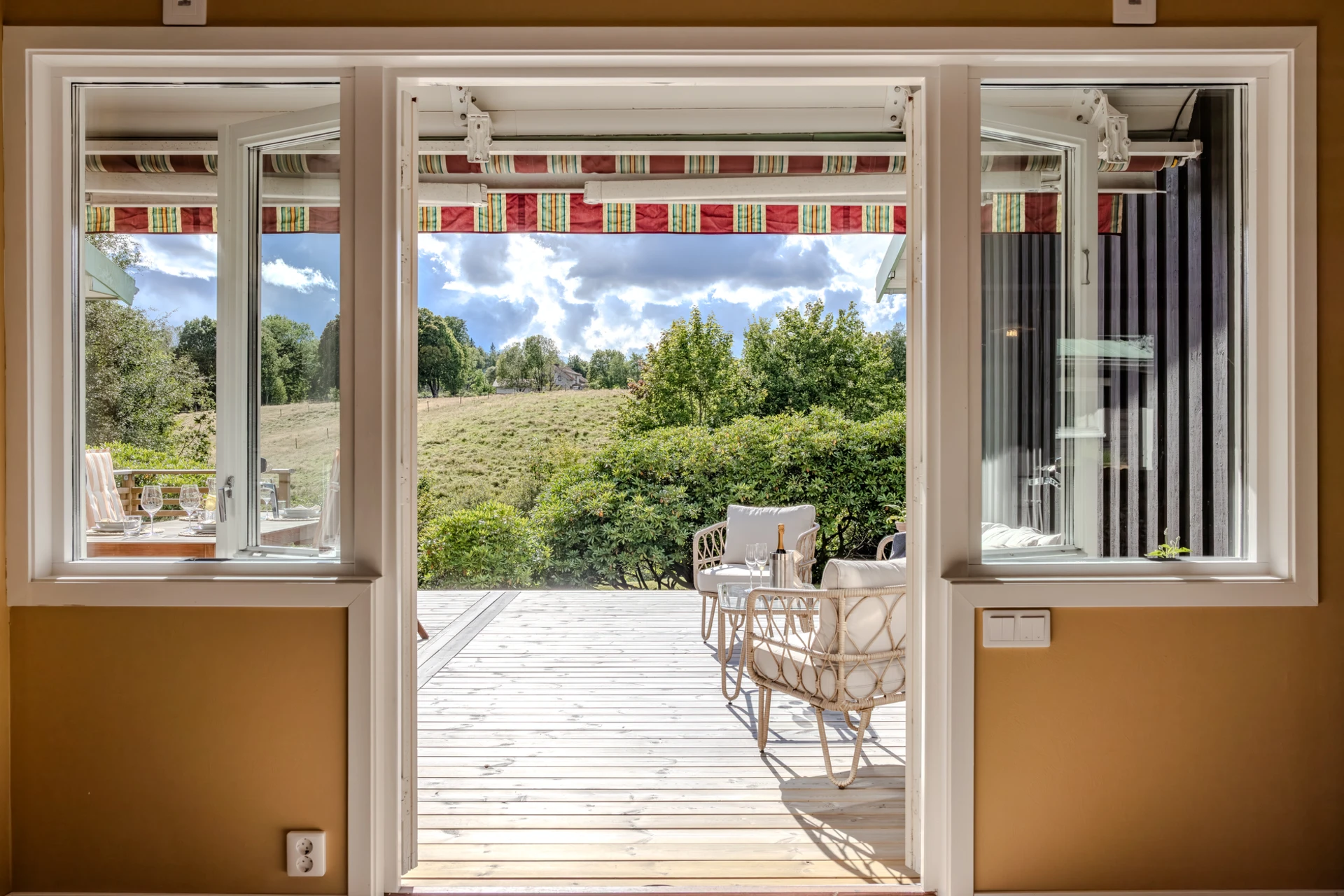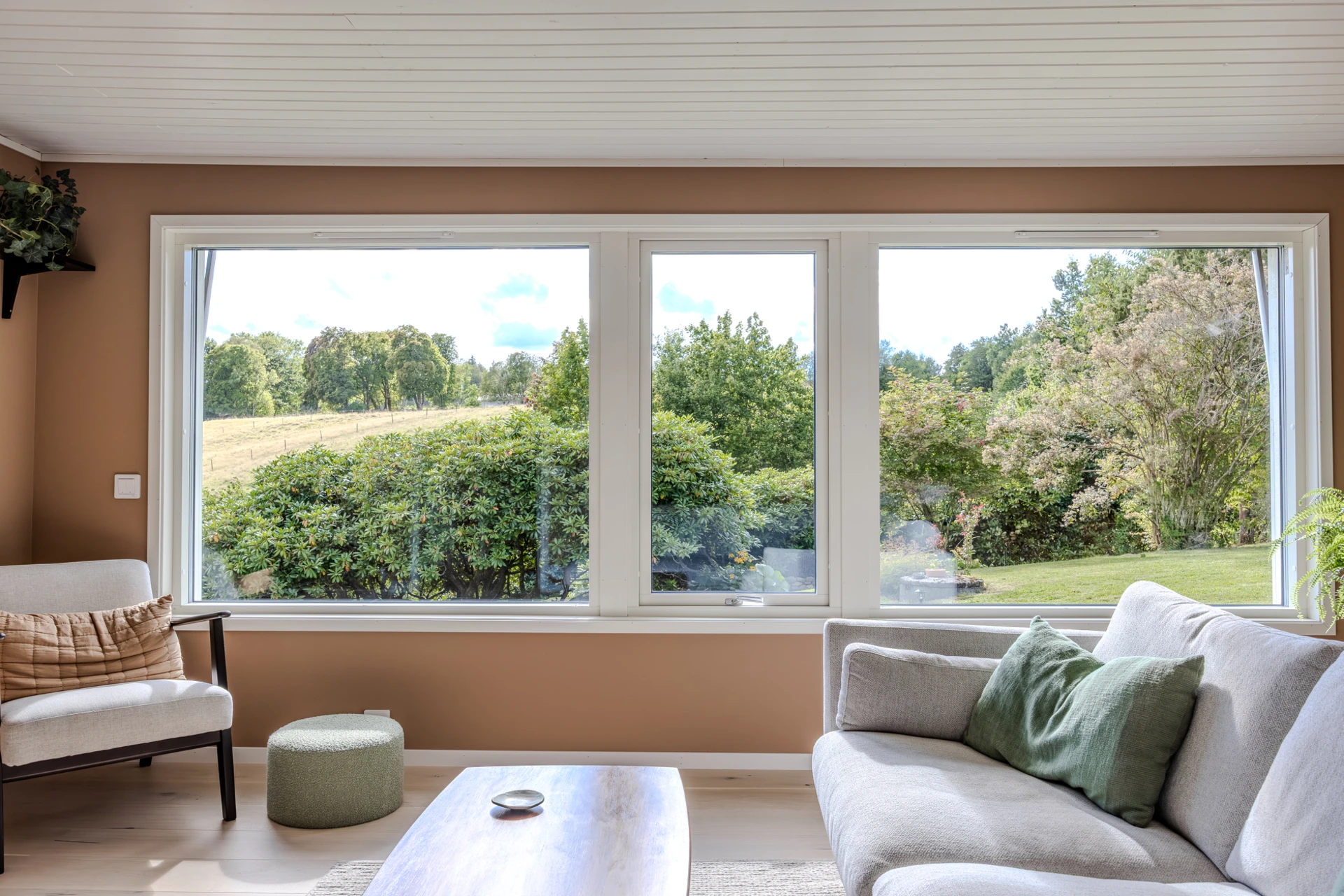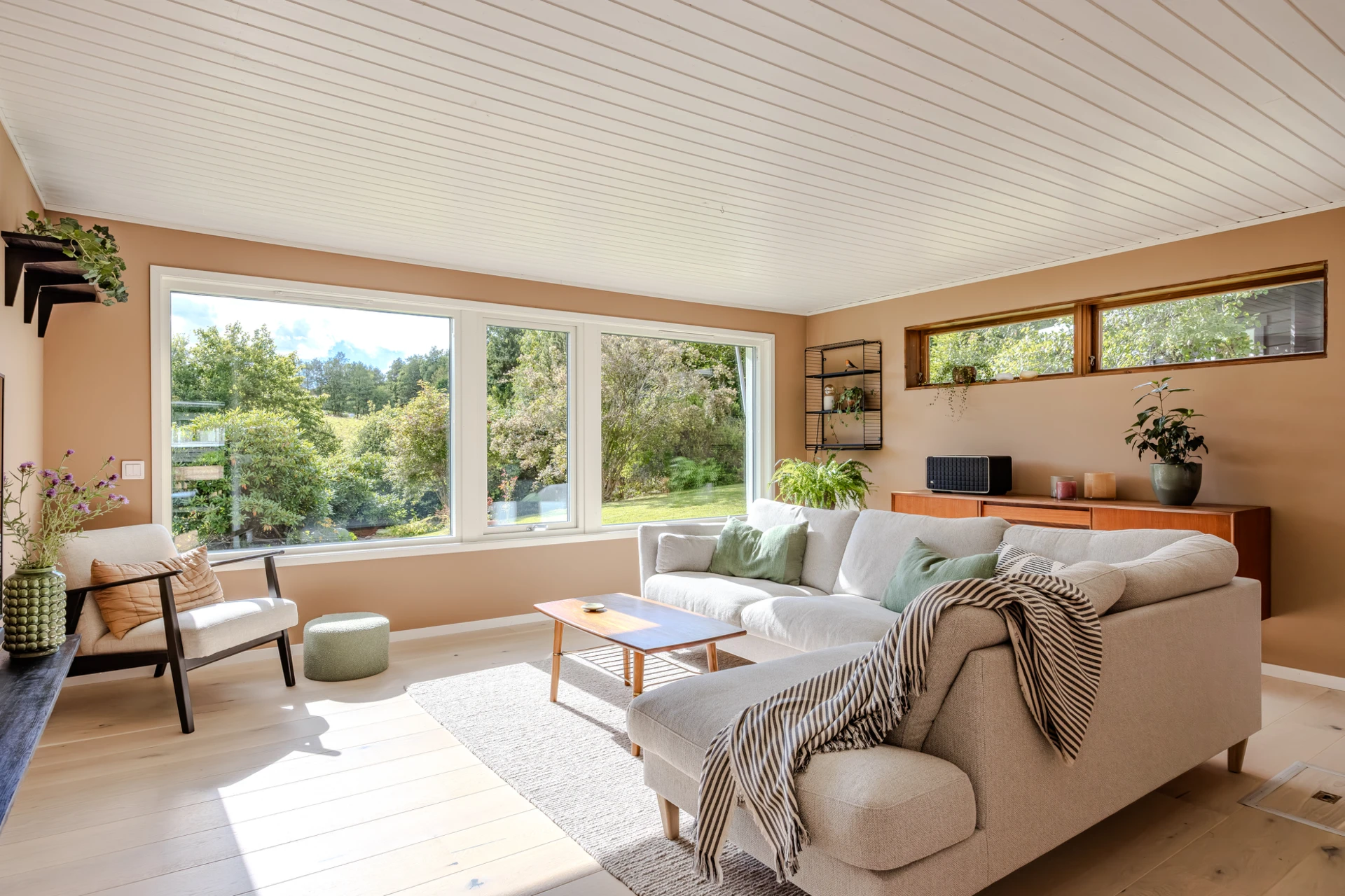 Parkettgolv och gula väggar. Här finns plats för soffa med tillhörande möblemang. Grönskande utsikt från dem stora fönstren.