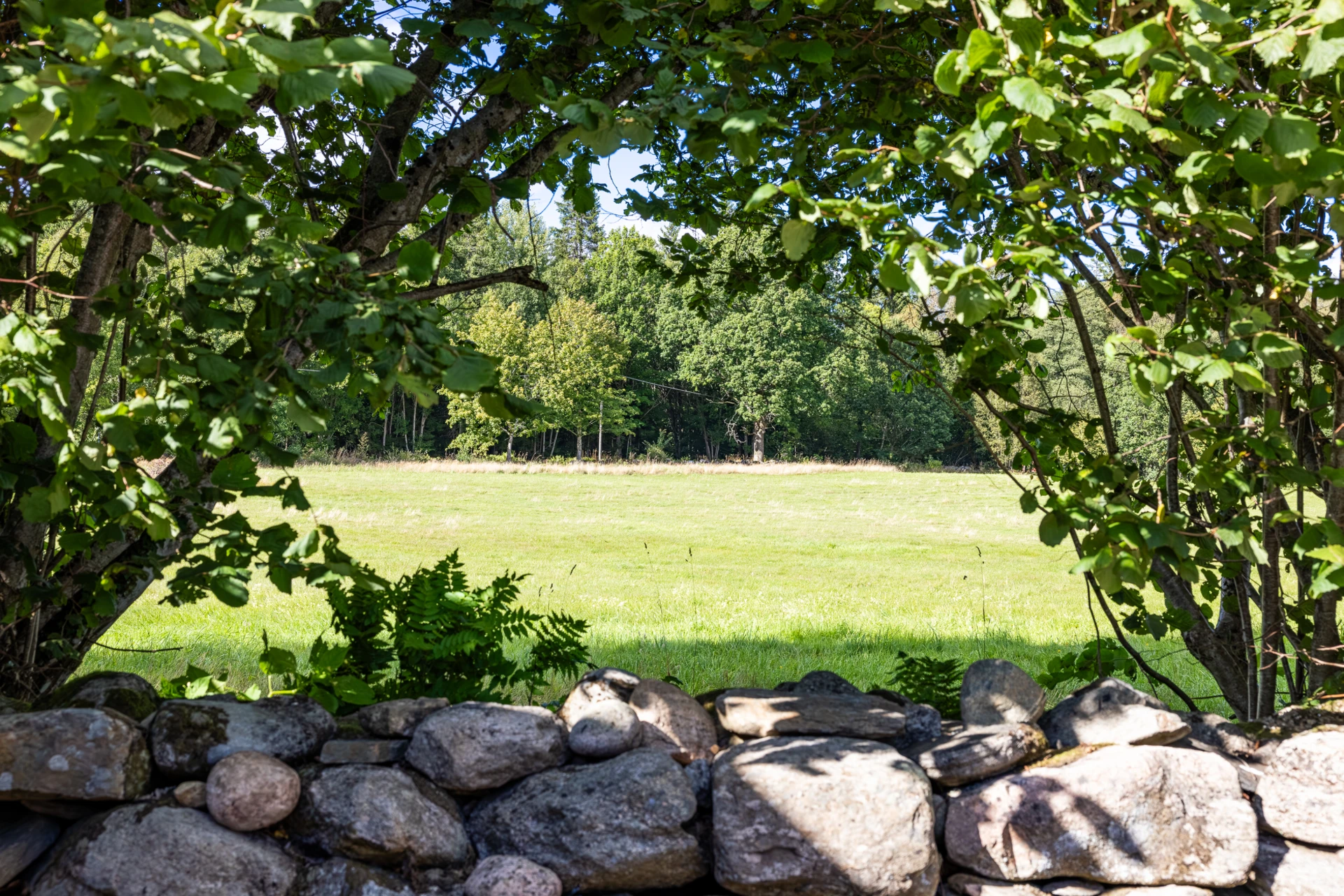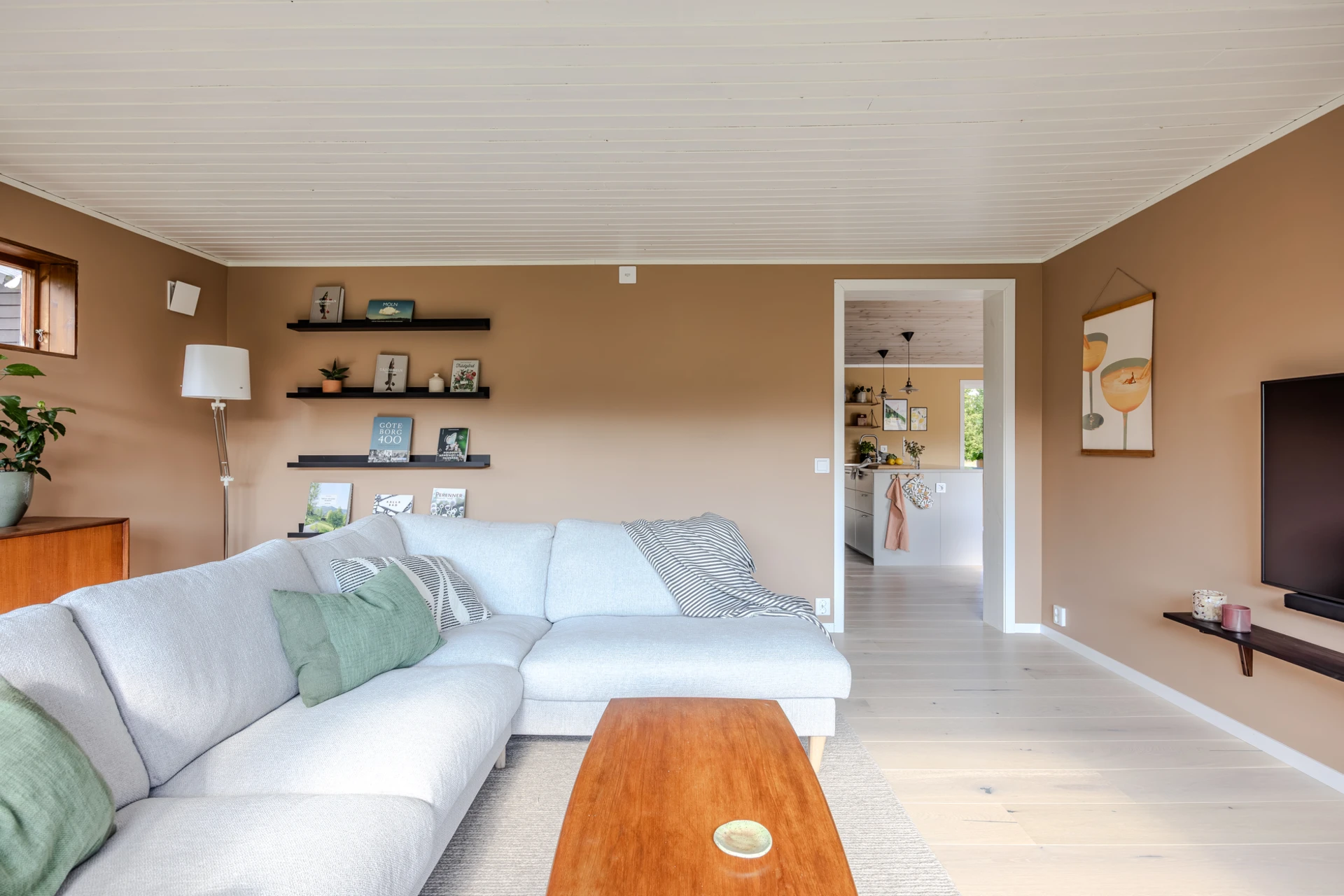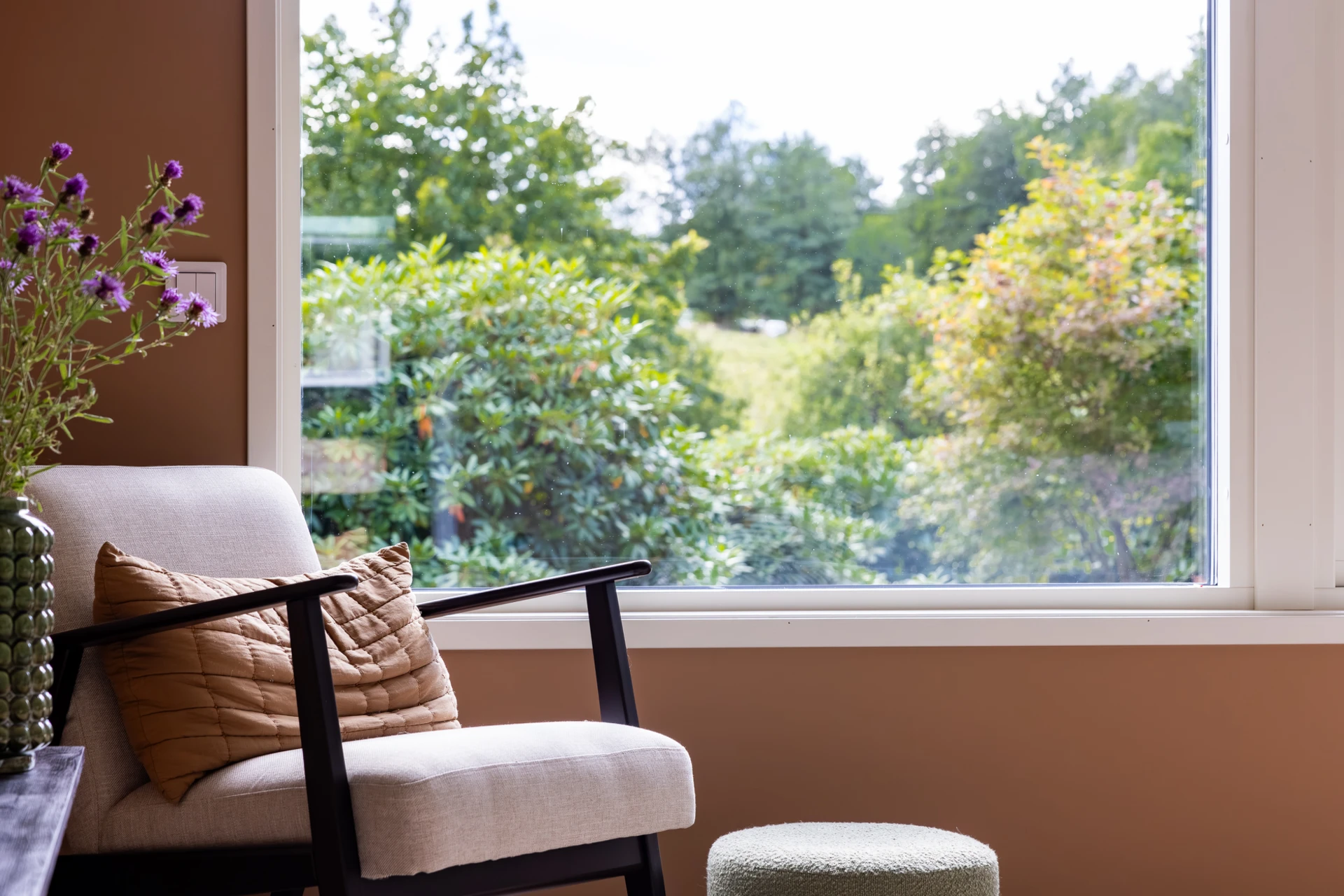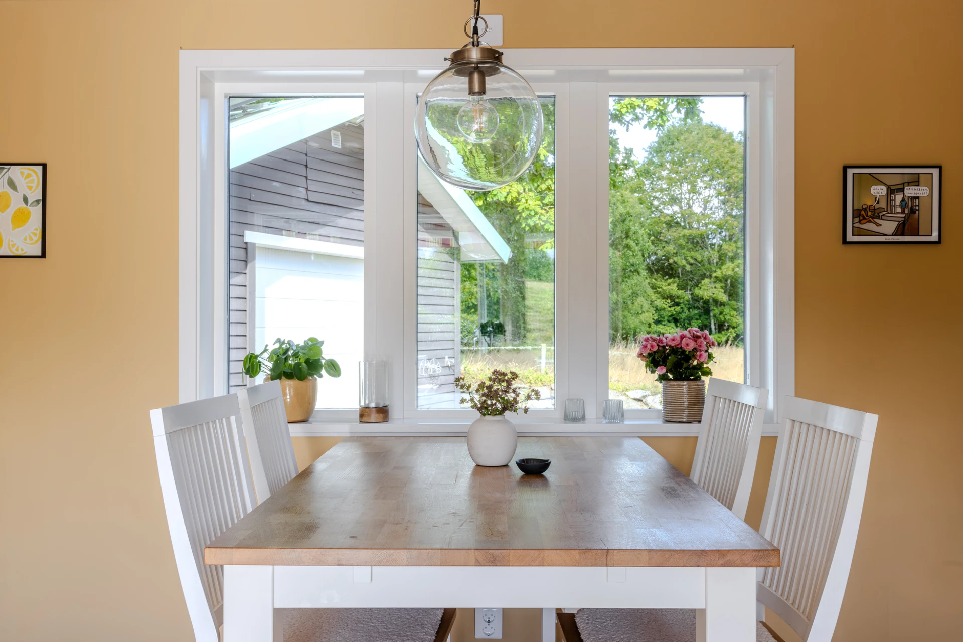 Parkettgolv och gula väggar. Här finns plats för soffa med tillhörande möblemang. Grönskande utsikt från dem stora fönstren.