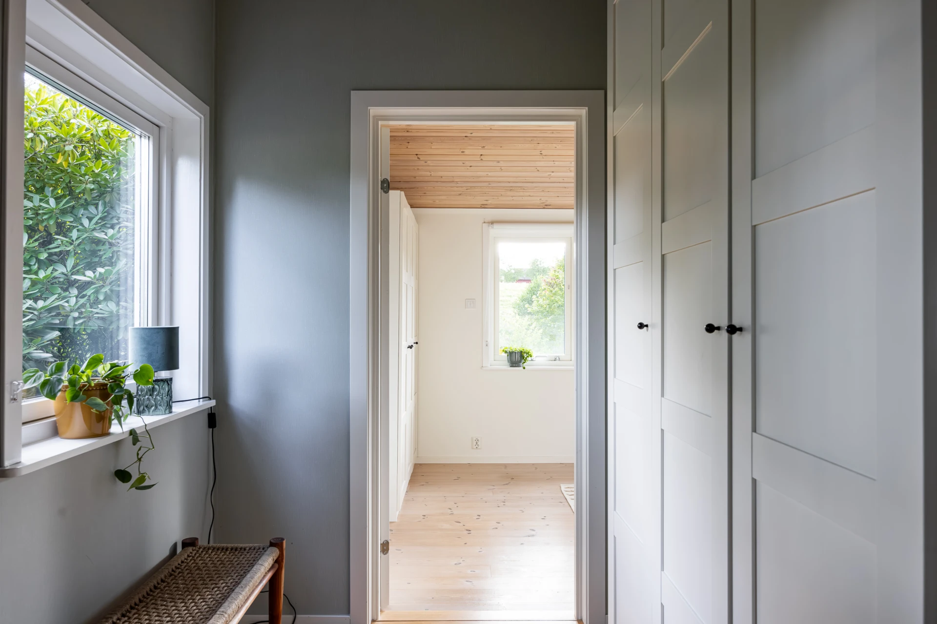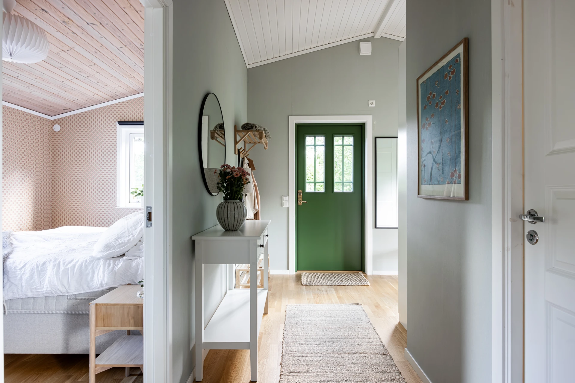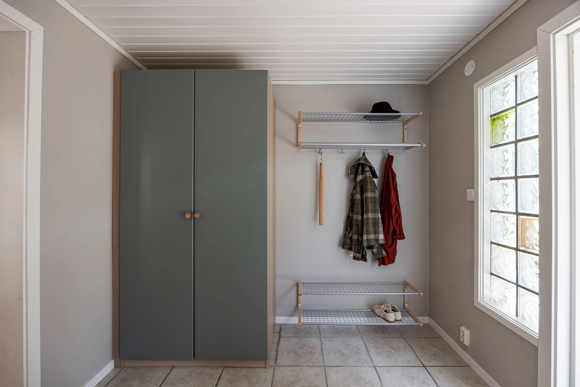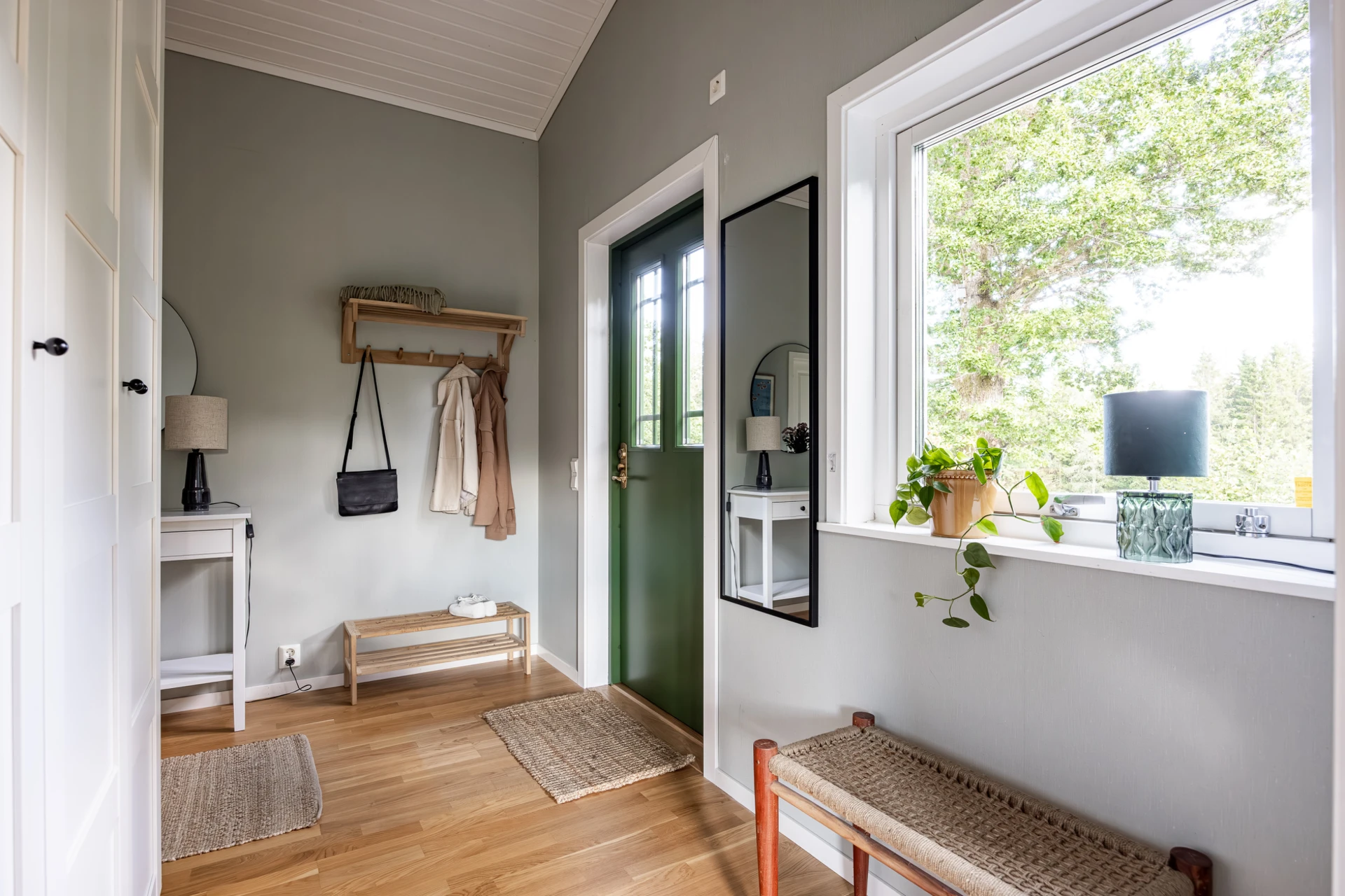 Parkettgolv och väggar i dov grön nyans. Här finns plats för avhängning och förvaring sker i två garderober. Här finns även ett stort fönster som släpper in naturligt ljus.