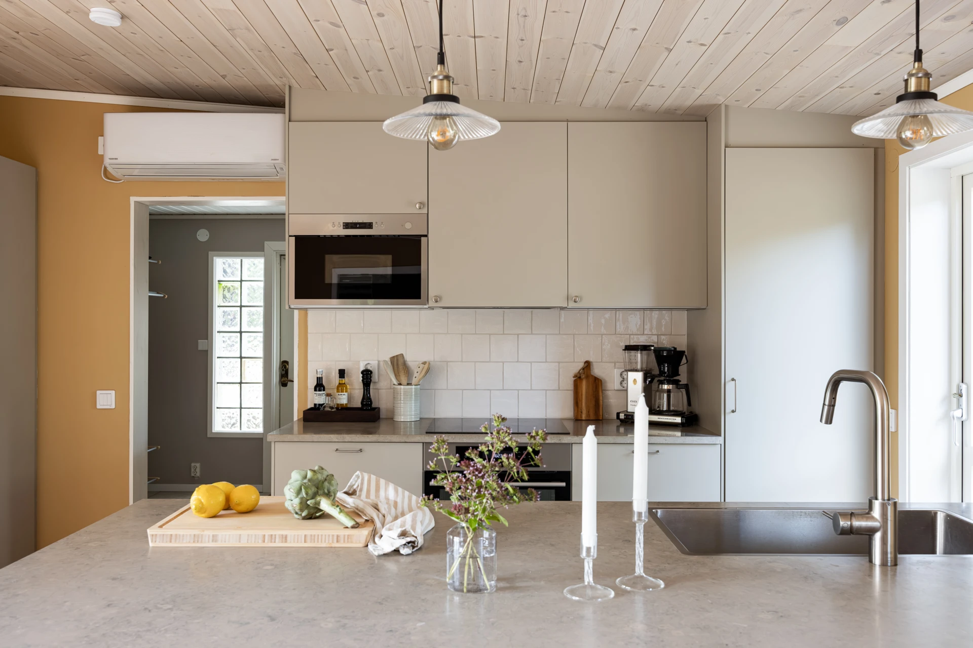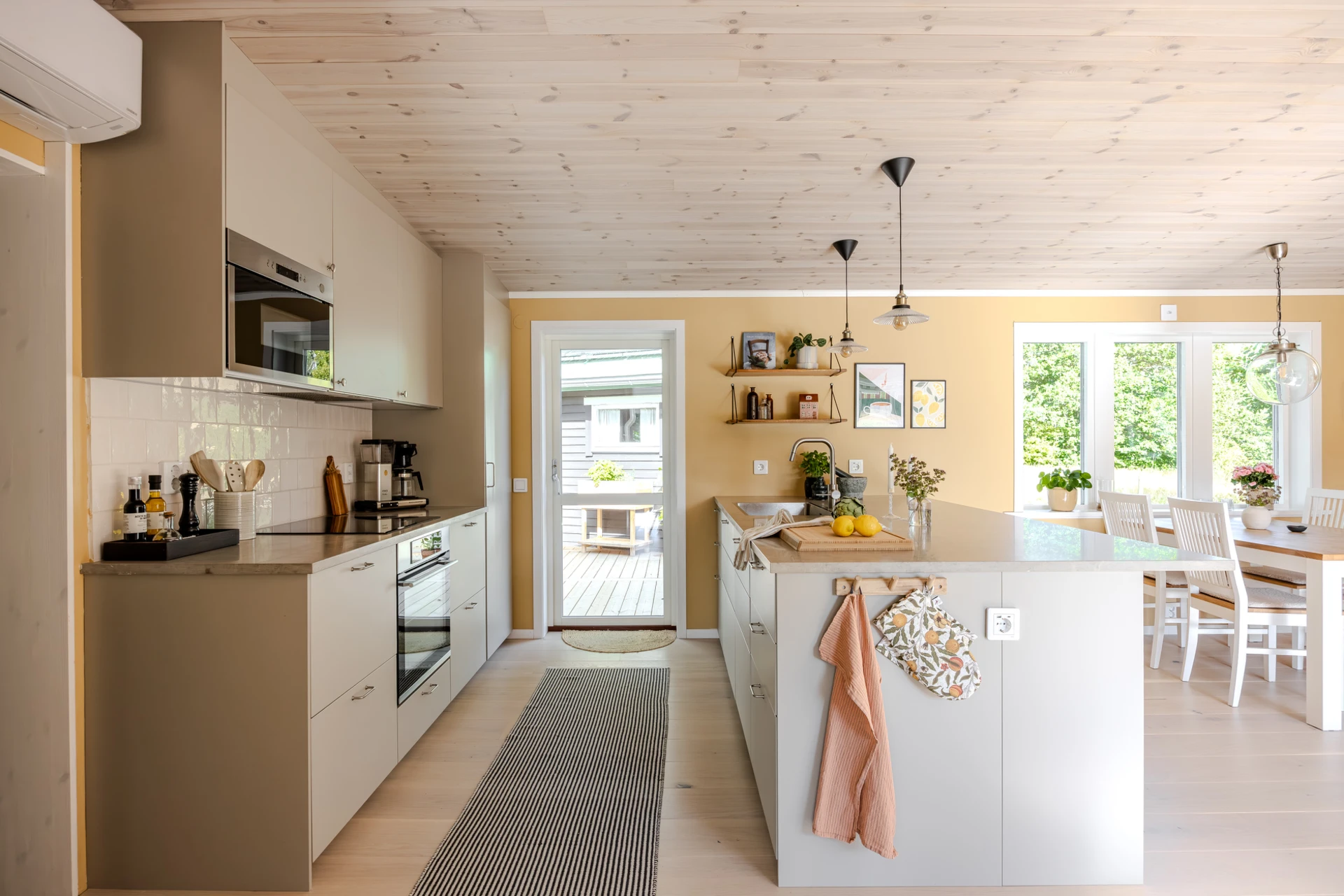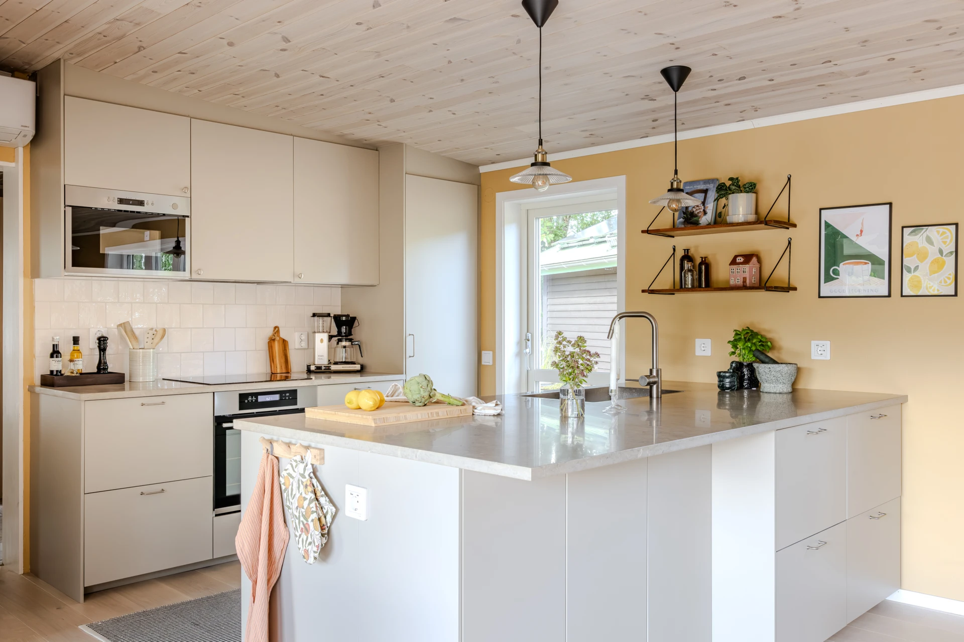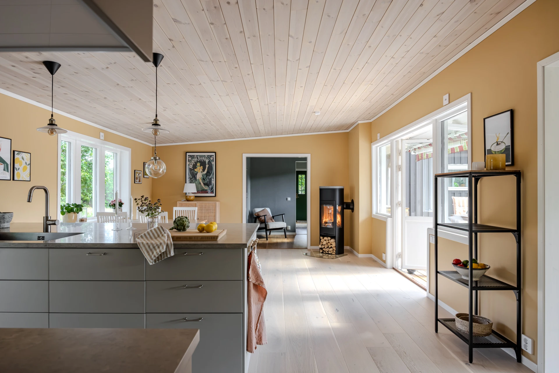 Parkettgolv och gula väggar. Köksinredning i beigt och ovanför arbetsbänken i natursten sitter vitt kakel. Köket är utrustat med kyl och frys i fullhöjd, induktionshäll, ugn, fläkt, inbyggd mikro, skafferi och diskmaskin. Matplats för stort sällskap. Här finns även en braskamin. Härifrån nås bostadens båda altaner.