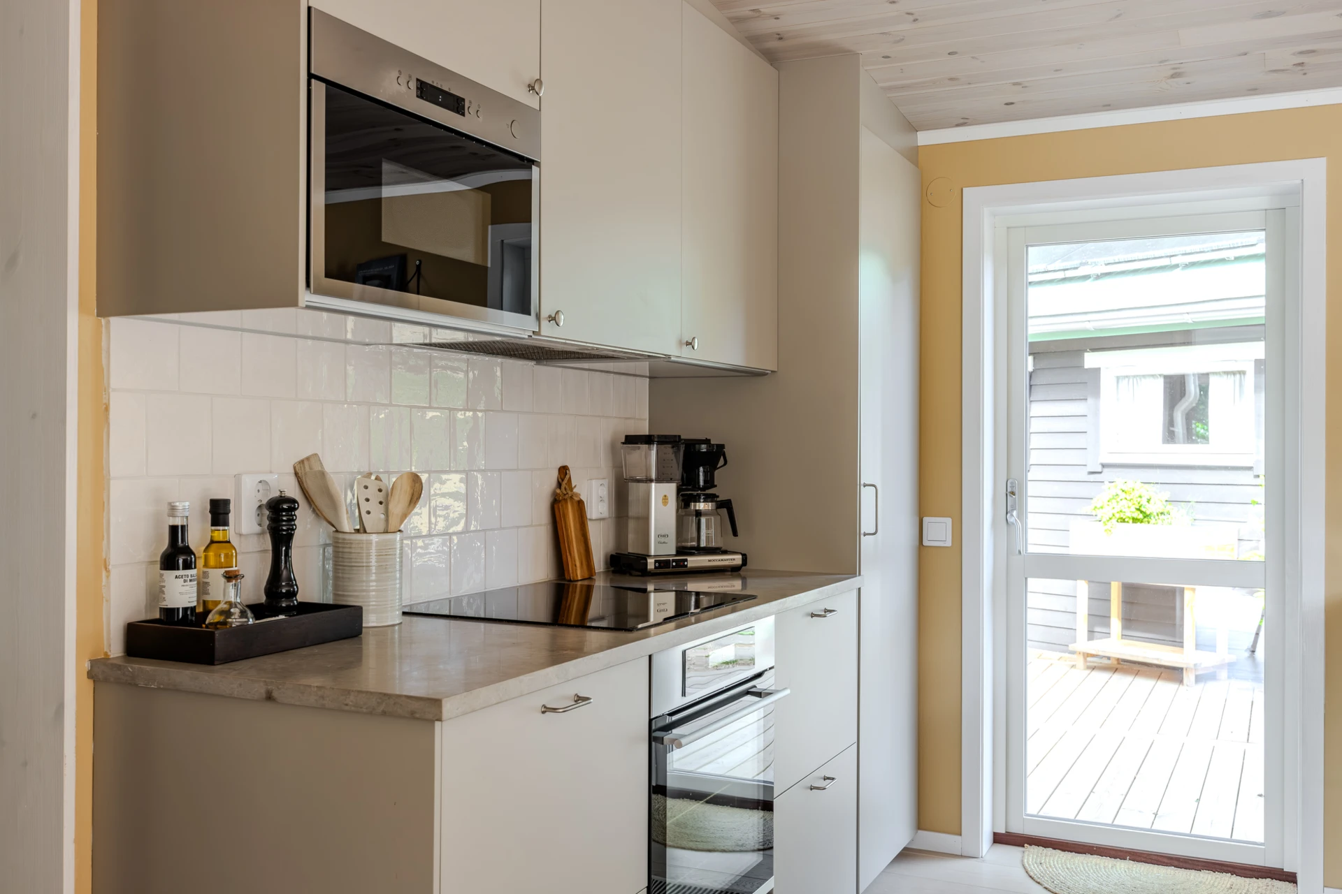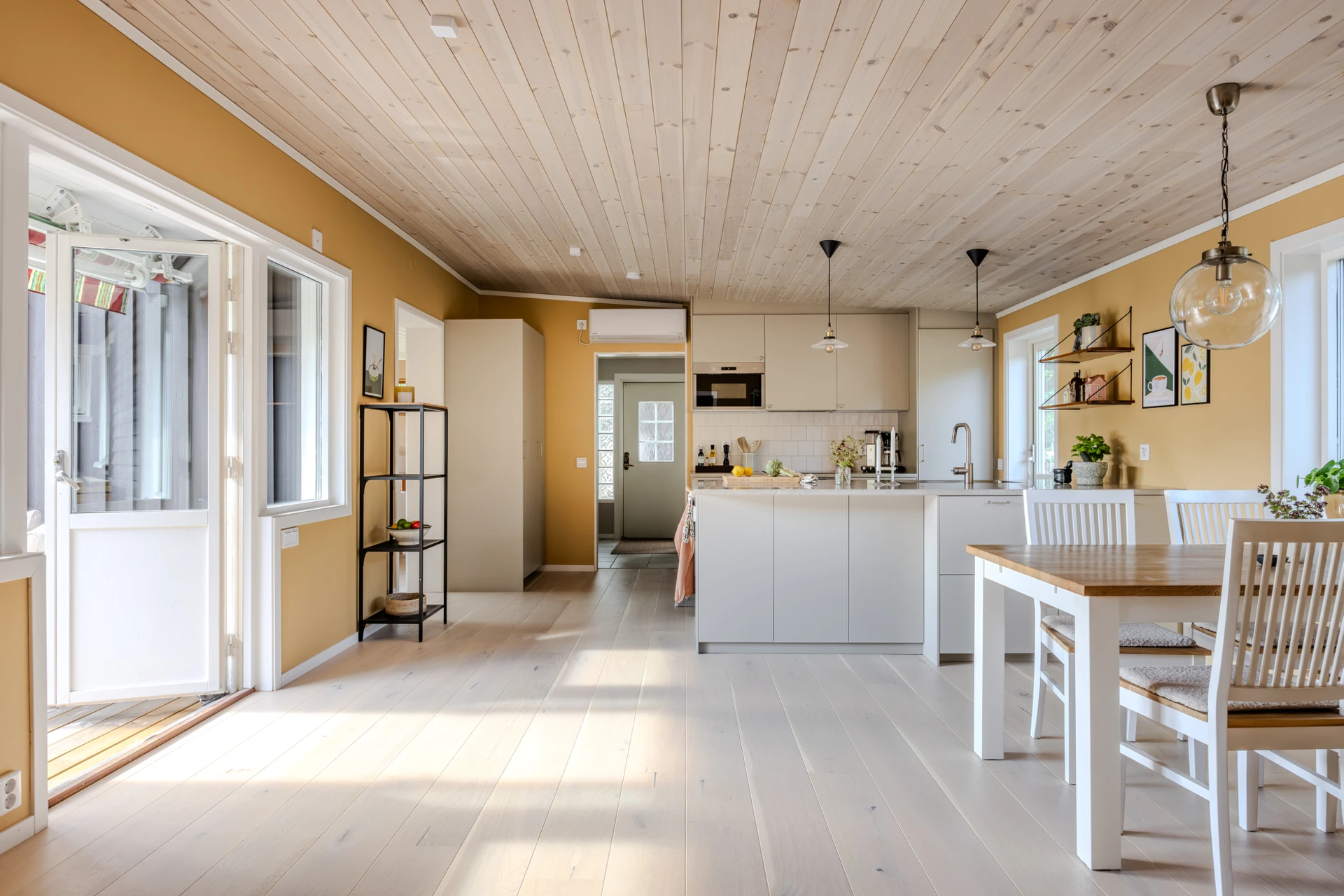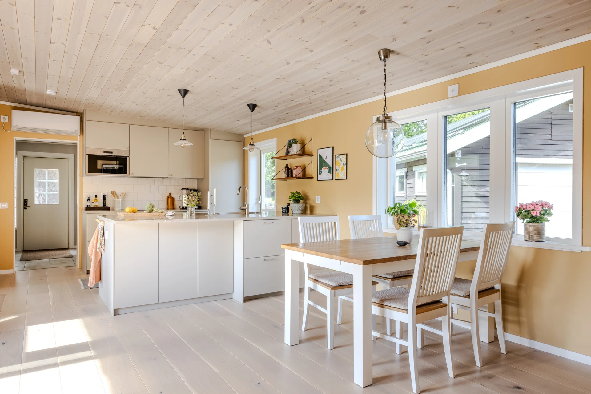 Parkettgolv och gula väggar. Köksinredning i beigt och ovanför arbetsbänken i natursten sitter vitt kakel. Köket är utrustat med kyl och frys i fullhöjd, induktionshäll, ugn, fläkt, inbyggd mikro, skafferi och diskmaskin. Matplats för stort sällskap. Här finns även en braskamin. Härifrån nås bostadens båda altaner.