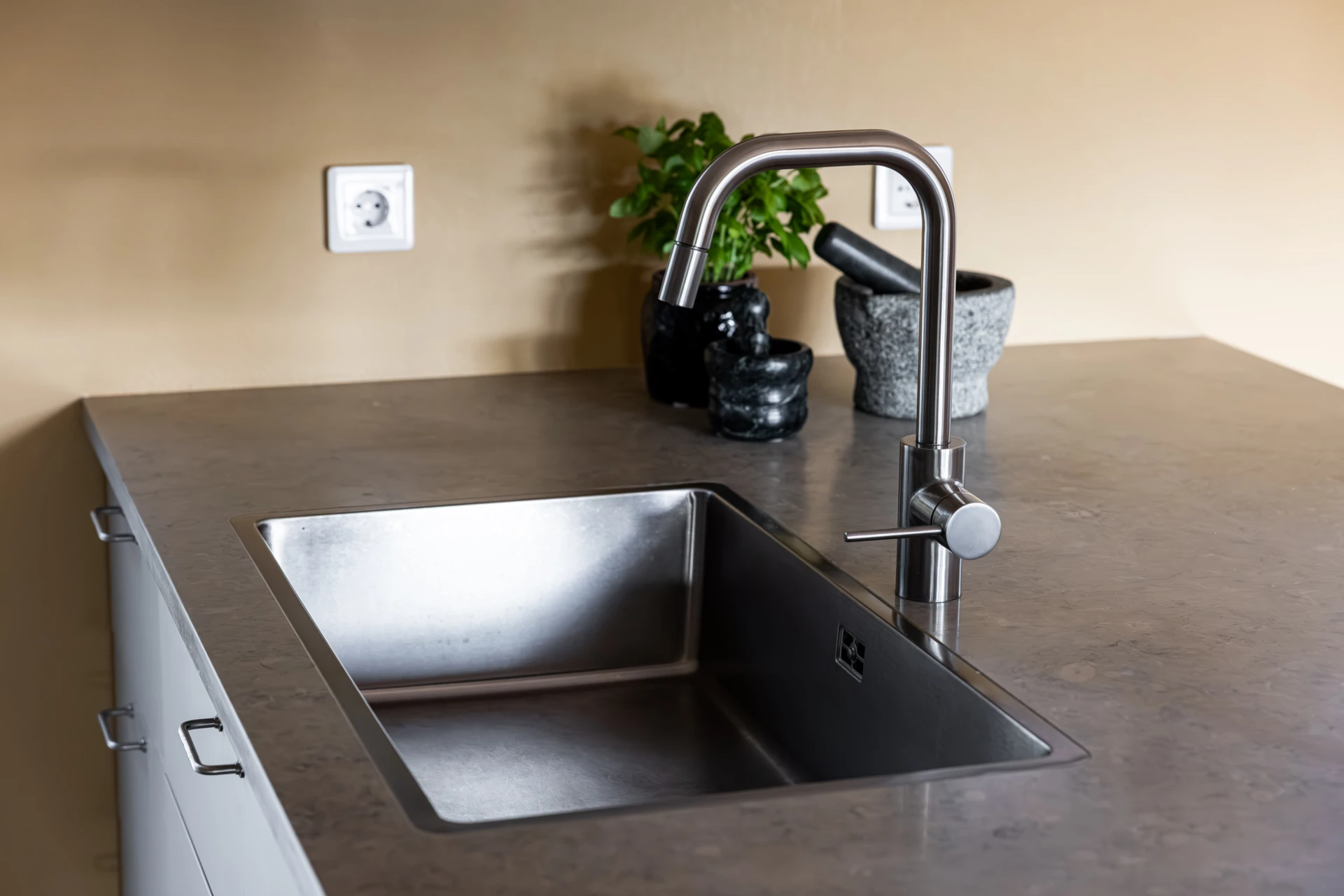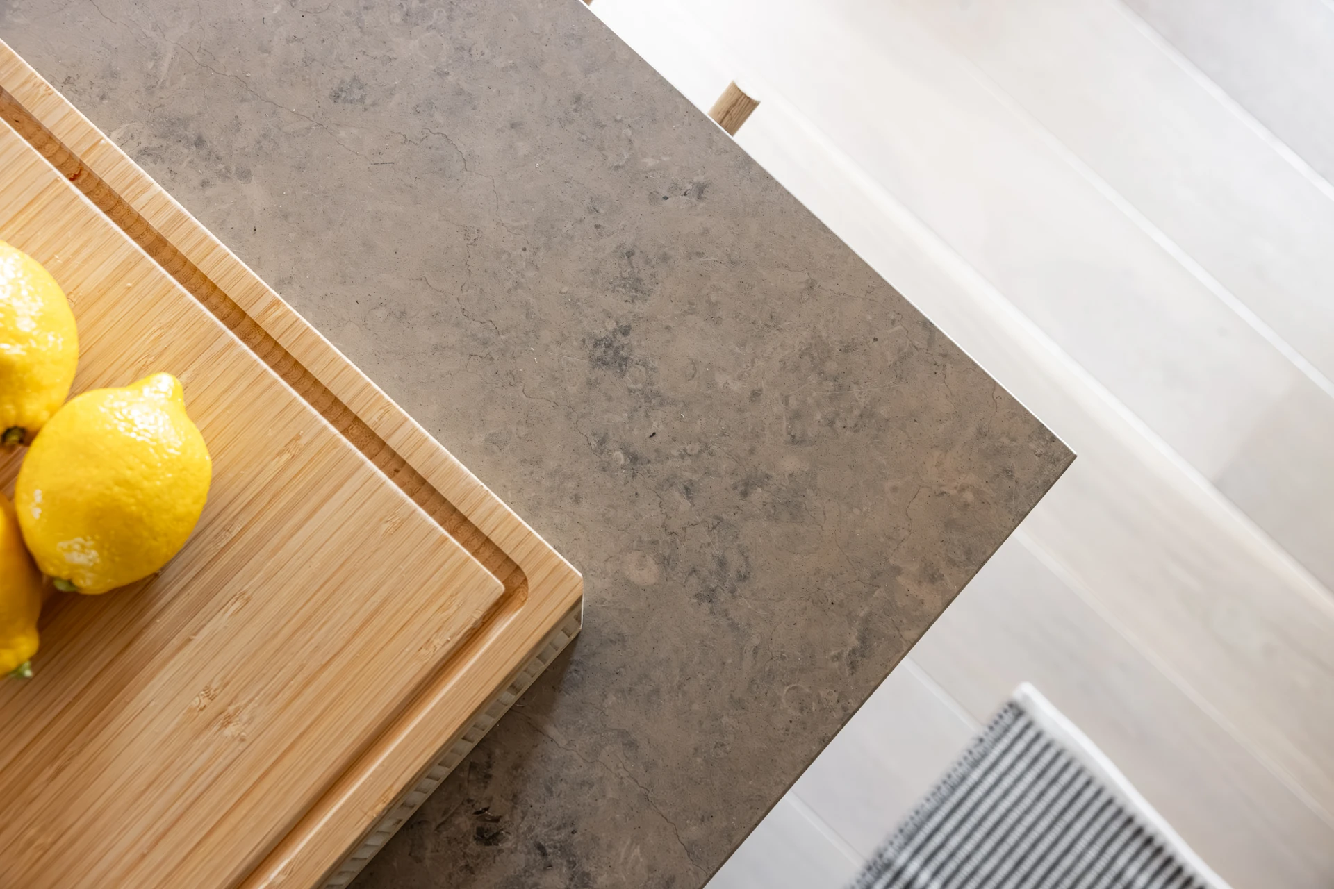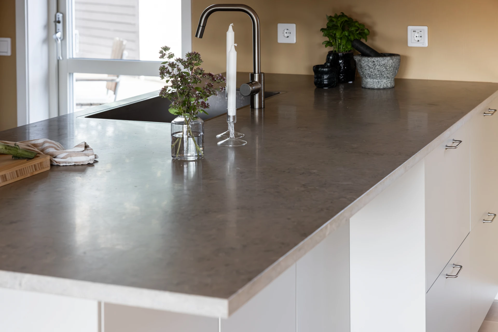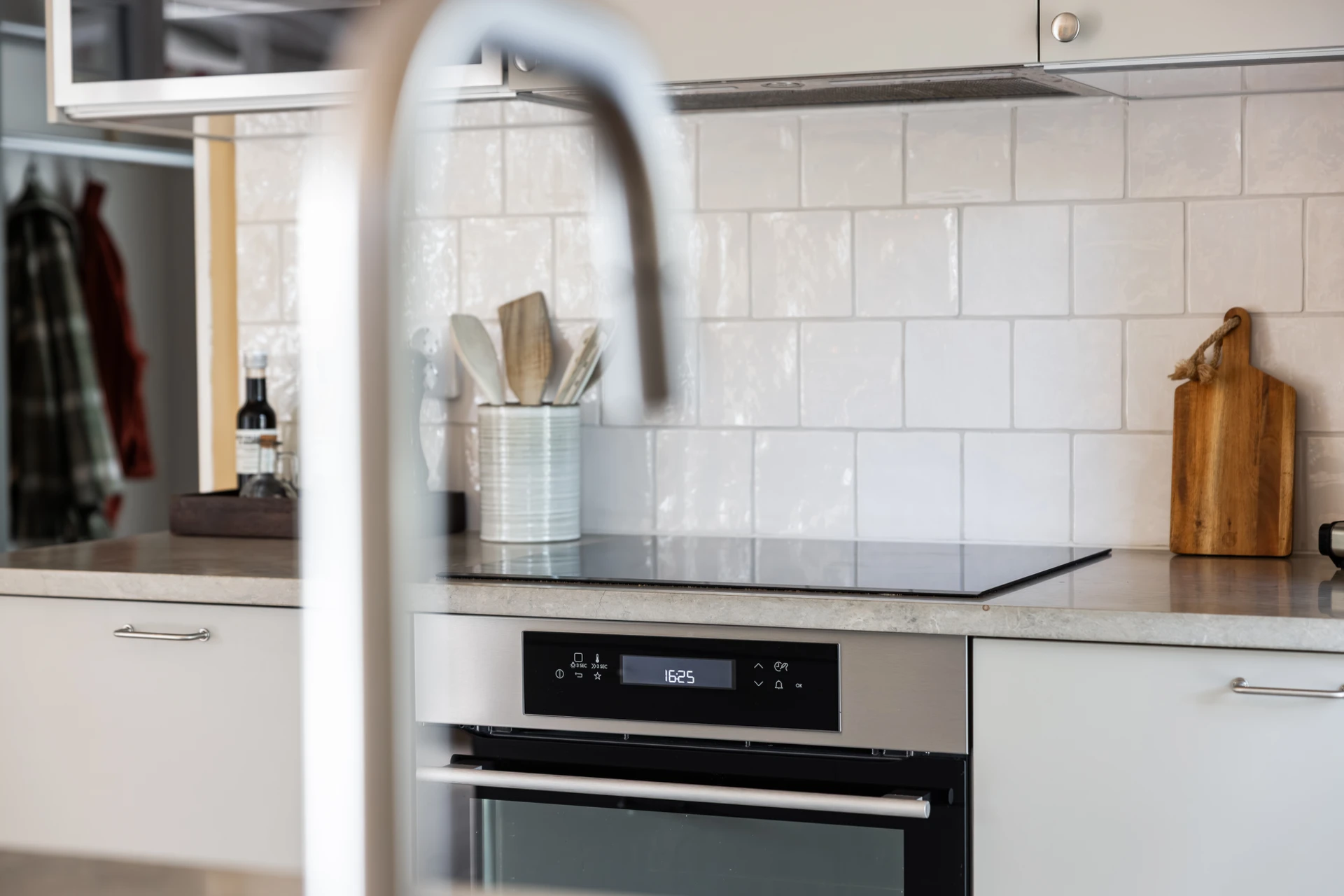 Parkettgolv och gula väggar. Köksinredning i beigt och ovanför arbetsbänken i natursten sitter vitt kakel. Köket är utrustat med kyl och frys i fullhöjd, induktionshäll, ugn, fläkt, inbyggd mikro, skafferi och diskmaskin. Matplats för stort sällskap. Här finns även en braskamin. Härifrån nås bostadens båda altaner.