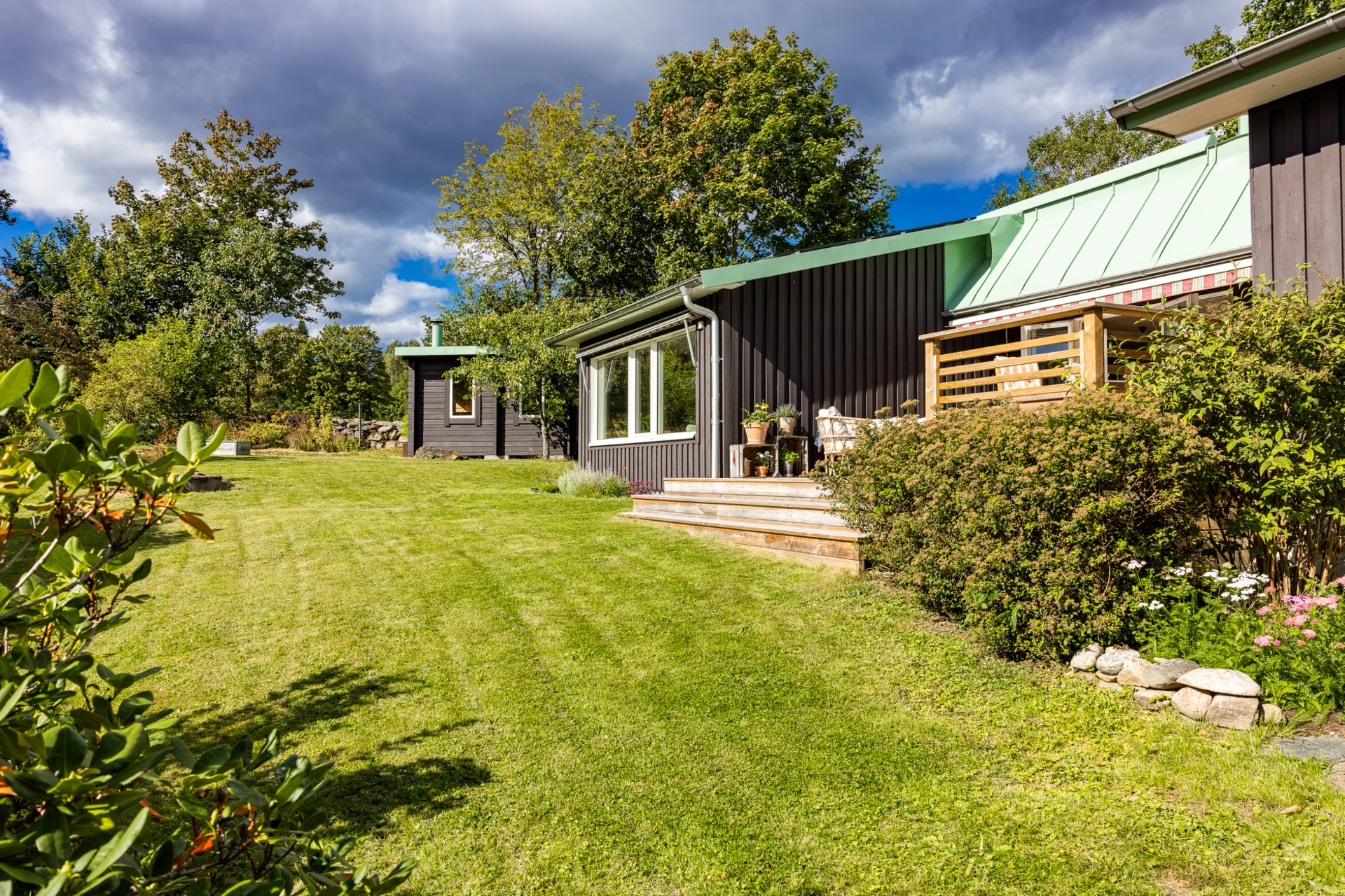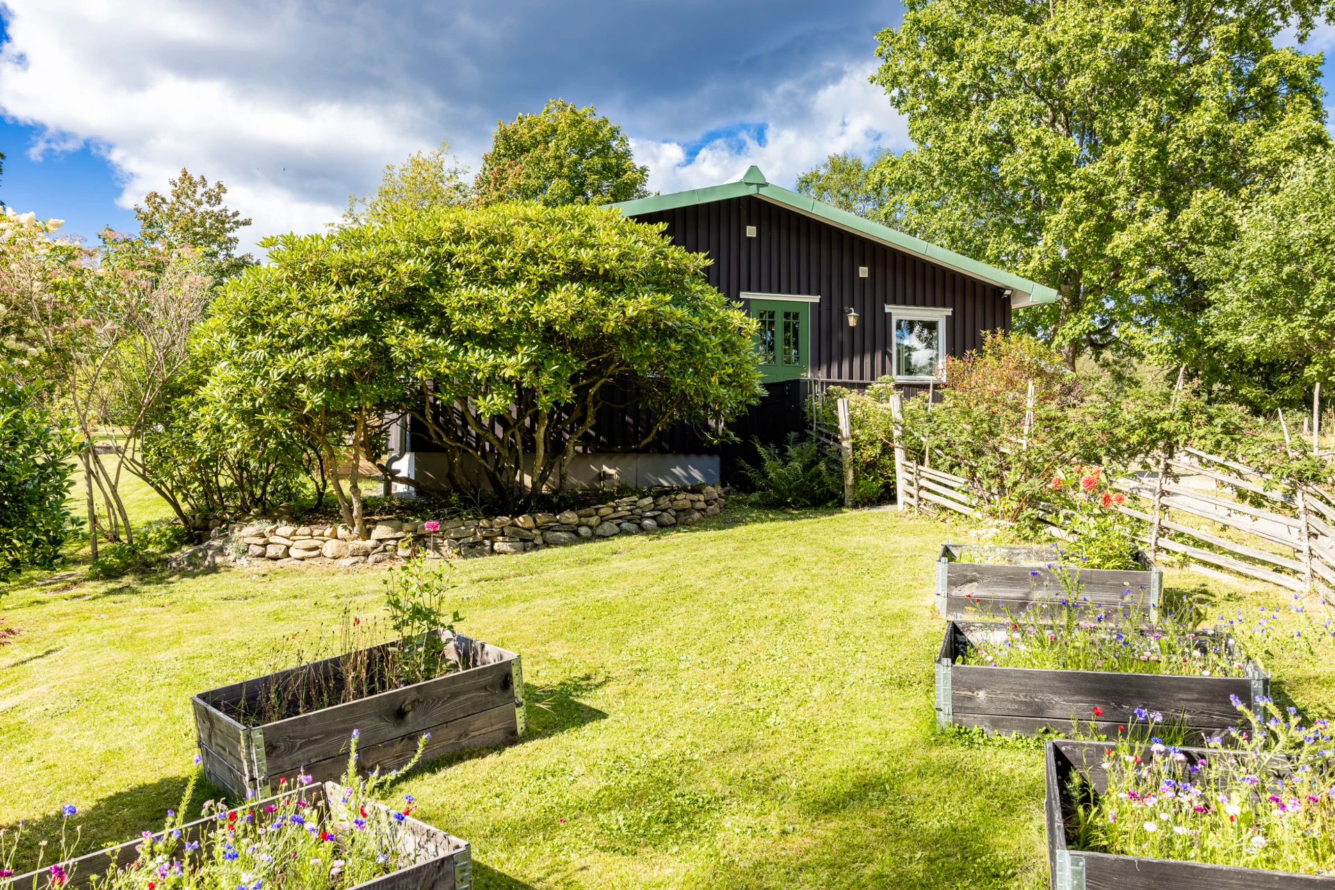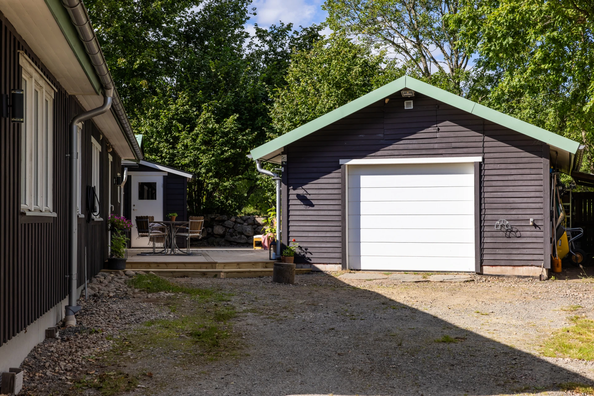 Stort garage med elektrisk port som ger plats åt en bil. Förvaring sker i hyllor längs hela väggarna.