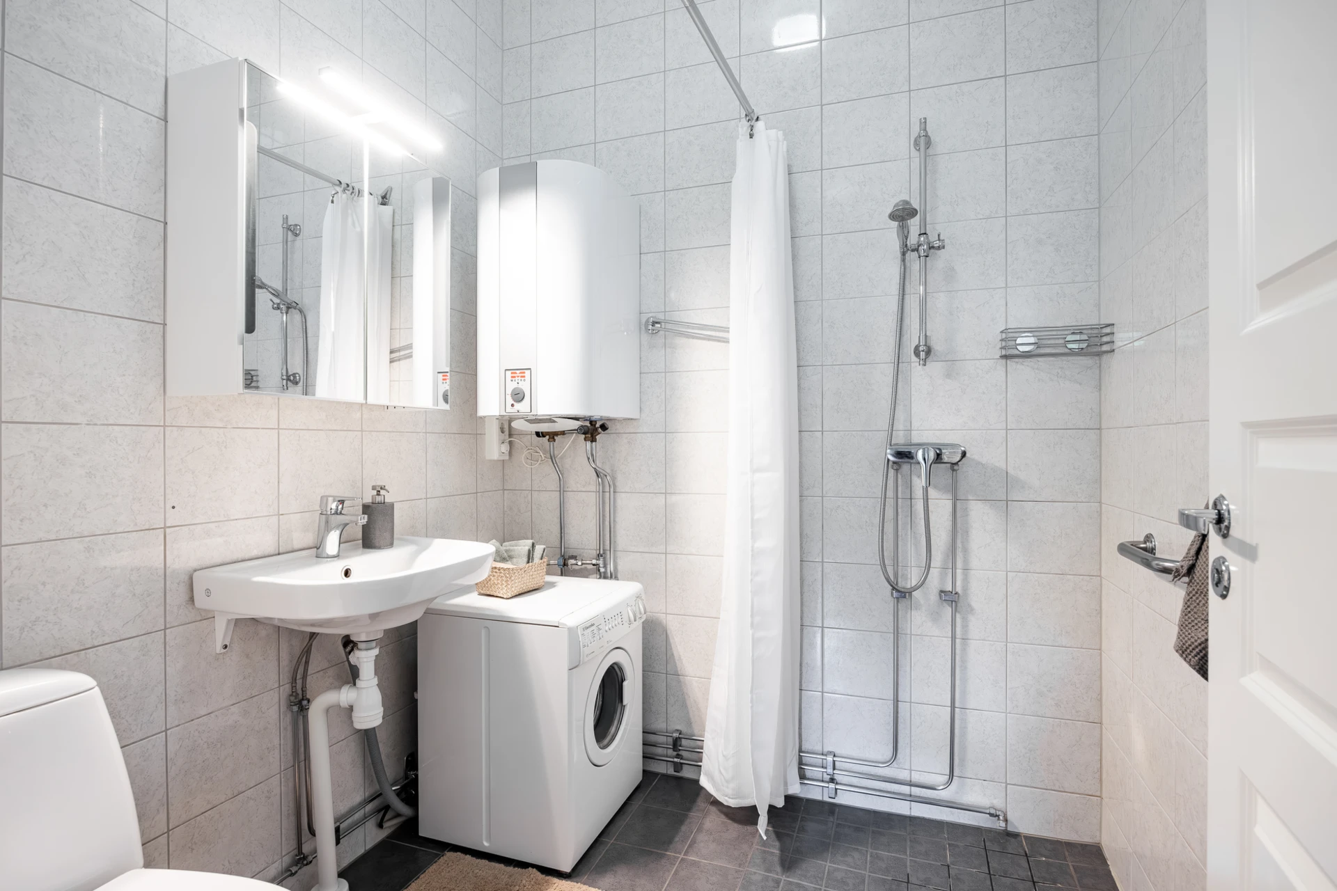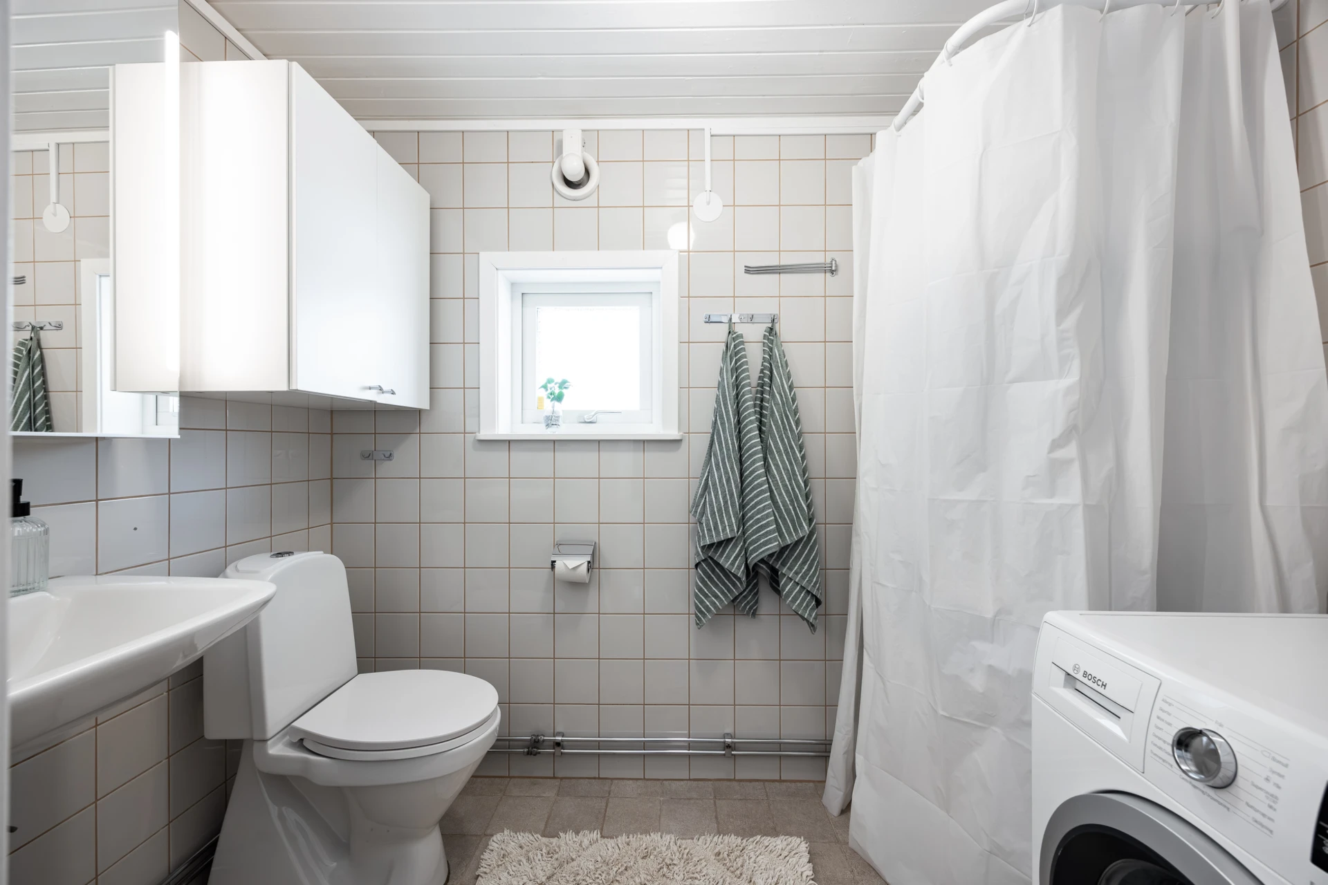 Grått klinkergolv med golvvärme och helkaklade väggar i vitt med grå nyans. Badrummet är utrustat med WC, handfat, spegelskåp, dusch och tvättmaskin. Här finns även ett vädringsfönster som bidrar med naturligt ljus.
