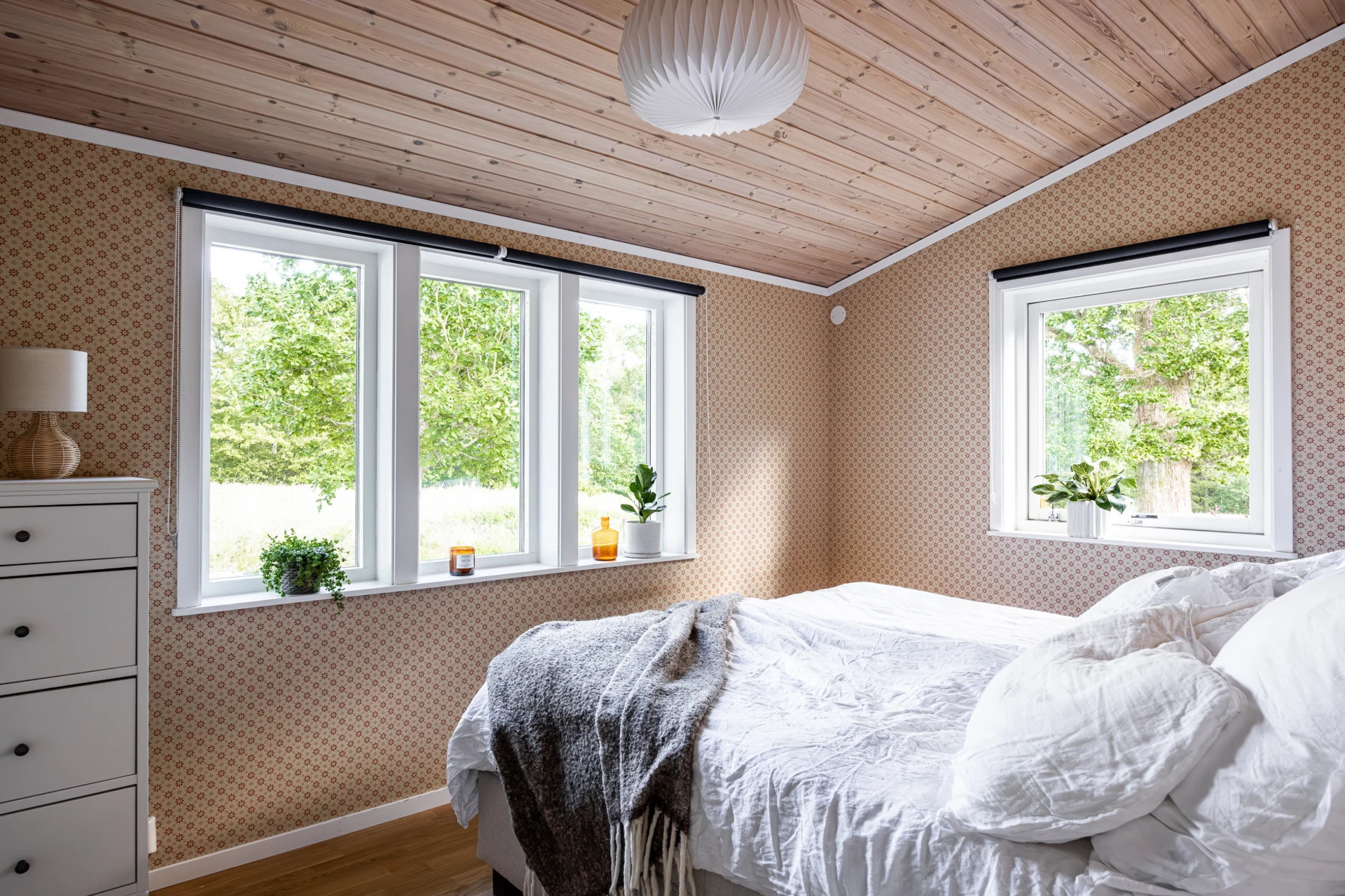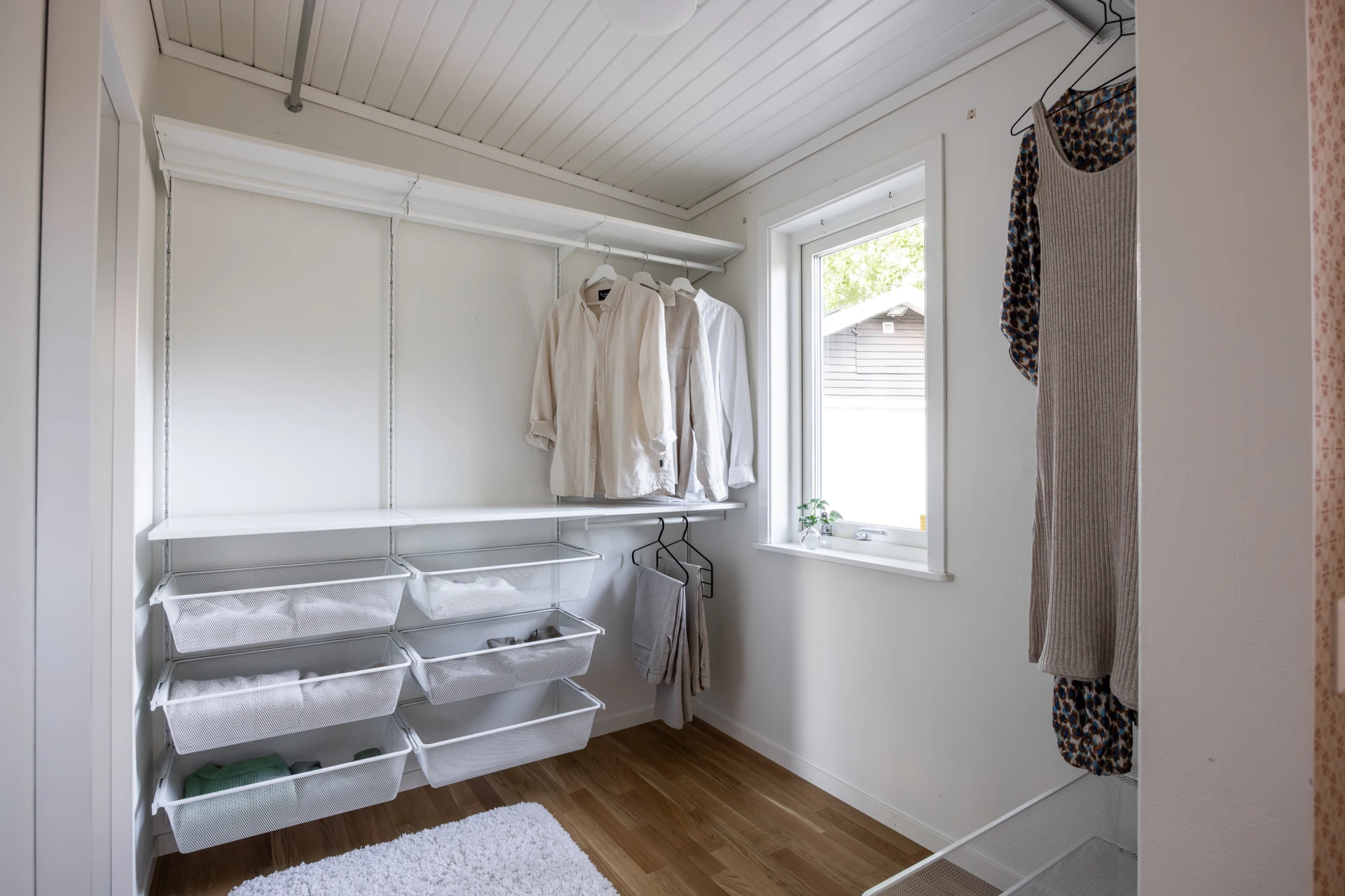 Parkettgolv och tapetserade väggar. Här finns plats för dubbelsäng med tillhörande möblemang. Förvaring sker i en klädkammare / walk in closet.