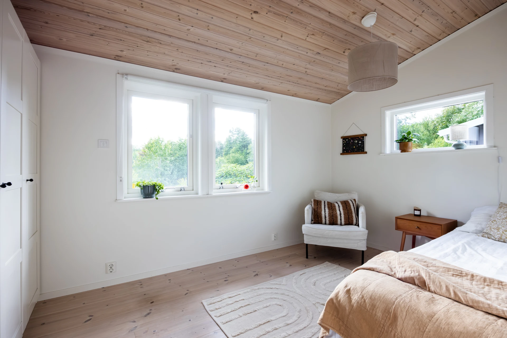 Ljust trägolv och ljusa väggar. Här finns plats för säng med tillhörande möblemang.