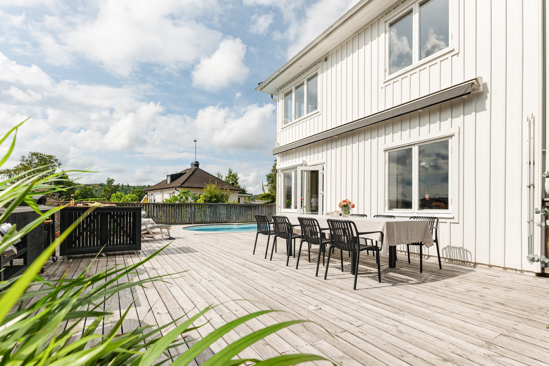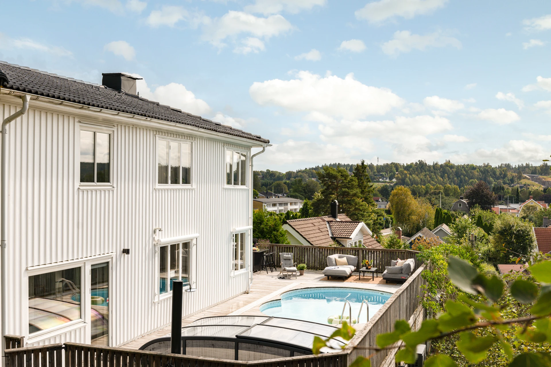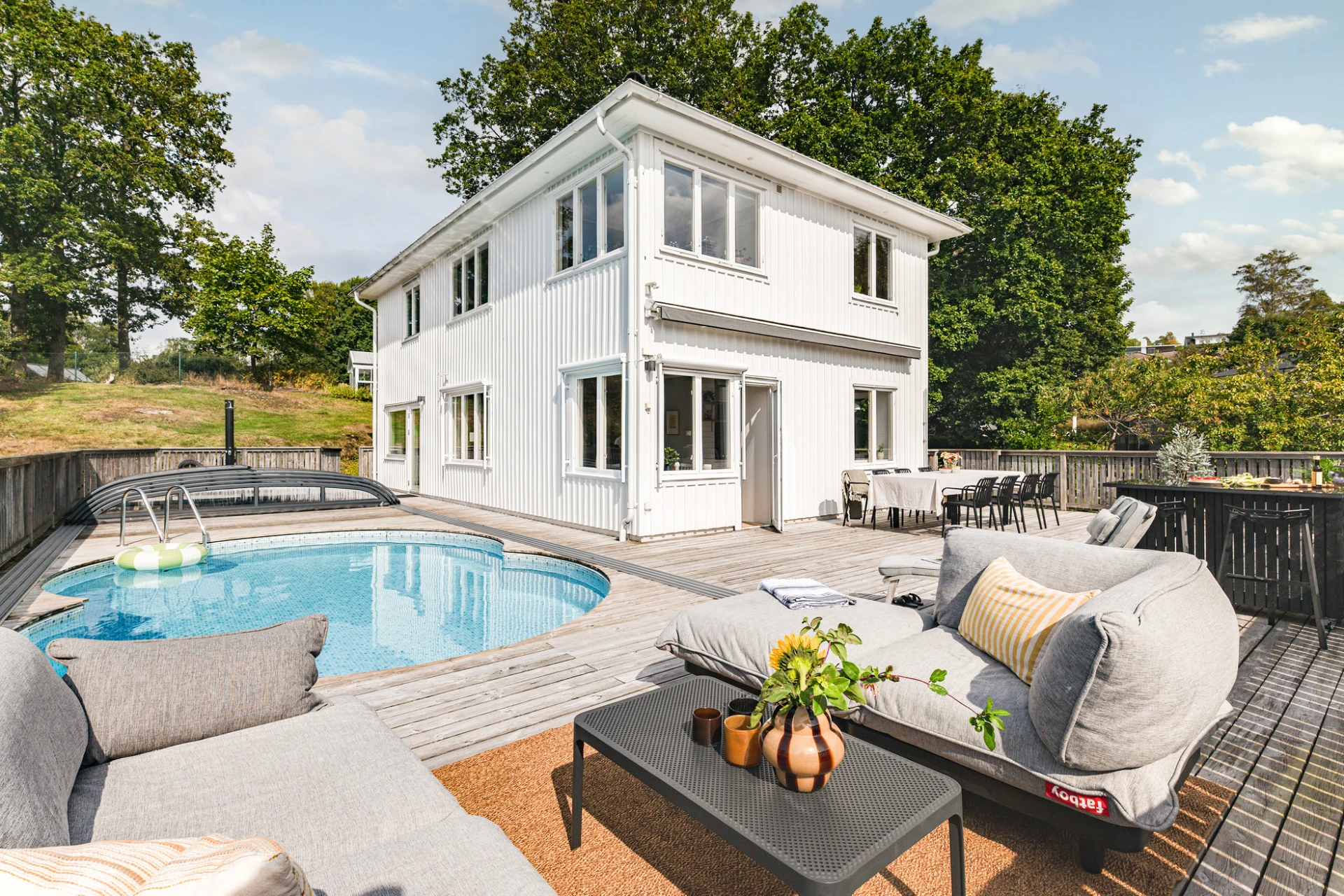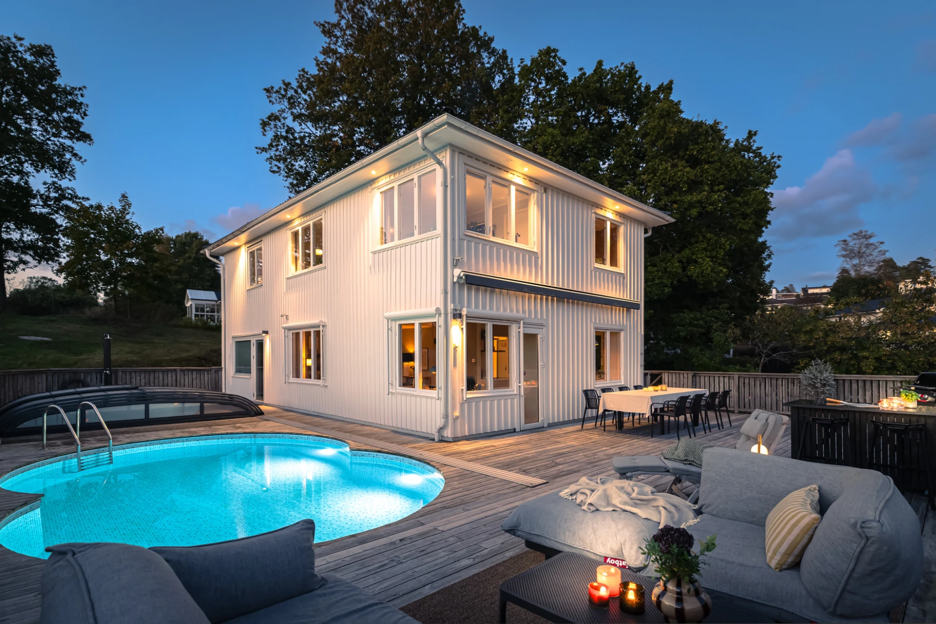Utemiljön är något alldeles extra. Tack vare husets höga placering kan du följa solen från morgon till kväll, samtidigt som det insynsskyddade läget skapar en privat och rogivande oas. Här väntar frukost i morgonsolen, långa middagar på altanen och svalkande dopp i poolen. Pooldäcket blir husets självklara hjärta under sommarhalvåret, men är en trivsam plats att njuta av långt in på hösten – och för den som vill, även vintertid.