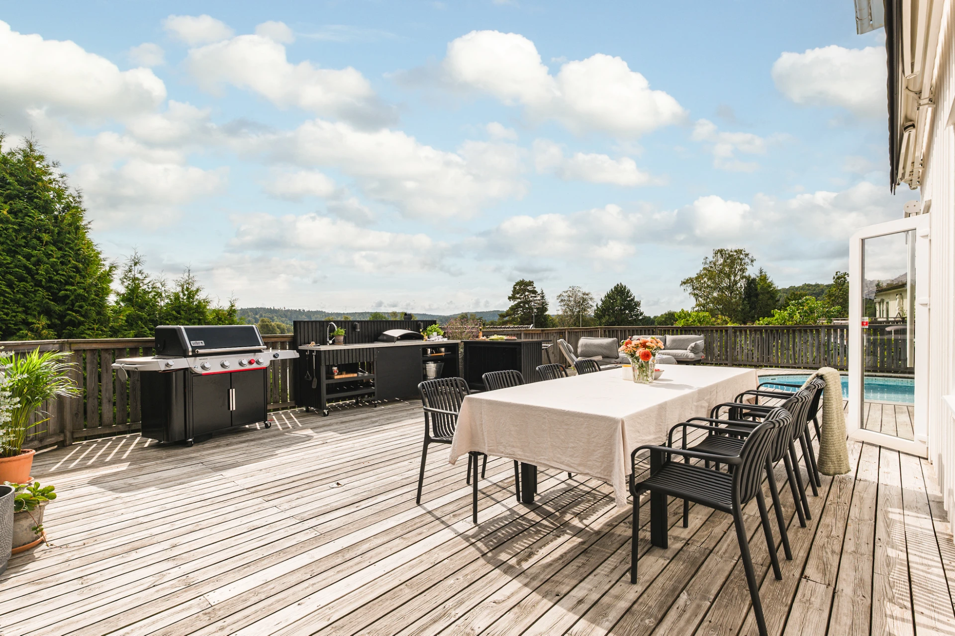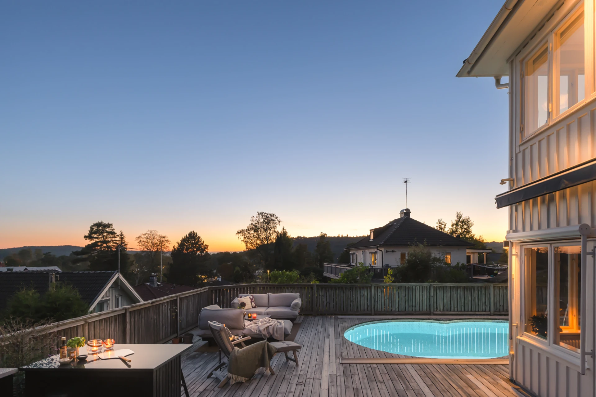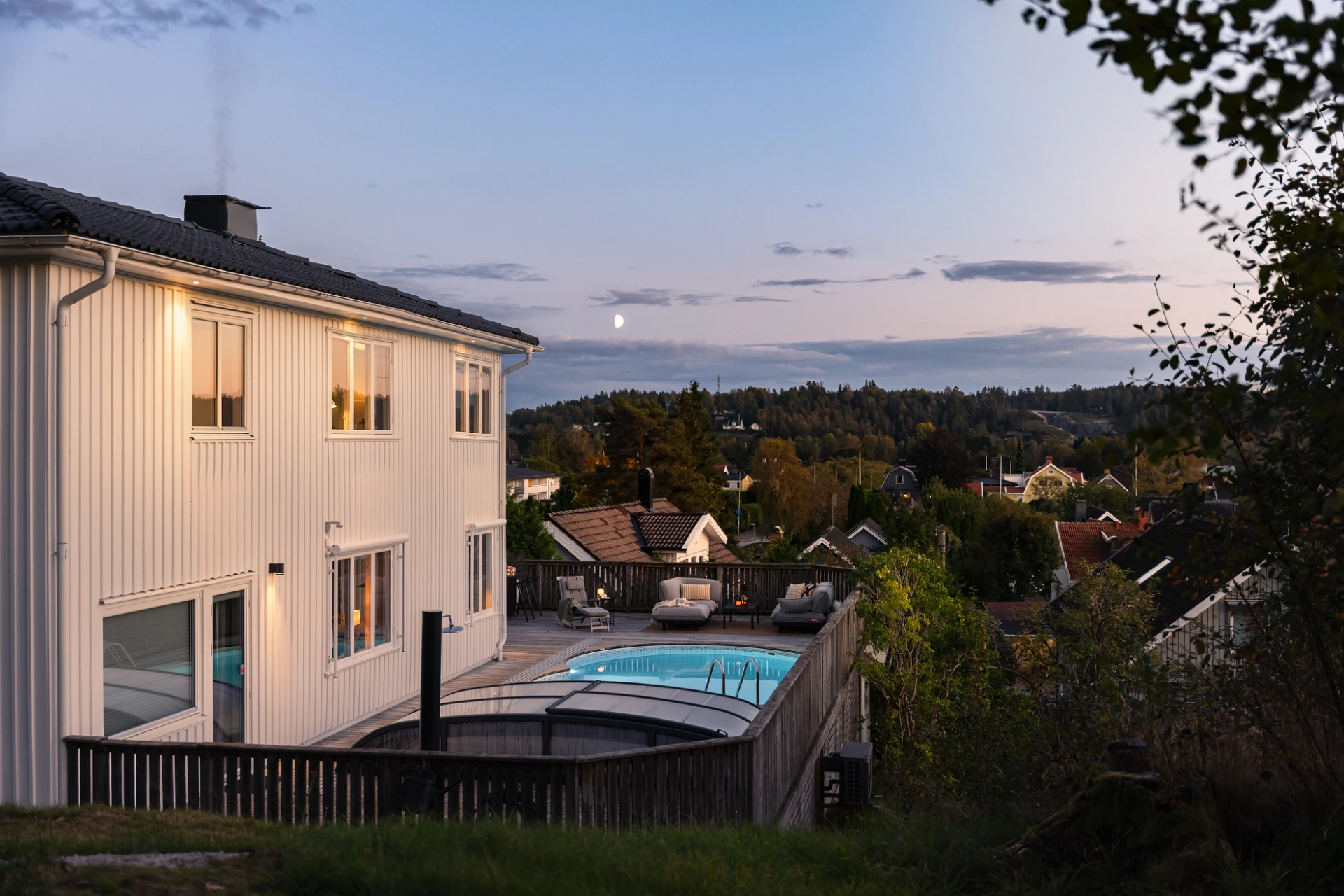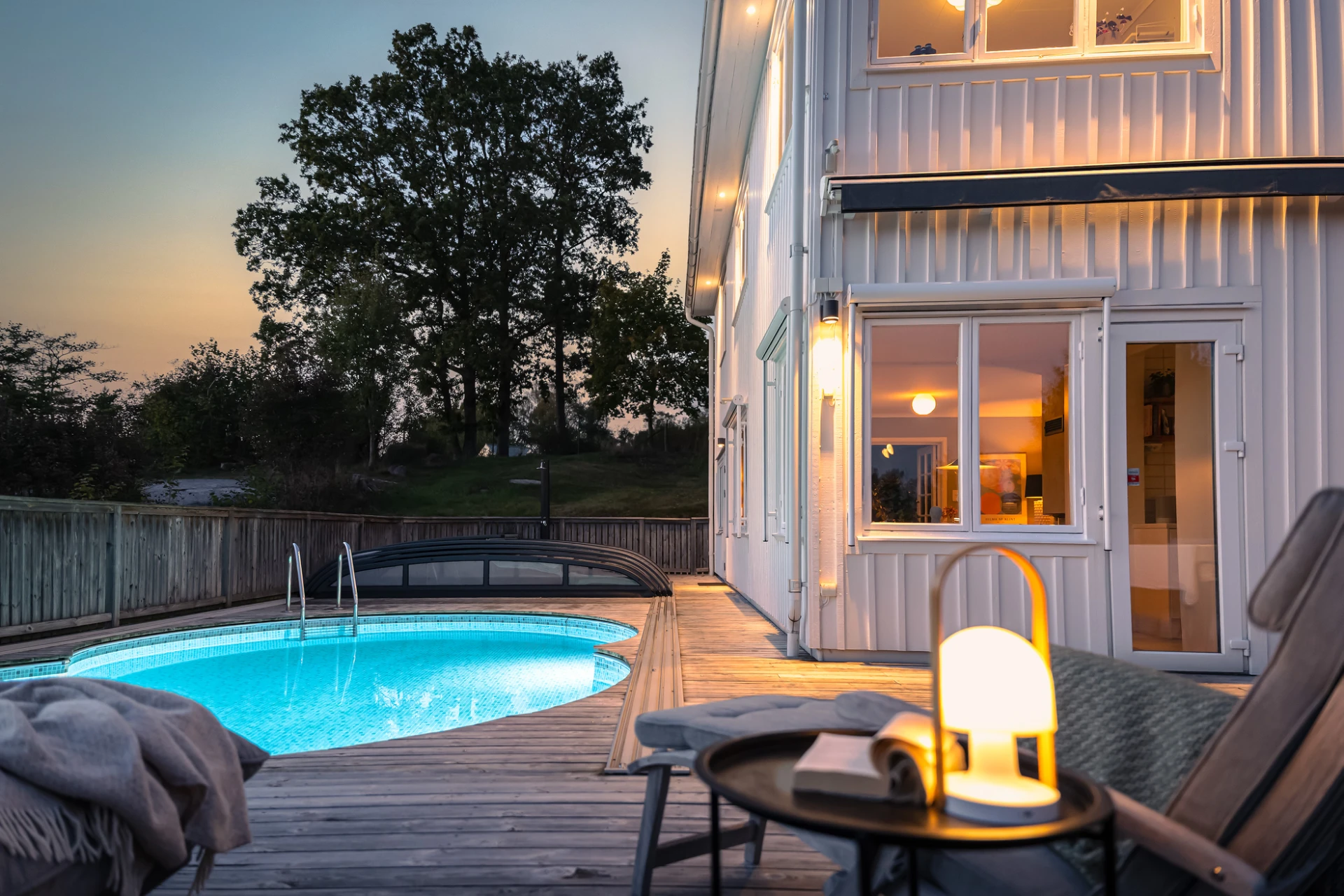 Utemiljön är något alldeles extra. Tack vare husets höga placering kan du följa solen från morgon till kväll, samtidigt som det insynsskyddade läget skapar en privat och rogivande oas. Här väntar frukost i morgonsolen, långa middagar på altanen och svalkande dopp i poolen. Pooldäcket blir husets självklara hjärta under sommarhalvåret, men är en trivsam plats att njuta av långt in på hösten – och för den som vill, även vintertid.