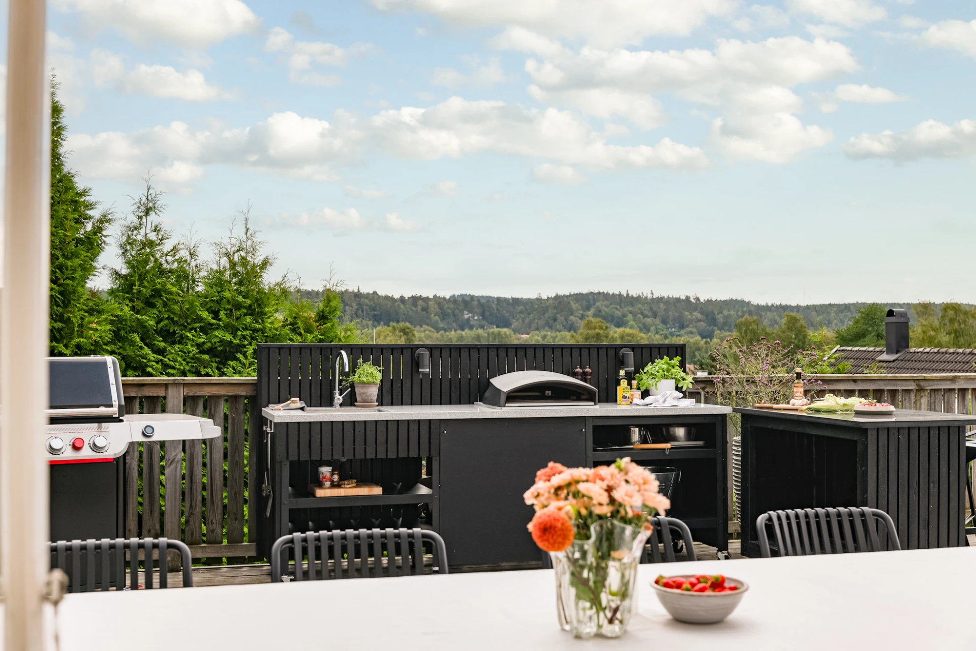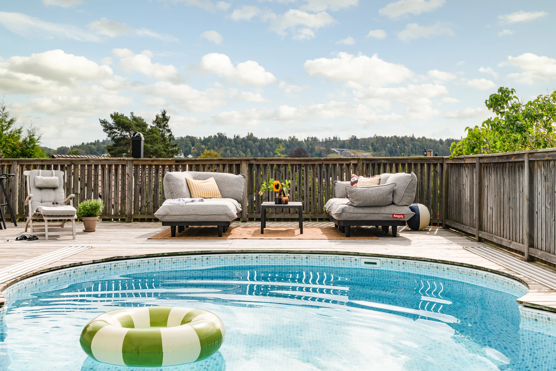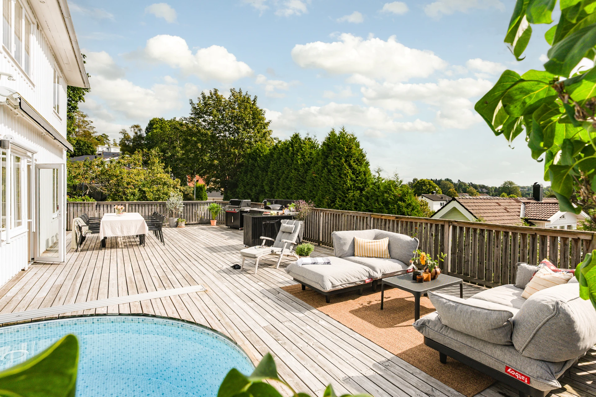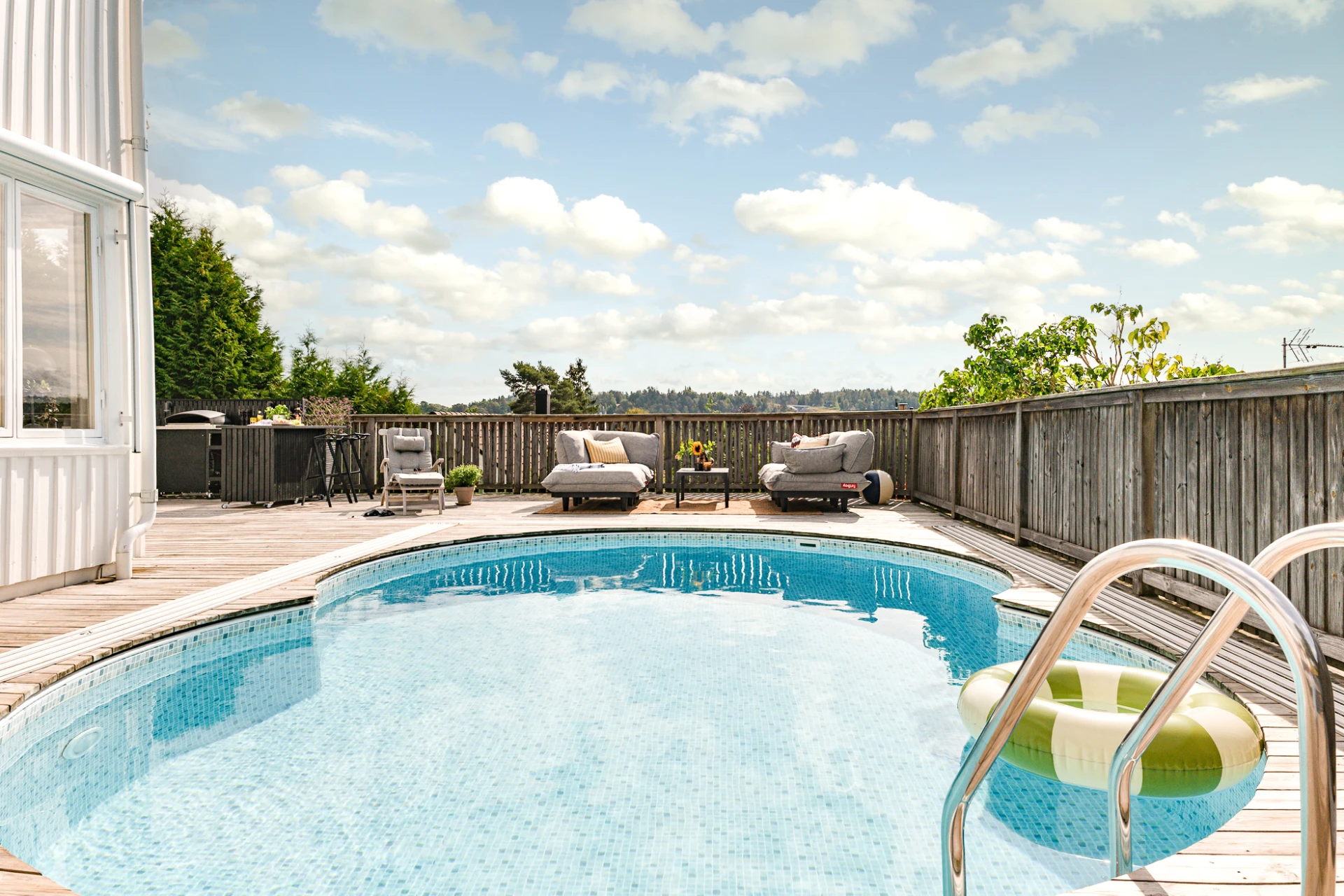 Utemiljön är något alldeles extra. Tack vare husets höga placering kan du följa solen från morgon till kväll, samtidigt som det insynsskyddade läget skapar en privat och rogivande oas. Här väntar frukost i morgonsolen, långa middagar på altanen och svalkande dopp i poolen. Pooldäcket blir husets självklara hjärta under sommarhalvåret, men är en trivsam plats att njuta av långt in på hösten – och för den som vill, även vintertid.