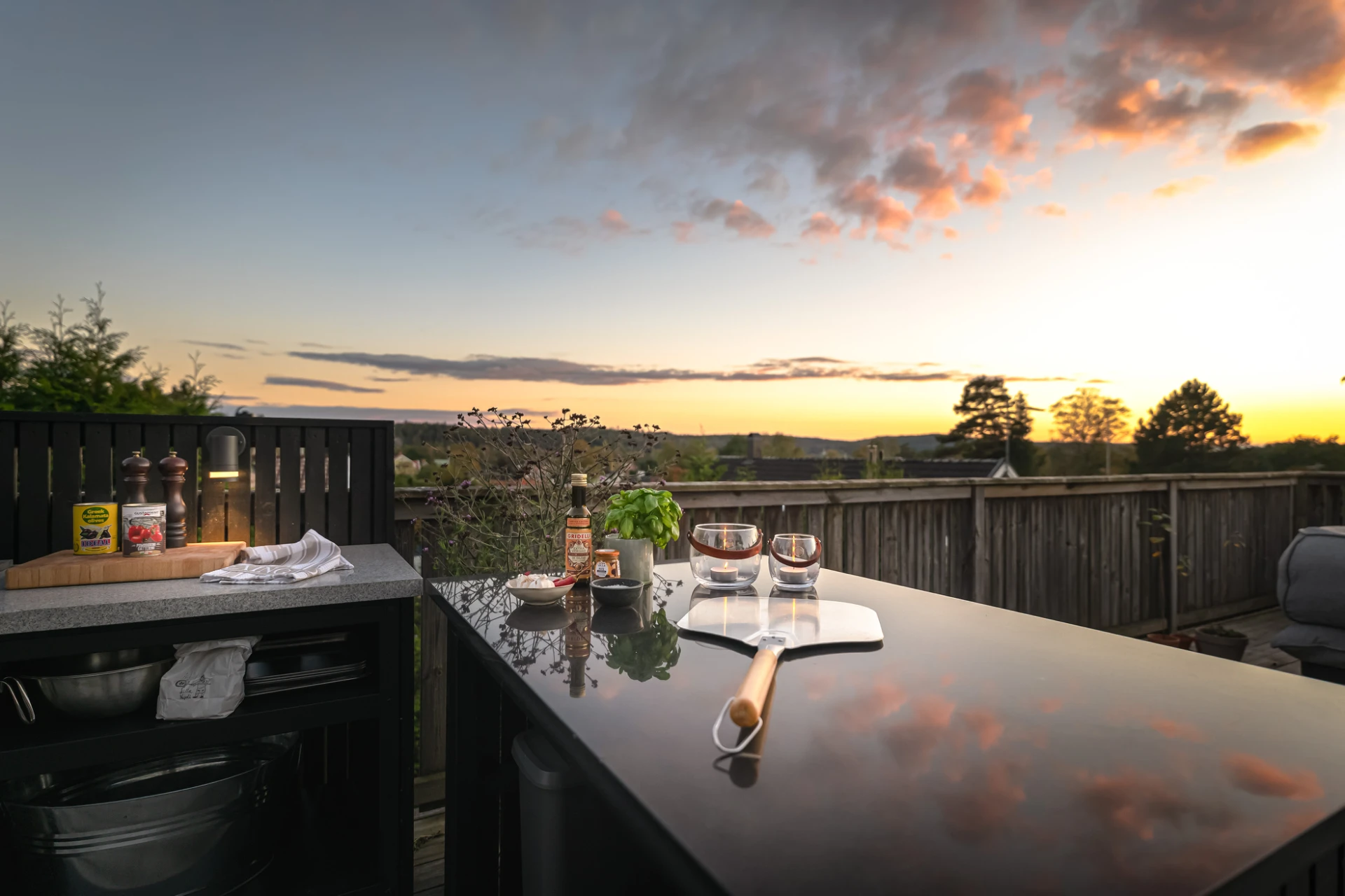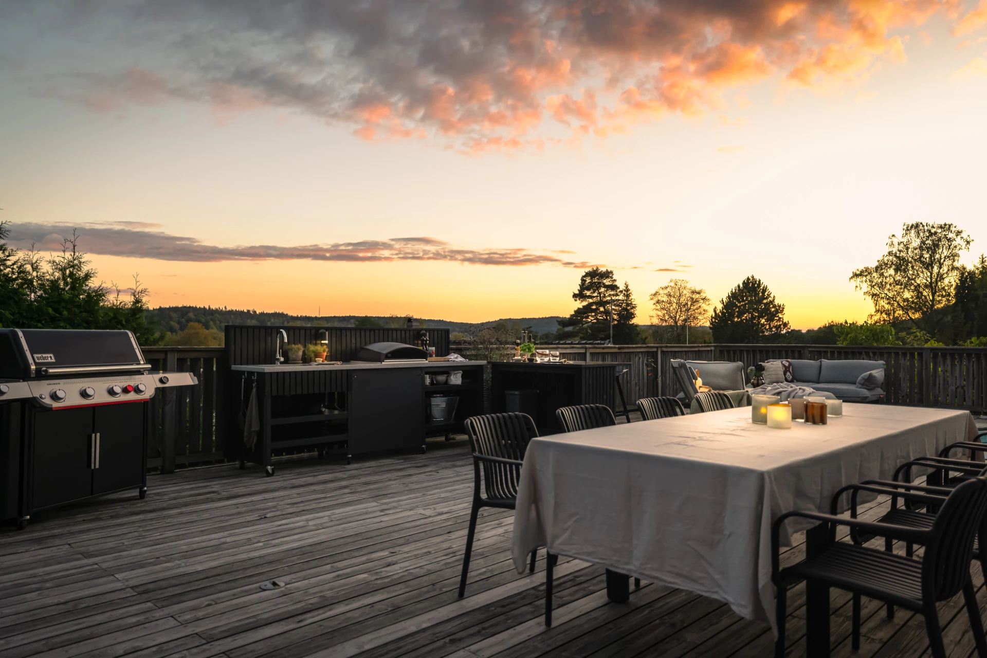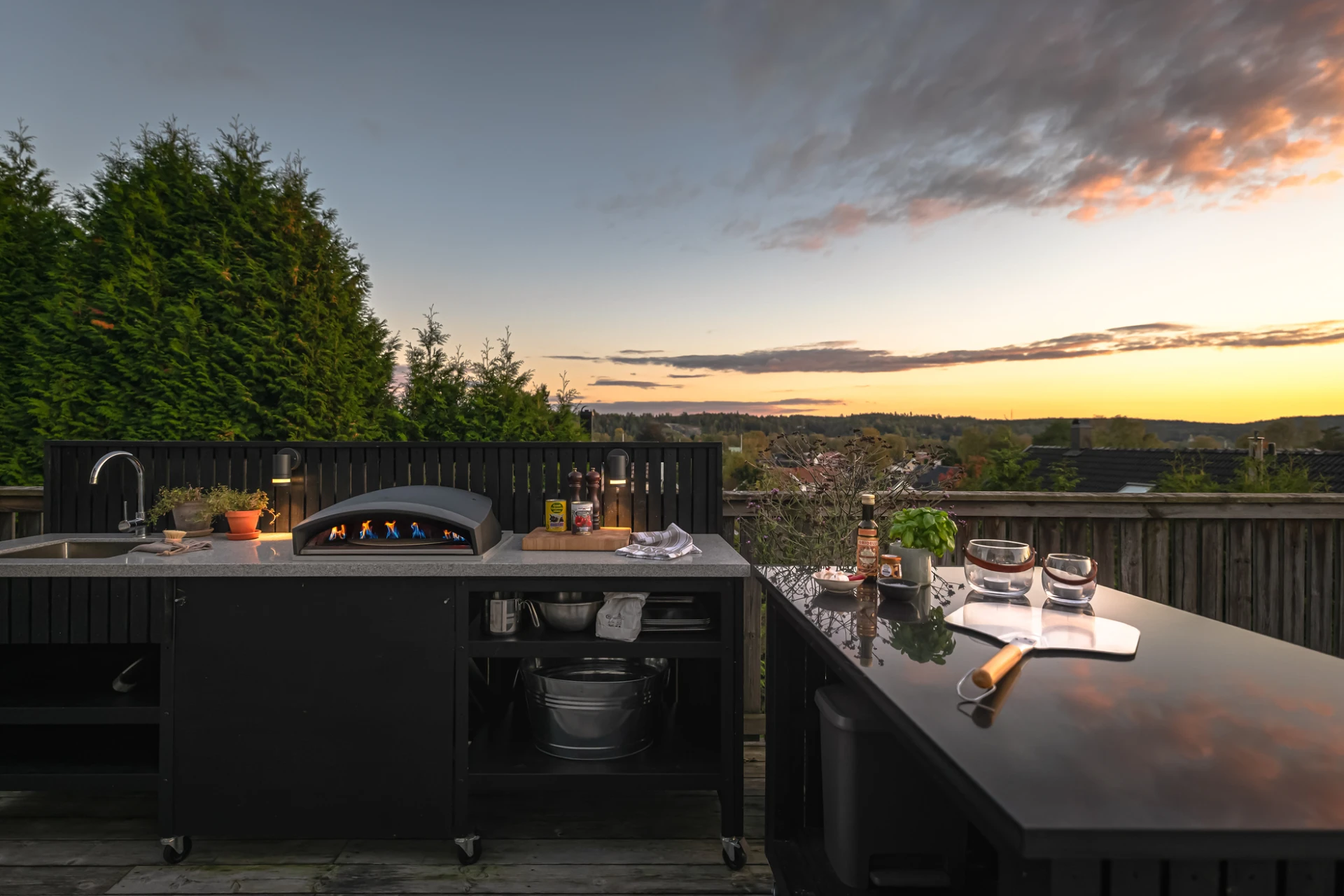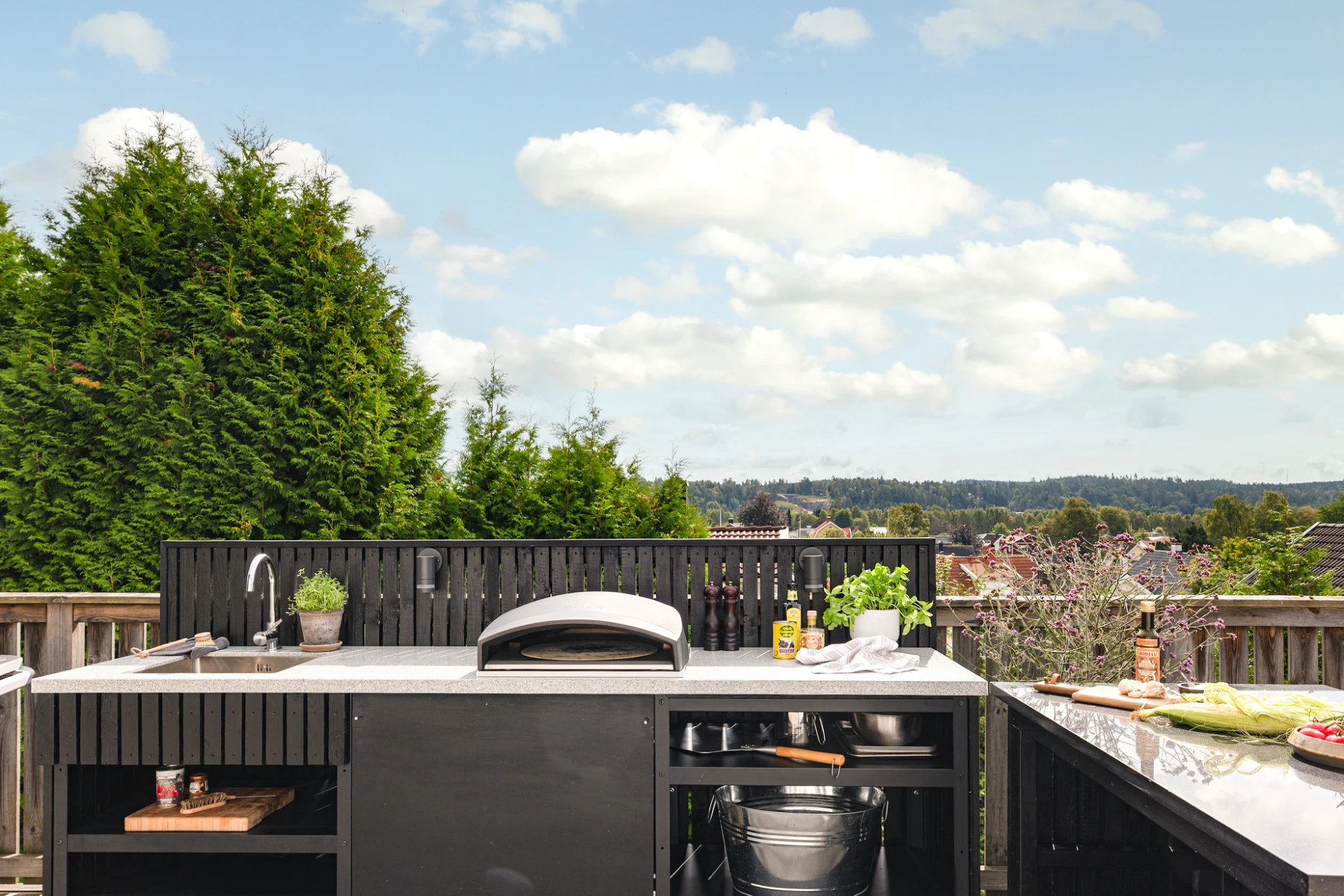 Utemiljön är något alldeles extra. Tack vare husets höga placering kan du följa solen från morgon till kväll, samtidigt som det insynsskyddade läget skapar en privat och rogivande oas. Här väntar frukost i morgonsolen, långa middagar på altanen och svalkande dopp i poolen. Pooldäcket blir husets självklara hjärta under sommarhalvåret, men är en trivsam plats att njuta av långt in på hösten – och för den som vill, även vintertid.
