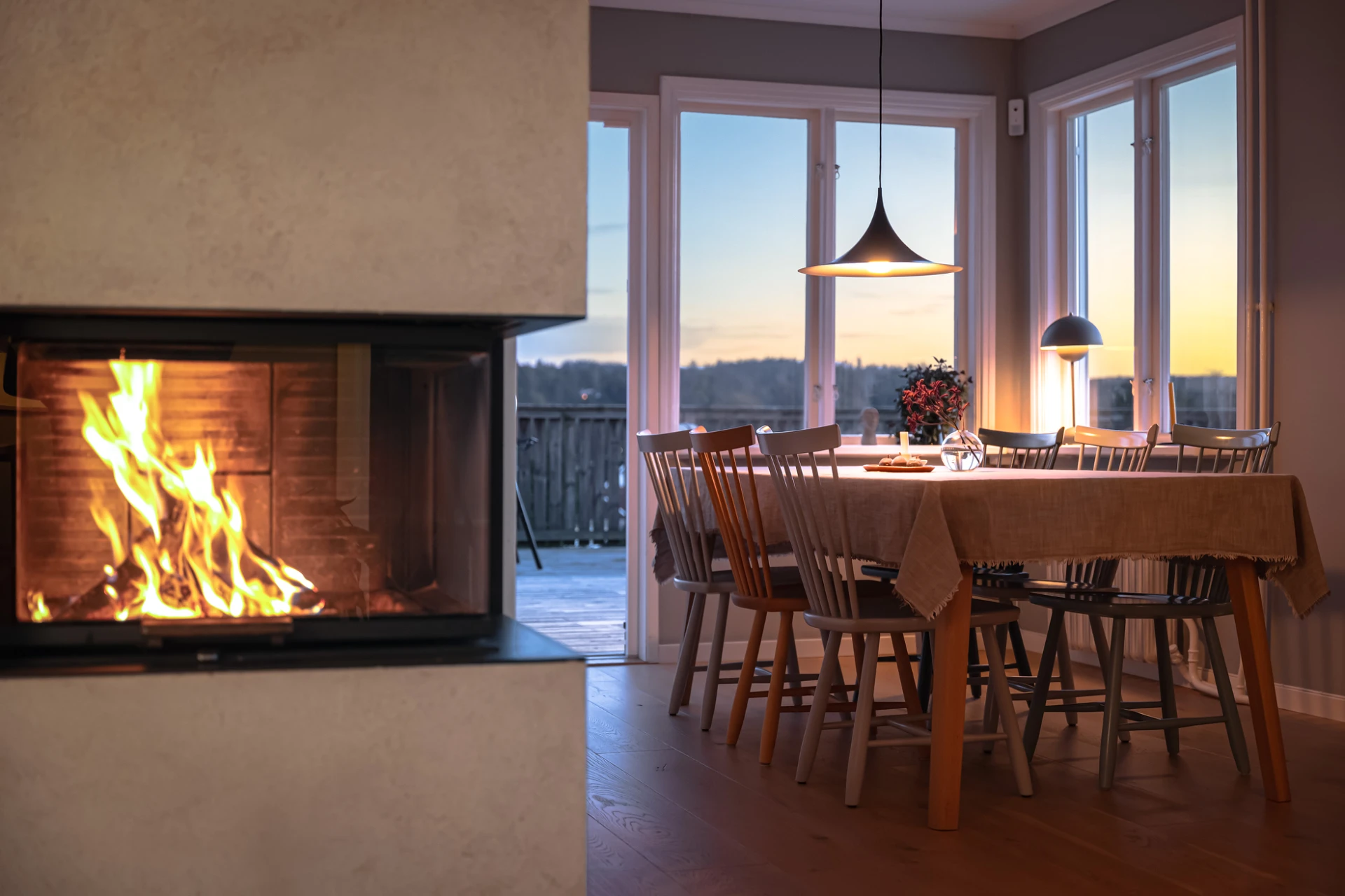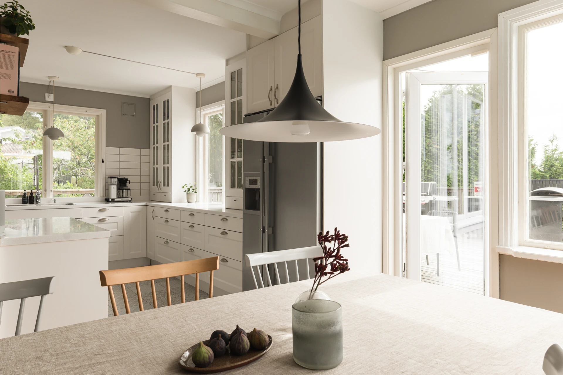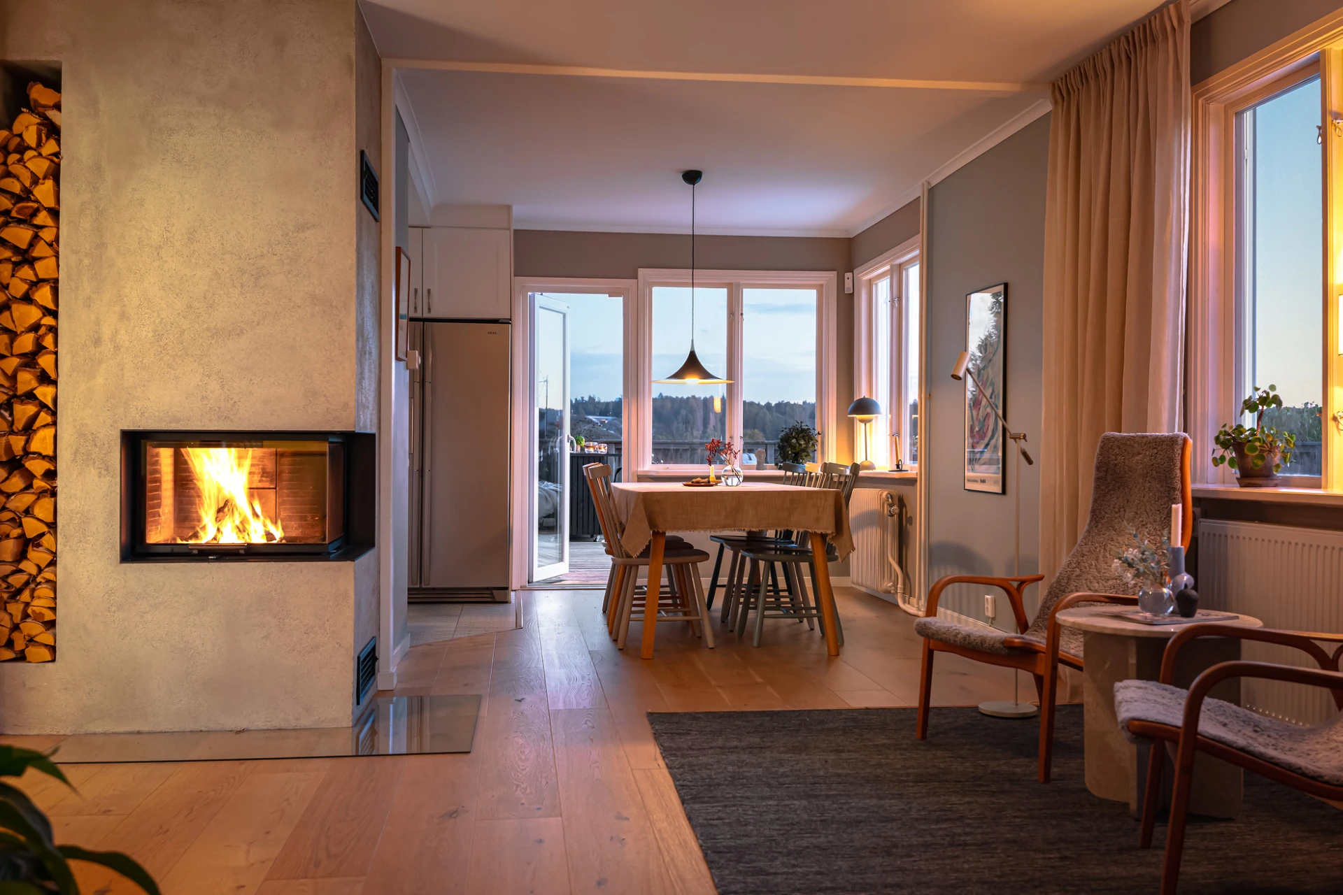Köket i herrgårdsstil, byggt 2014, är en självklar mittpunkt. Här möter fullhöga luckor och arbetsytor i Corestone en genomtänkt planlösning som förenar funktion med estetik. Ljuset strömmar in från två väderstreck och ger köket en luftig karaktär. Från köket fortsätter flödet naturligt in i matsalen och vardagsrummet, där fönsterpartierna suddar ut gränsen mellan inne och ute. Den moderna kaminen i puts blir en stämningsfull detalj som sätter tonen för kvällar med både värme och atmosfär.