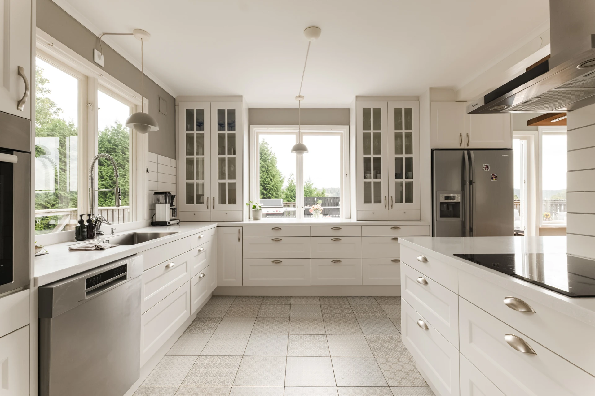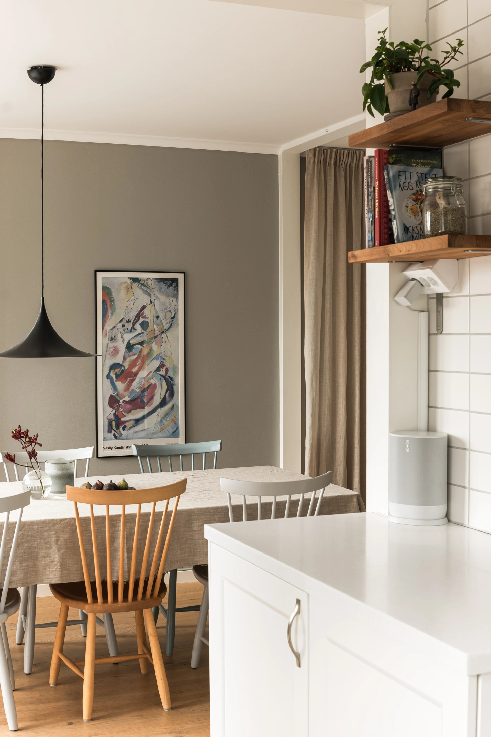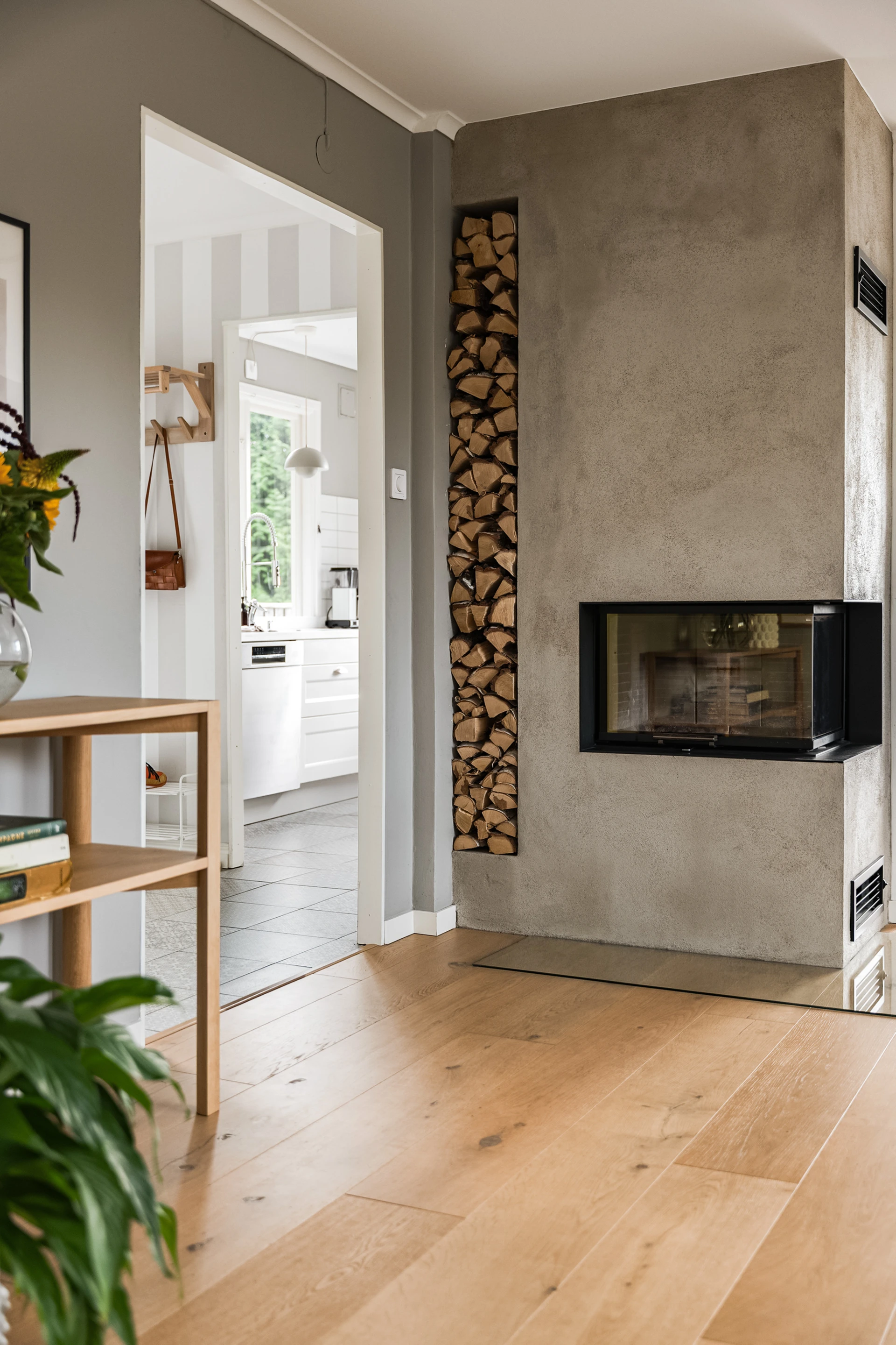 Köket i herrgårdsstil, byggt 2014, är en självklar mittpunkt. Här möter fullhöga luckor och arbetsytor i Corestone en genomtänkt planlösning som förenar funktion med estetik. Ljuset strömmar in från två väderstreck och ger köket en luftig karaktär. Från köket fortsätter flödet naturligt in i matsalen och vardagsrummet, där fönsterpartierna suddar ut gränsen mellan inne och ute. Den moderna kaminen i puts blir en stämningsfull detalj som sätter tonen för kvällar med både värme och atmosfär.