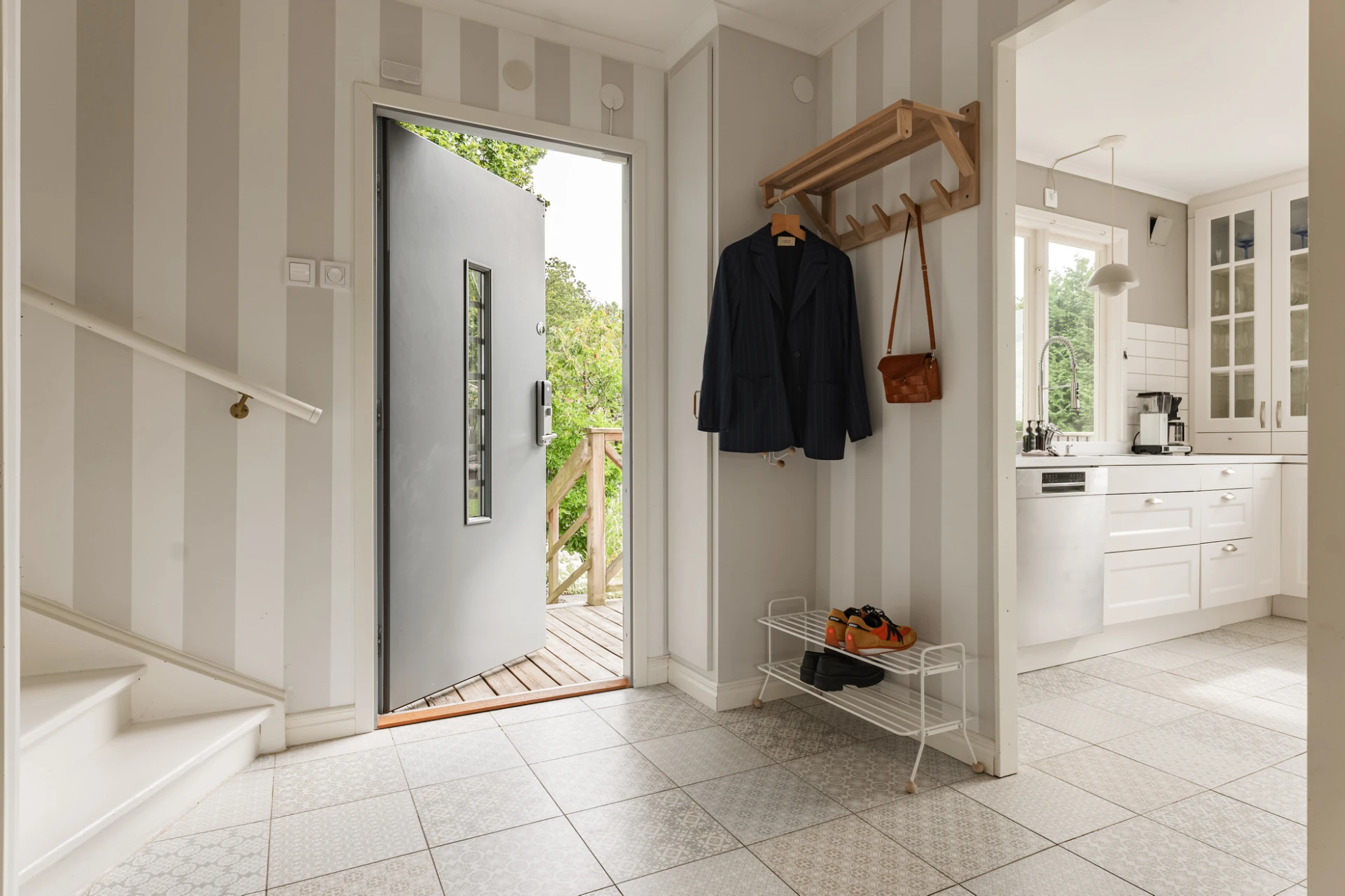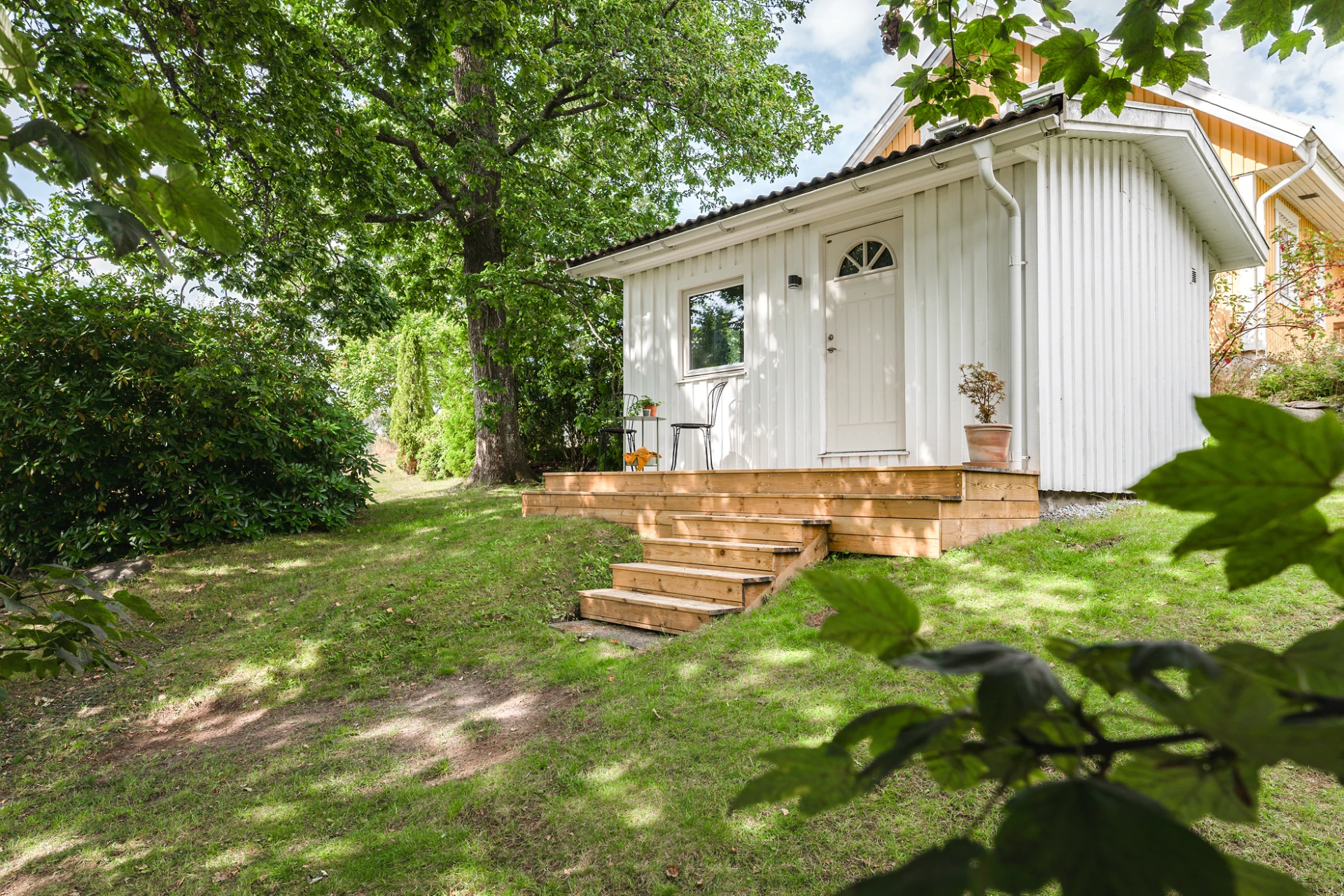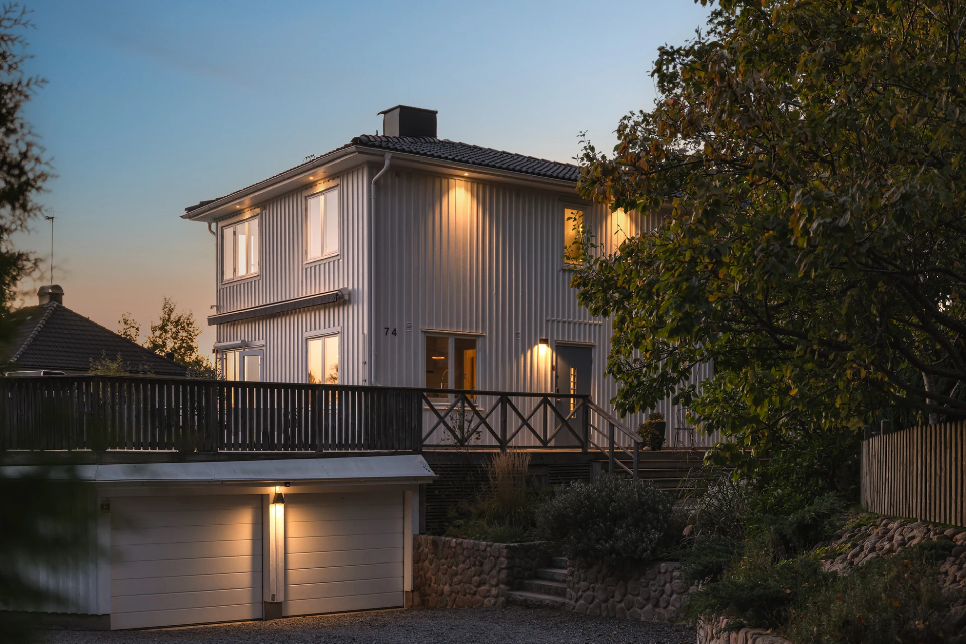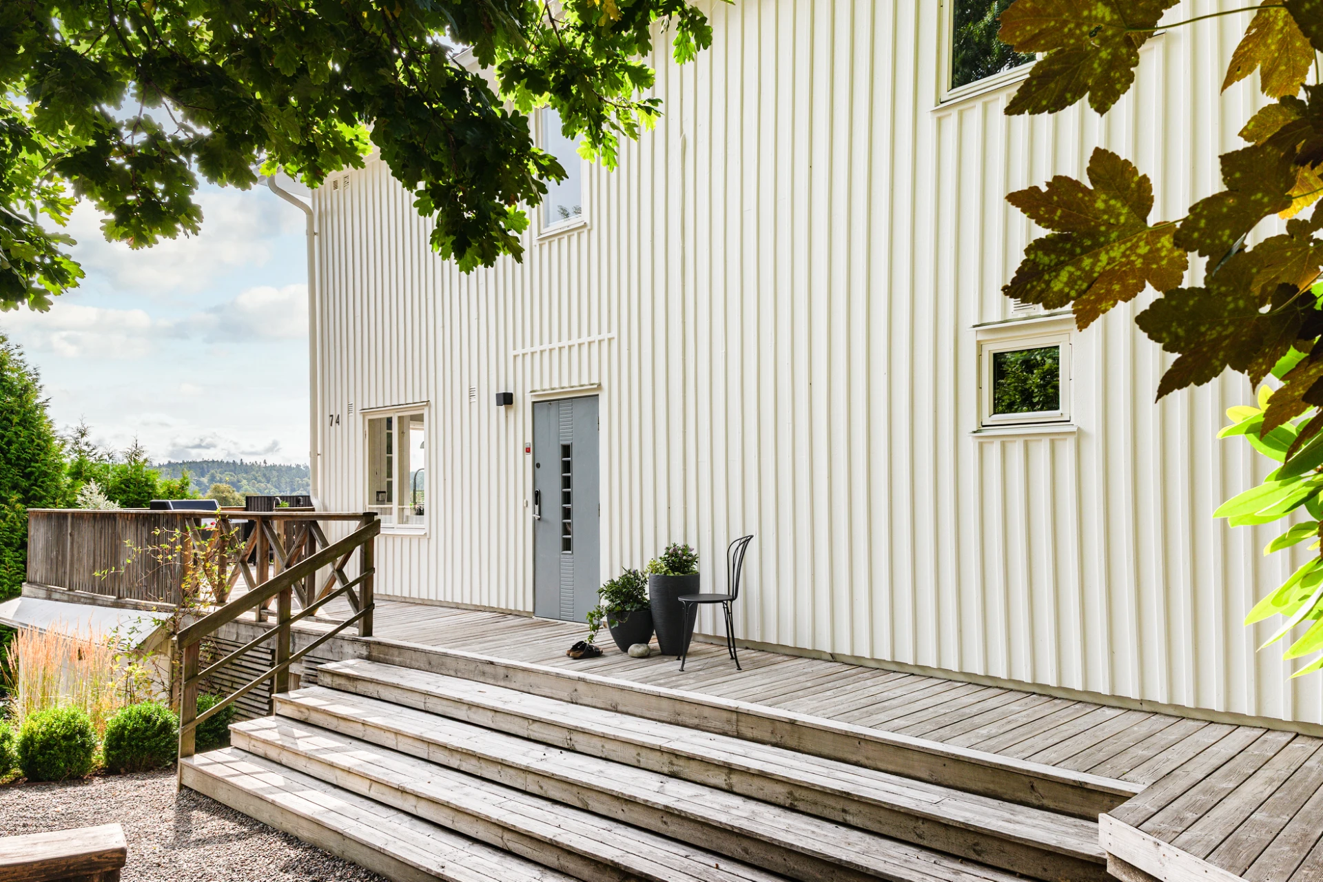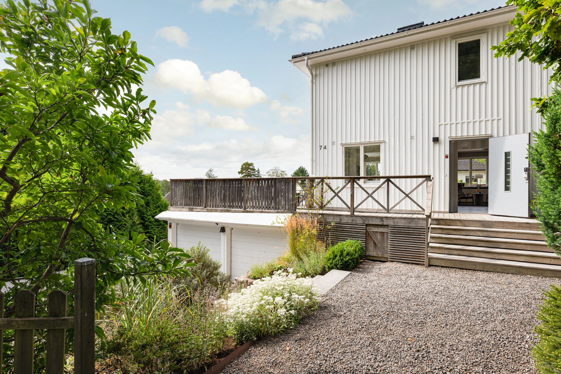 Redan vid ankomsten skapas en välkomnande atmosfär. Kullerstensmurar, den breda trappan och omsorgsfulla planteringar leder upp till huset och ger en inramning som både är proper och inbjudande.