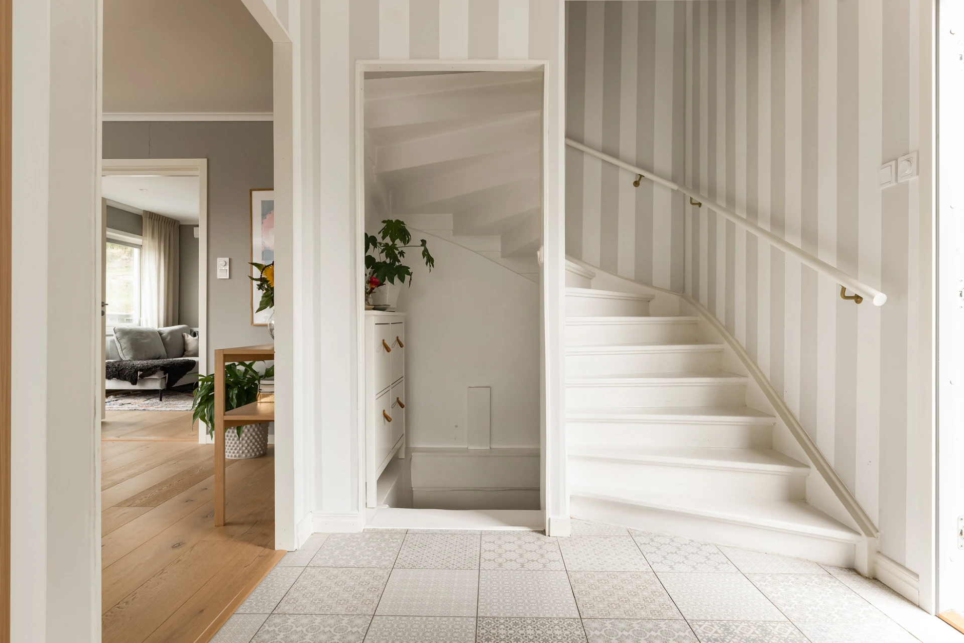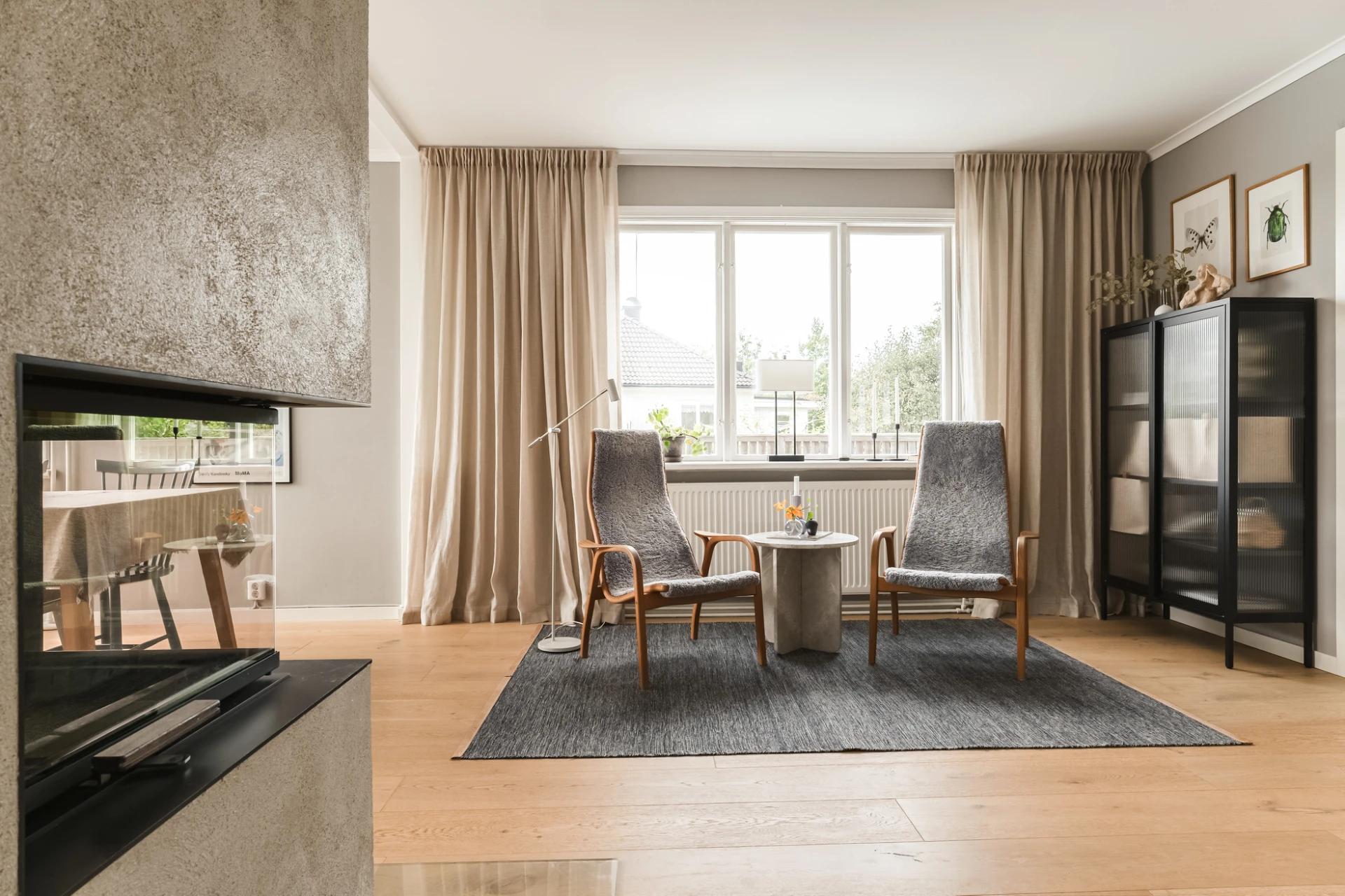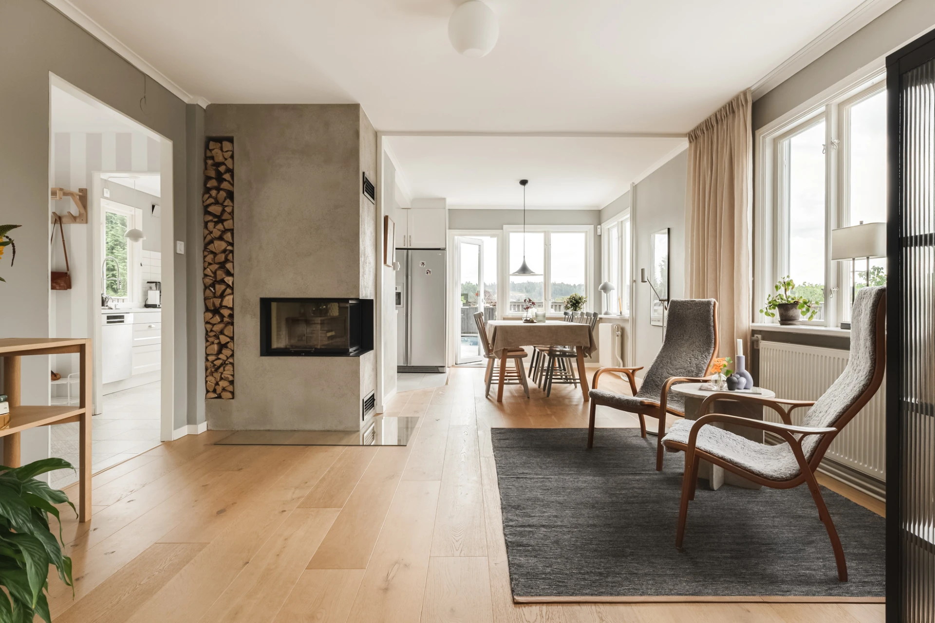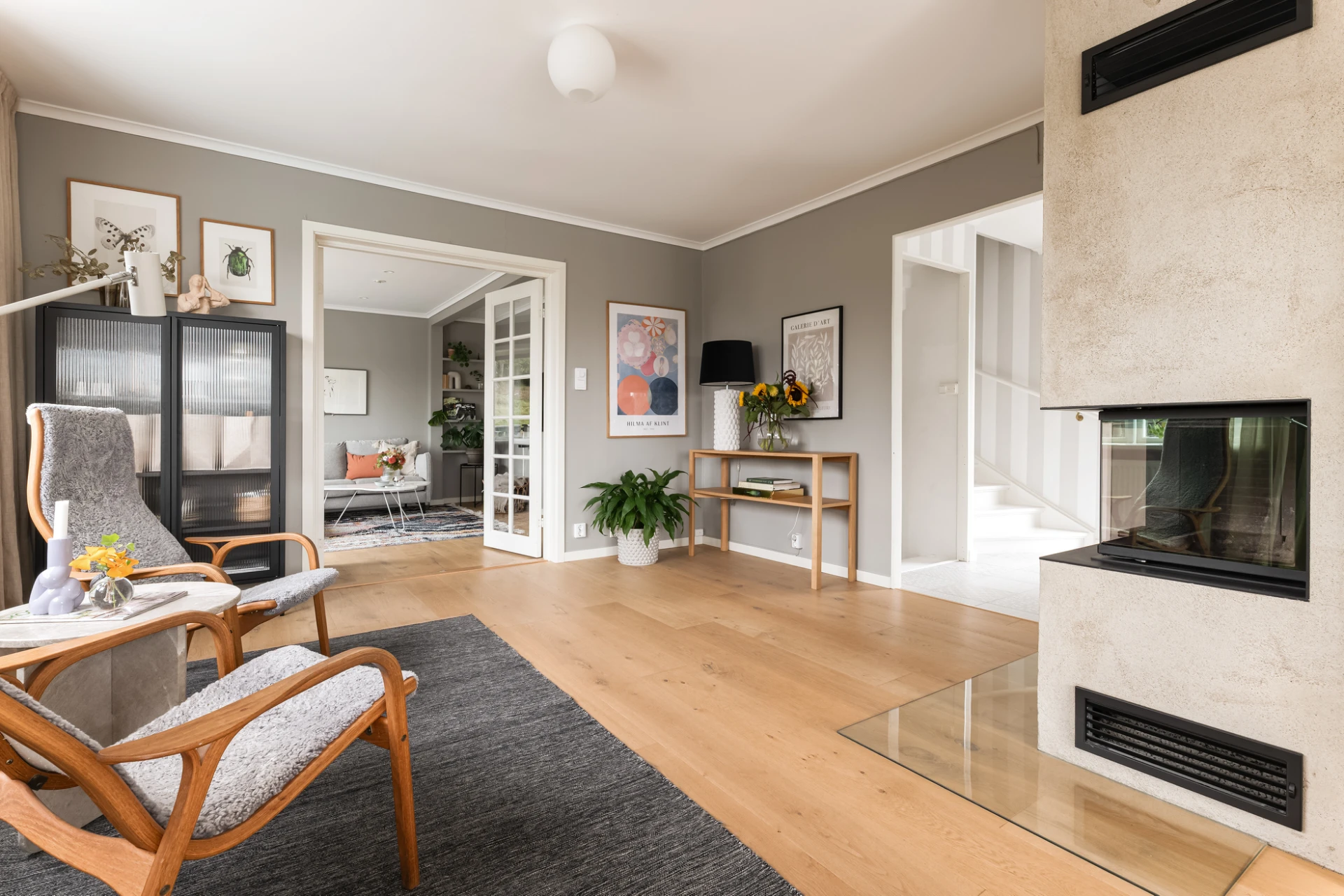 Inne möts du av en genomgående smakfull interiör där varje detalj är noggrant avvägd. En vacker enstavsparkett i varm ton från Pergo löper genom rummen och samspelar med harmoniska färgval och påkostade material. De stora fönsterpartierna fyller huset med ljus och skapar en naturlig känsla av rymd och elegans.