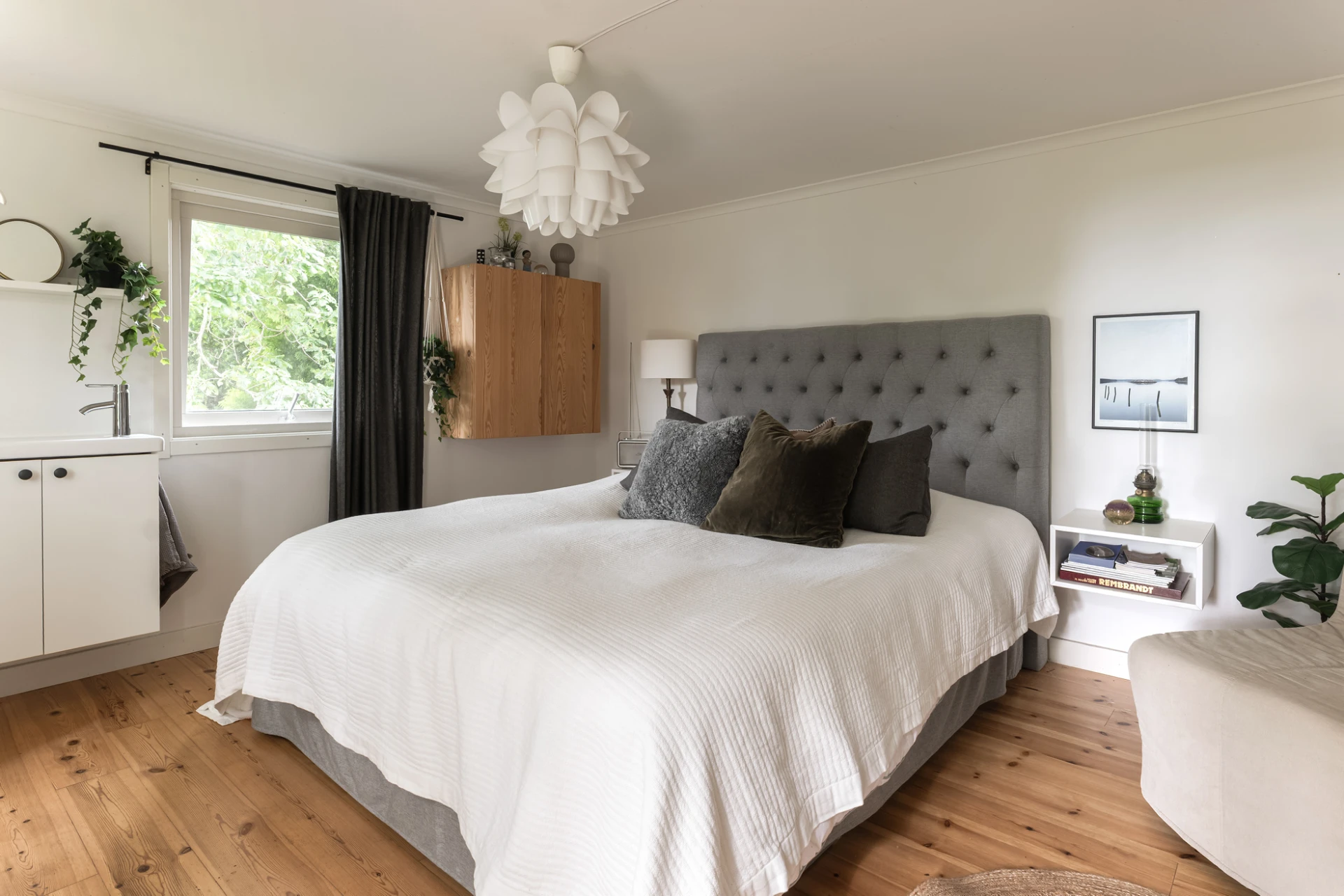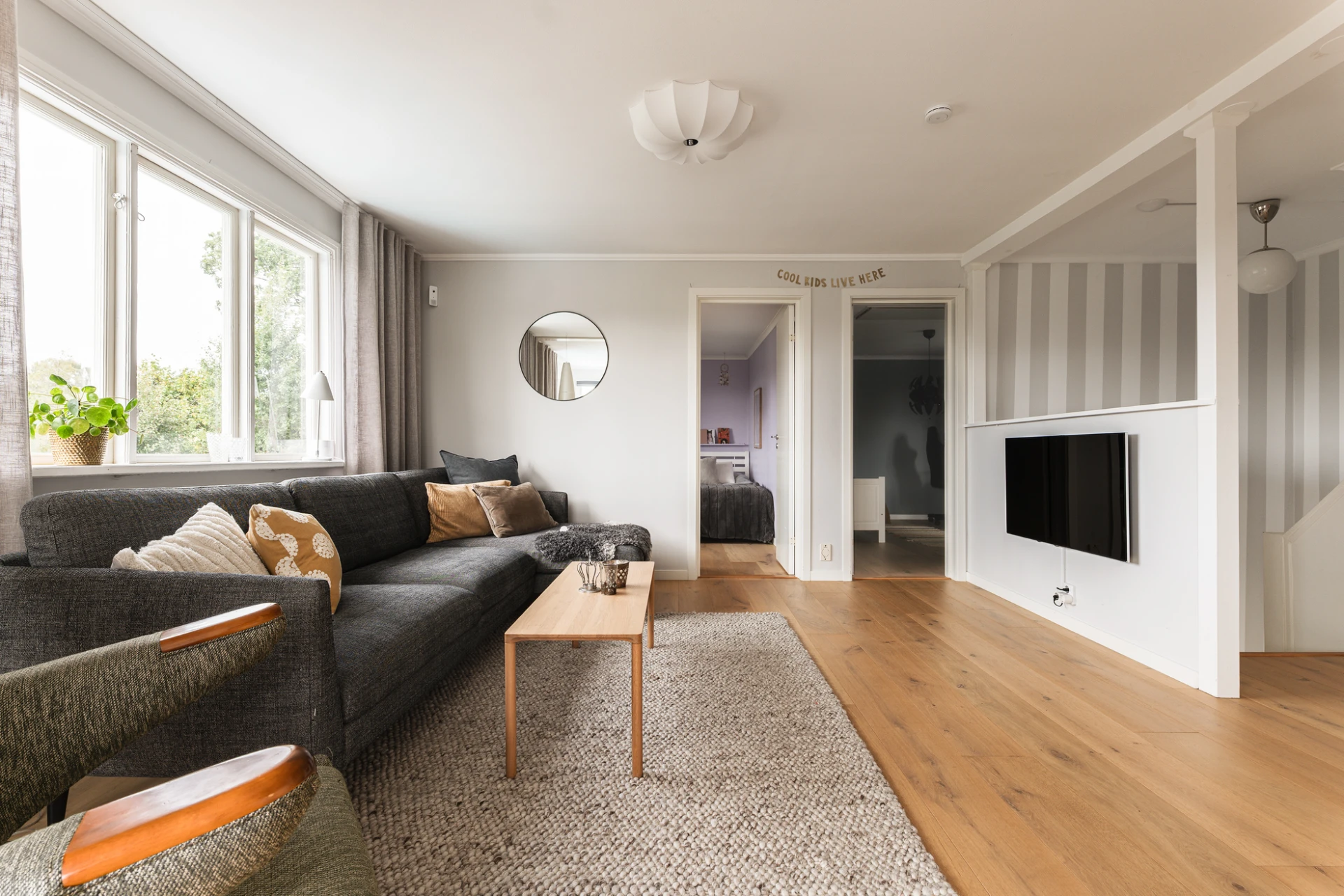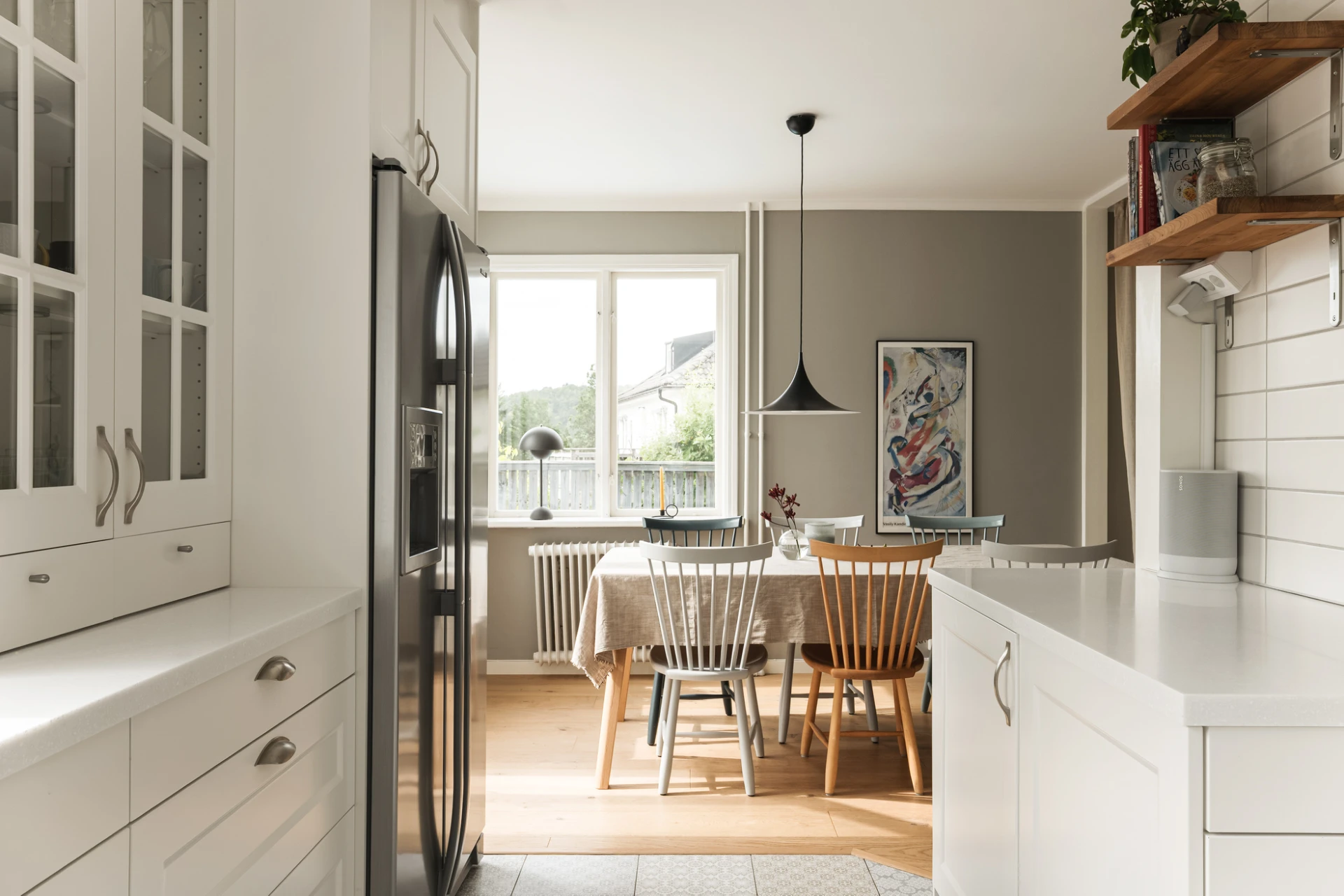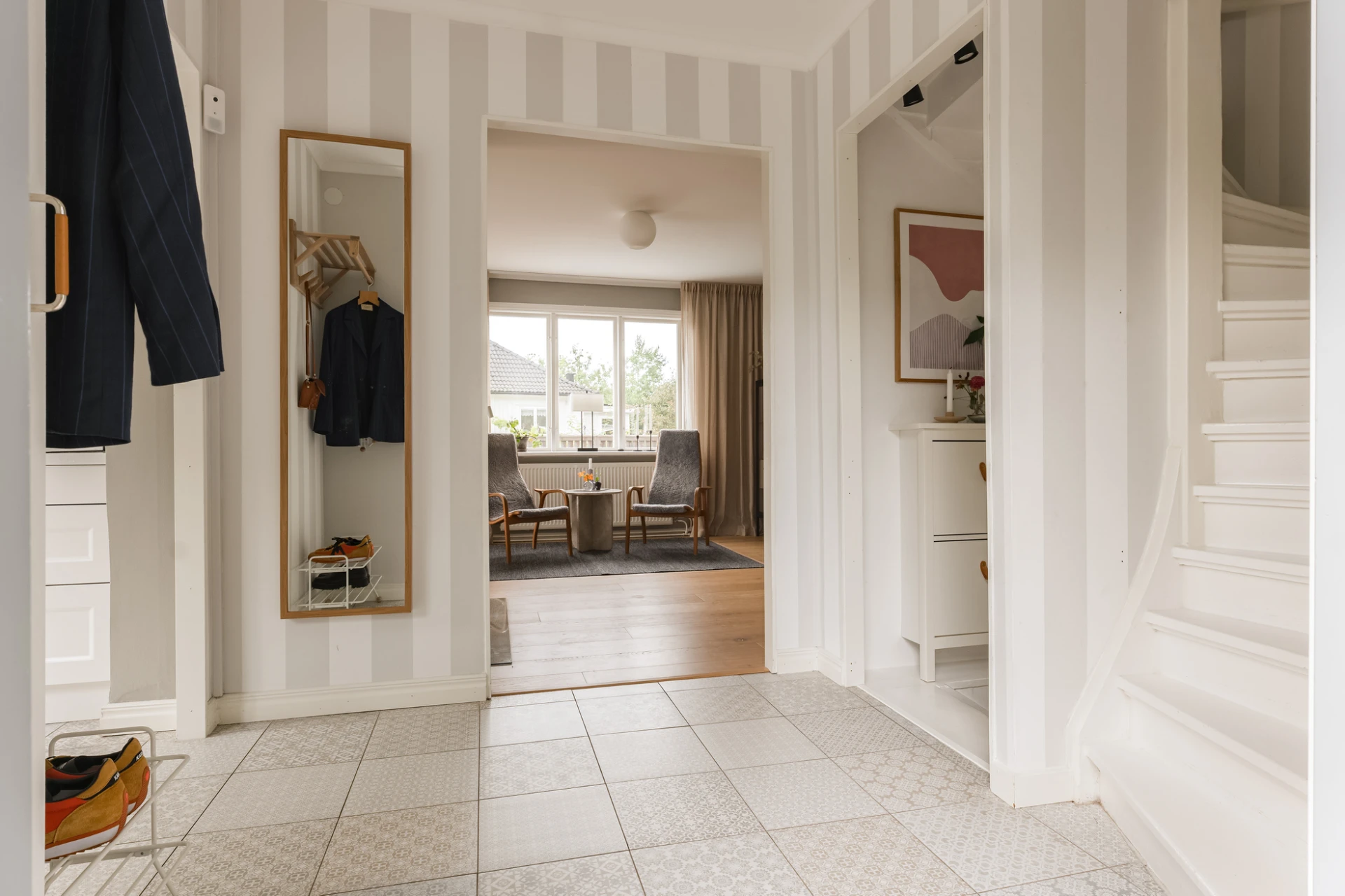 Inne möts du av en genomgående smakfull interiör där varje detalj är noggrant avvägd. En vacker enstavsparkett i varm ton från Pergo löper genom rummen och samspelar med harmoniska färgval och påkostade material. De stora fönsterpartierna fyller huset med ljus och skapar en naturlig känsla av rymd och elegans.