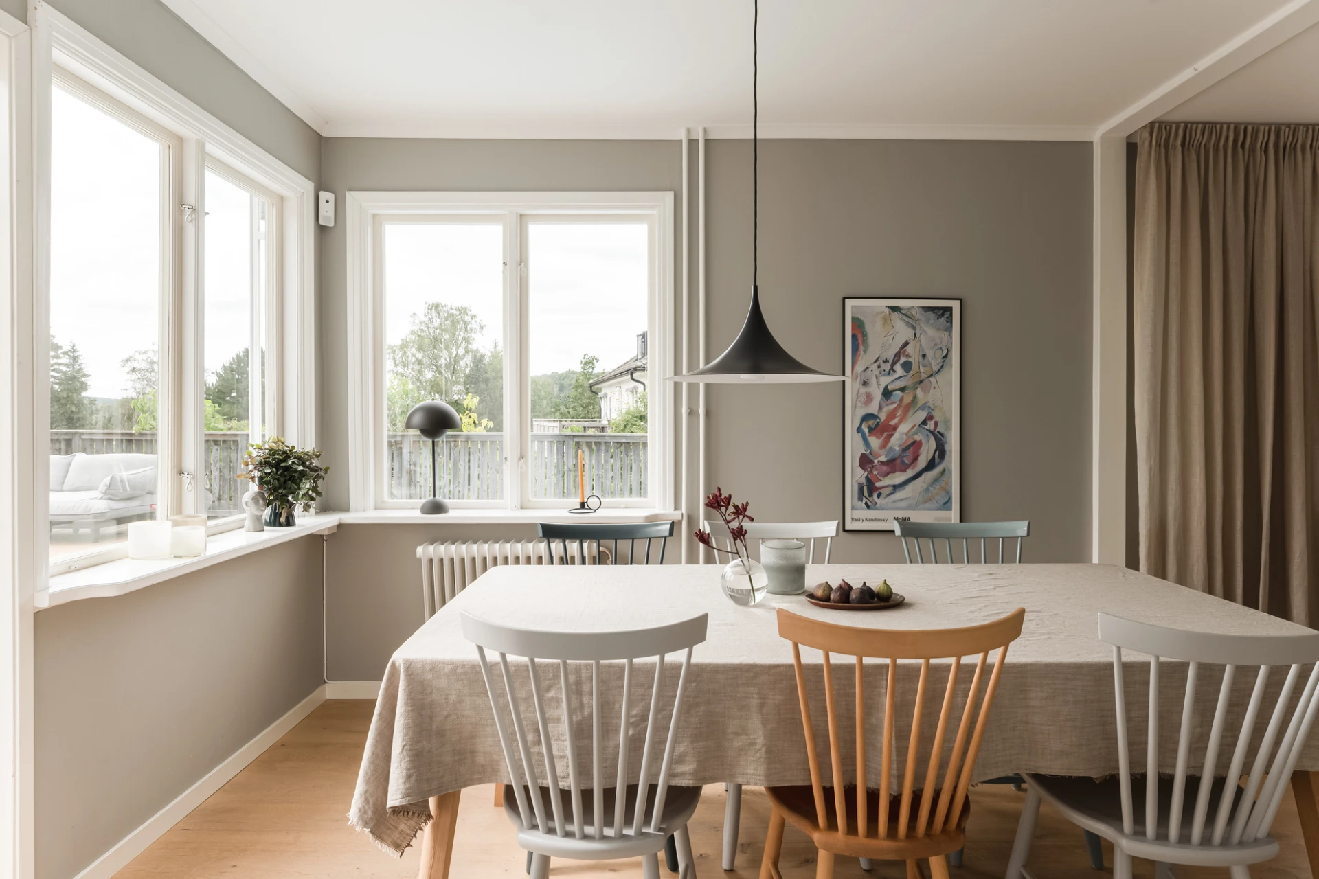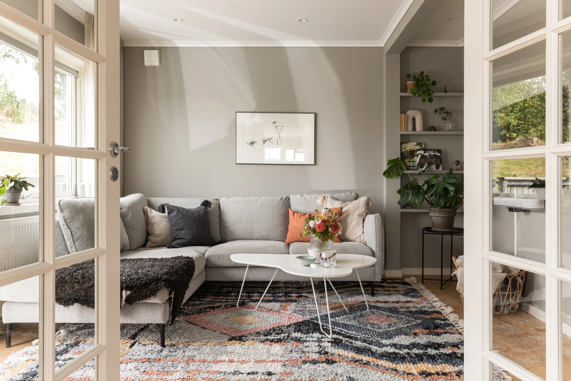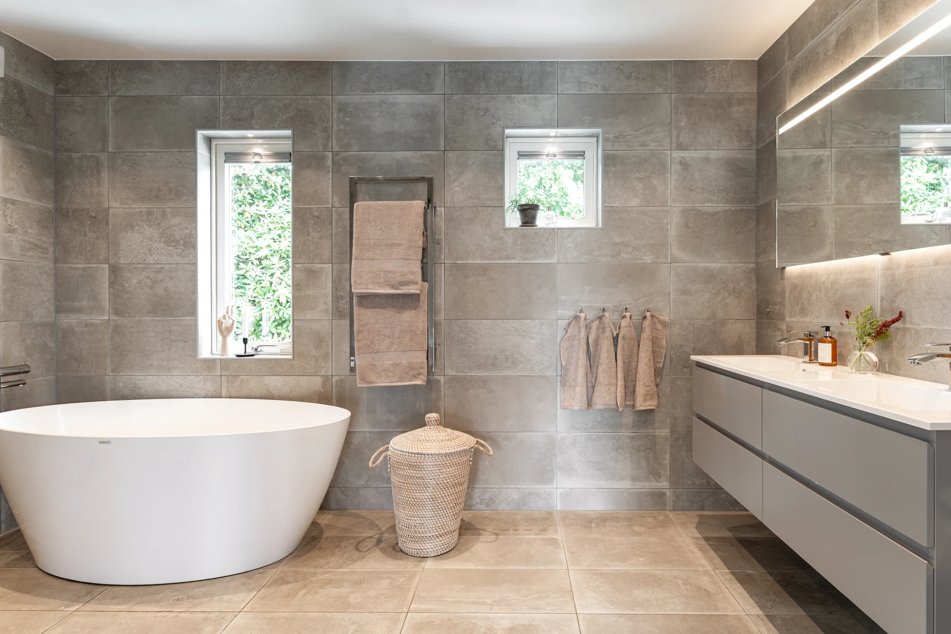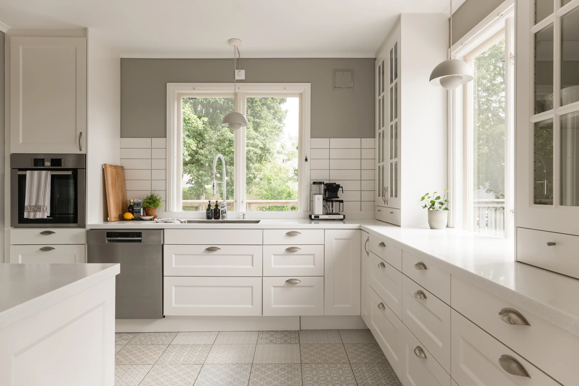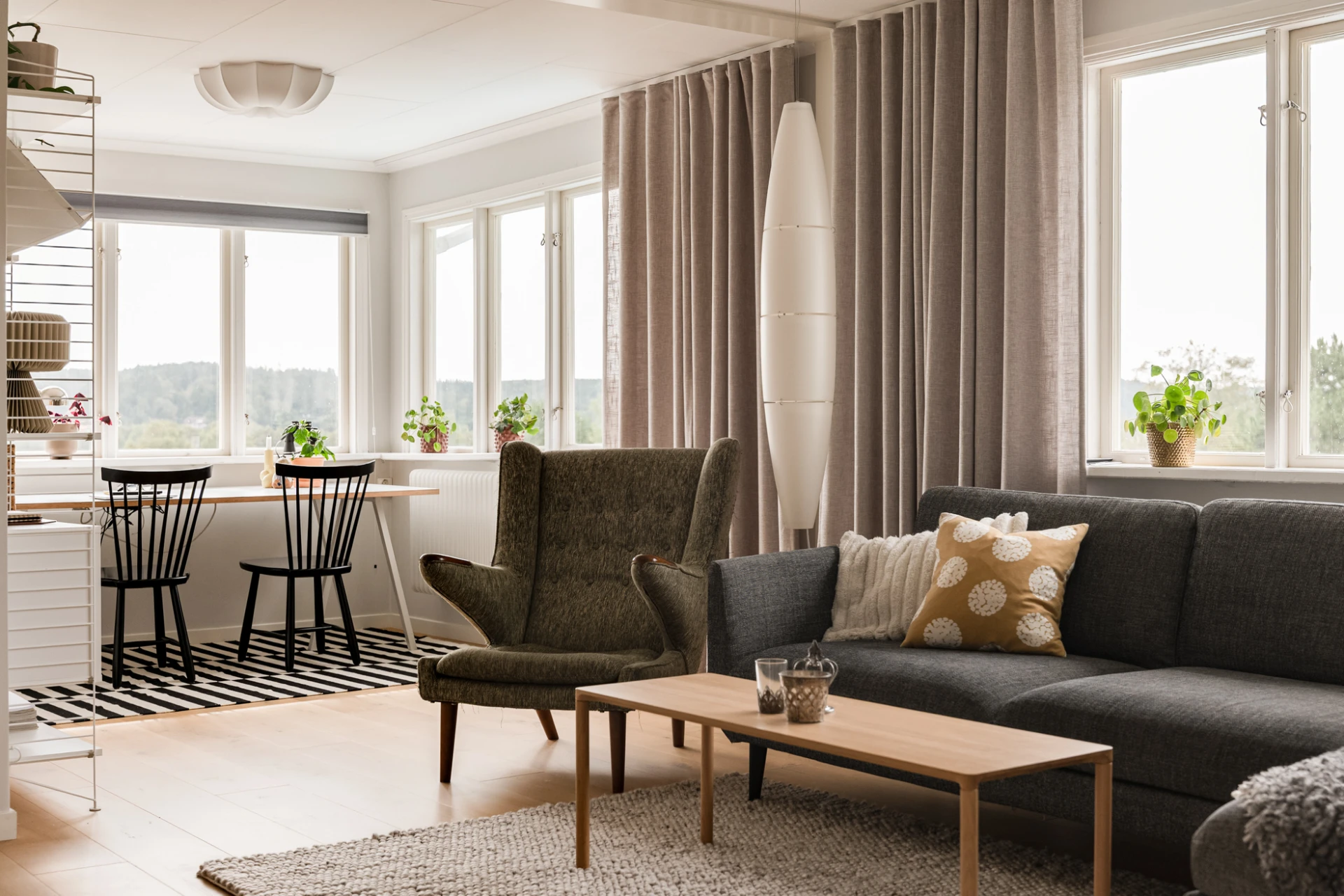 Inne möts du av en genomgående smakfull interiör där varje detalj är noggrant avvägd. En vacker enstavsparkett i varm ton från Pergo löper genom rummen och samspelar med harmoniska färgval och påkostade material. De stora fönsterpartierna fyller huset med ljus och skapar en naturlig känsla av rymd och elegans.