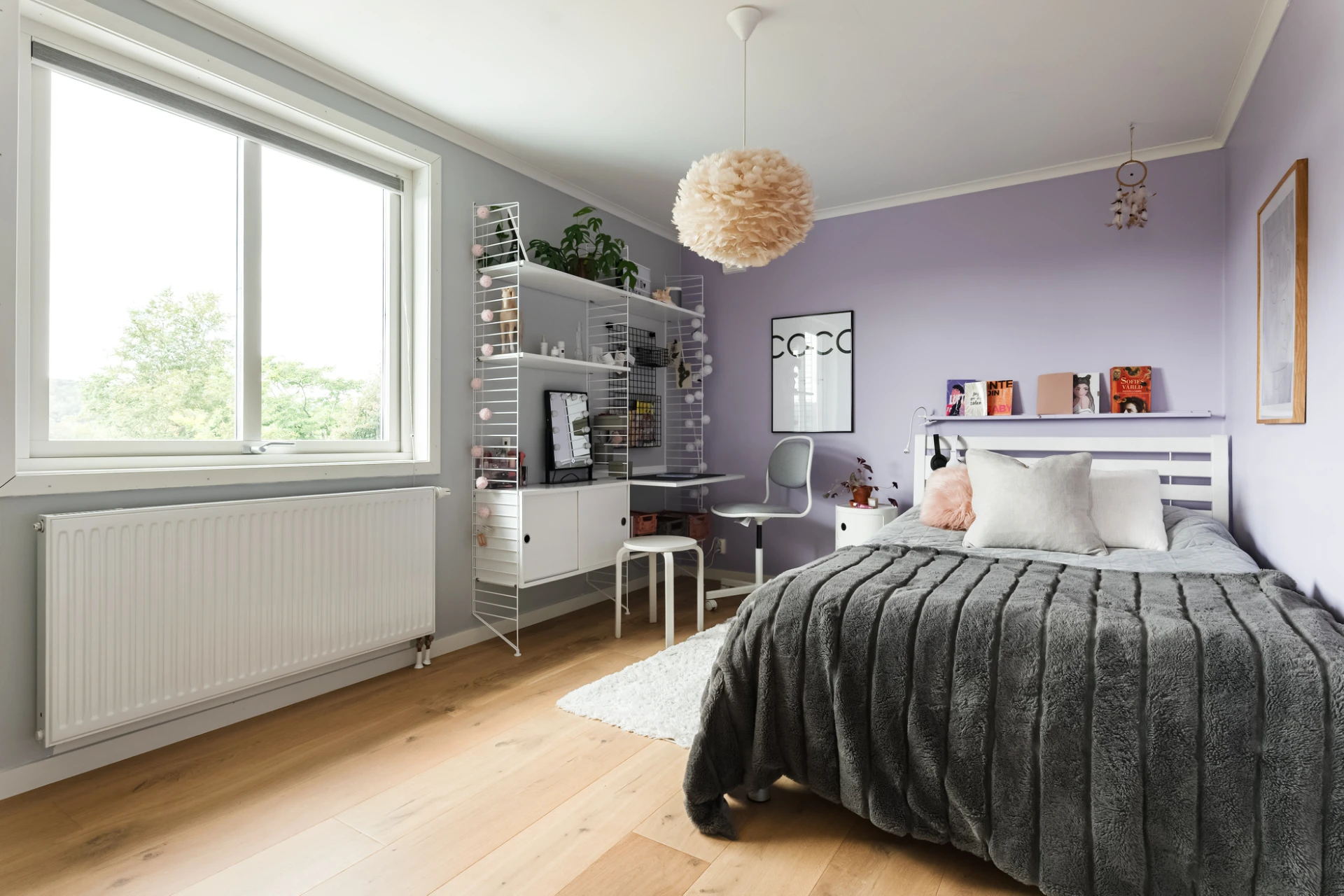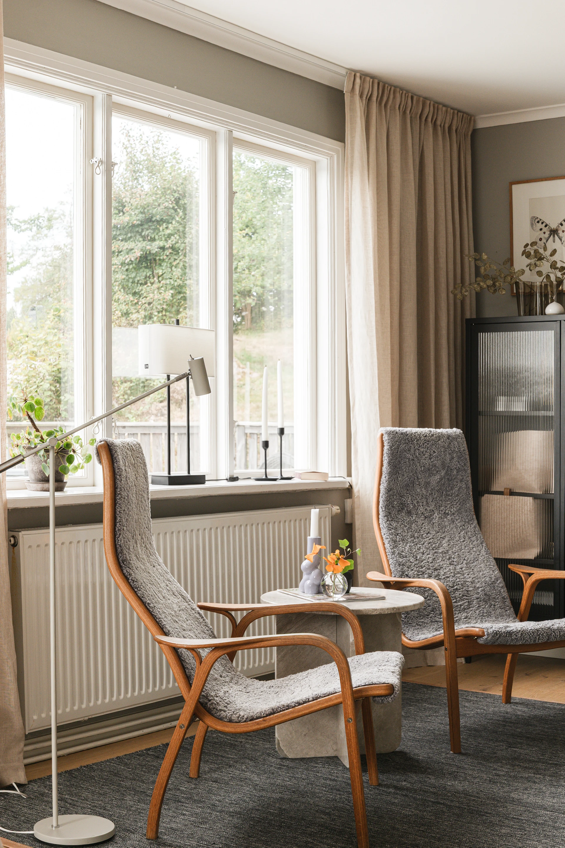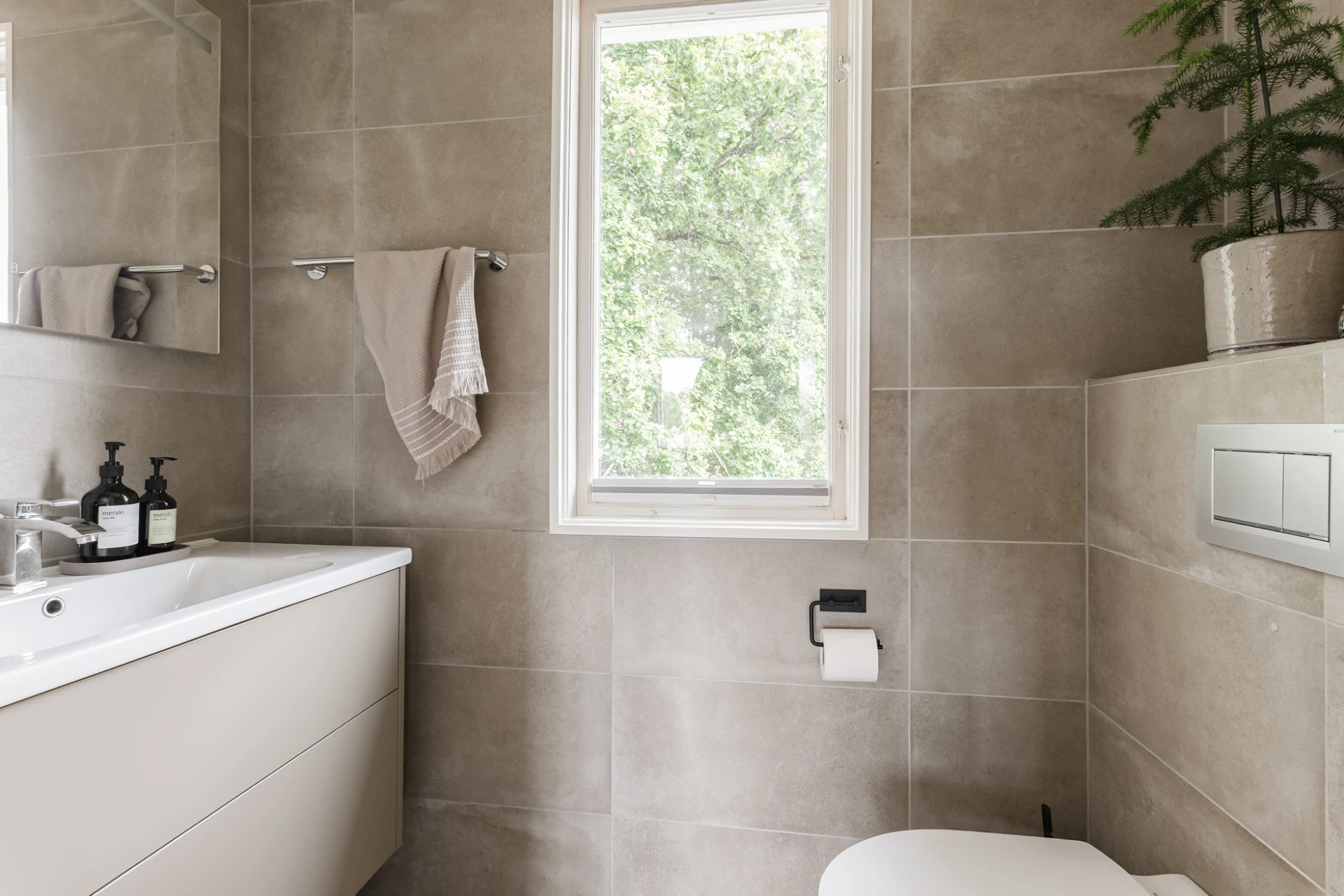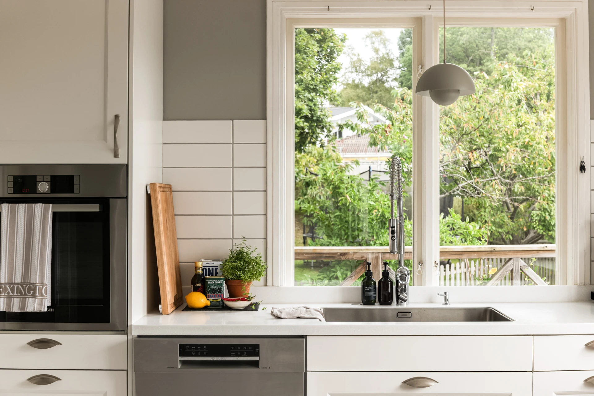 Inne möts du av en genomgående smakfull interiör där varje detalj är noggrant avvägd. En vacker enstavsparkett i varm ton från Pergo löper genom rummen och samspelar med harmoniska färgval och påkostade material. De stora fönsterpartierna fyller huset med ljus och skapar en naturlig känsla av rymd och elegans.