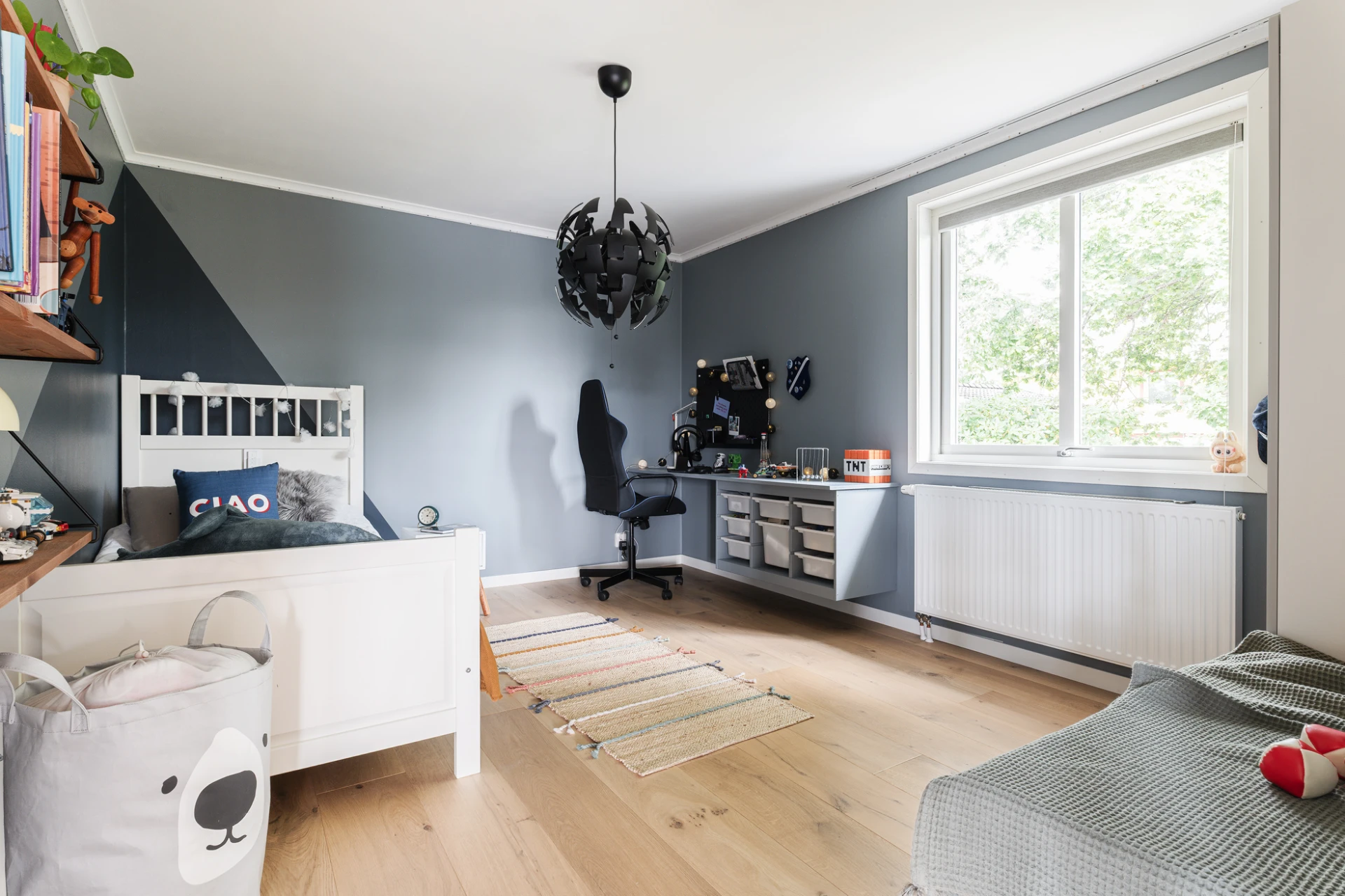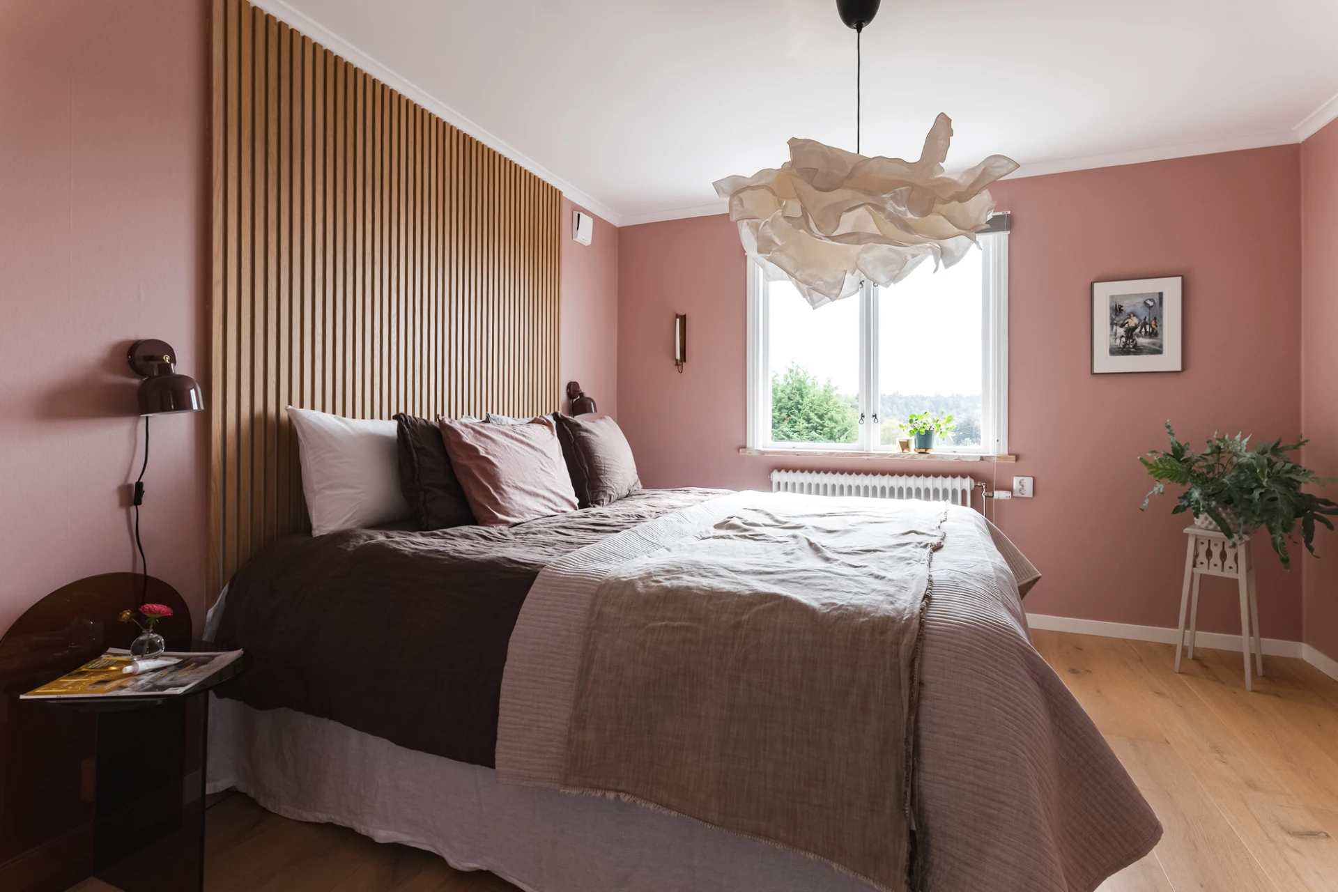 Övre plan rymmer tre till fyra sovrum, ett ljust sällskapsrum och en toalett i samma stilfulla utförande som det exklusiva badrummet. Varje sovrum är smakfullt färgsatt i trendiga, genomtänkta toner – där varje rum fått sin egen karaktär – vilket skapar en varm och hemtrevlig känsla. Den enhetliga ekparketten binder samman våningsplanet och förstärker helhetsintrycket. Sällskapsrummet är luftigt och öppet, med ett vackert fönsterparti som släpper in rikligt med ljus och bjuder på vidsträckt utsikt. För den som önskar kan rummet enkelt återställas till ett fjärde sovrum.