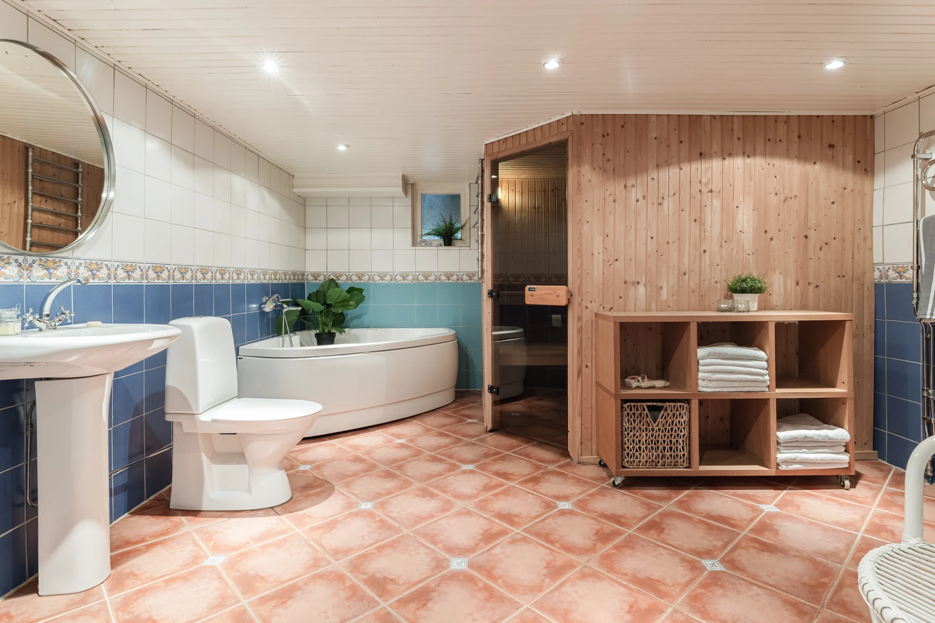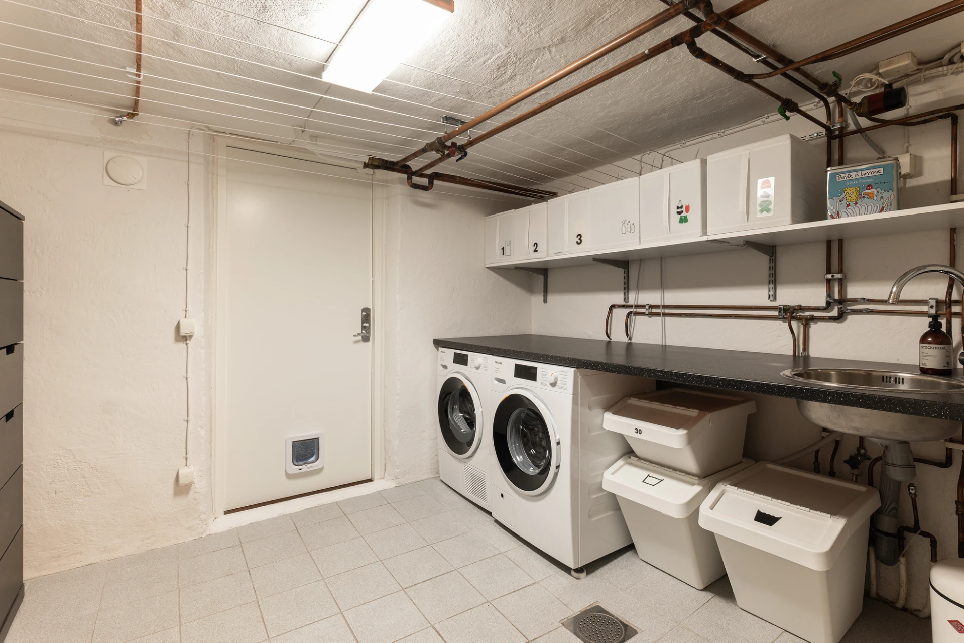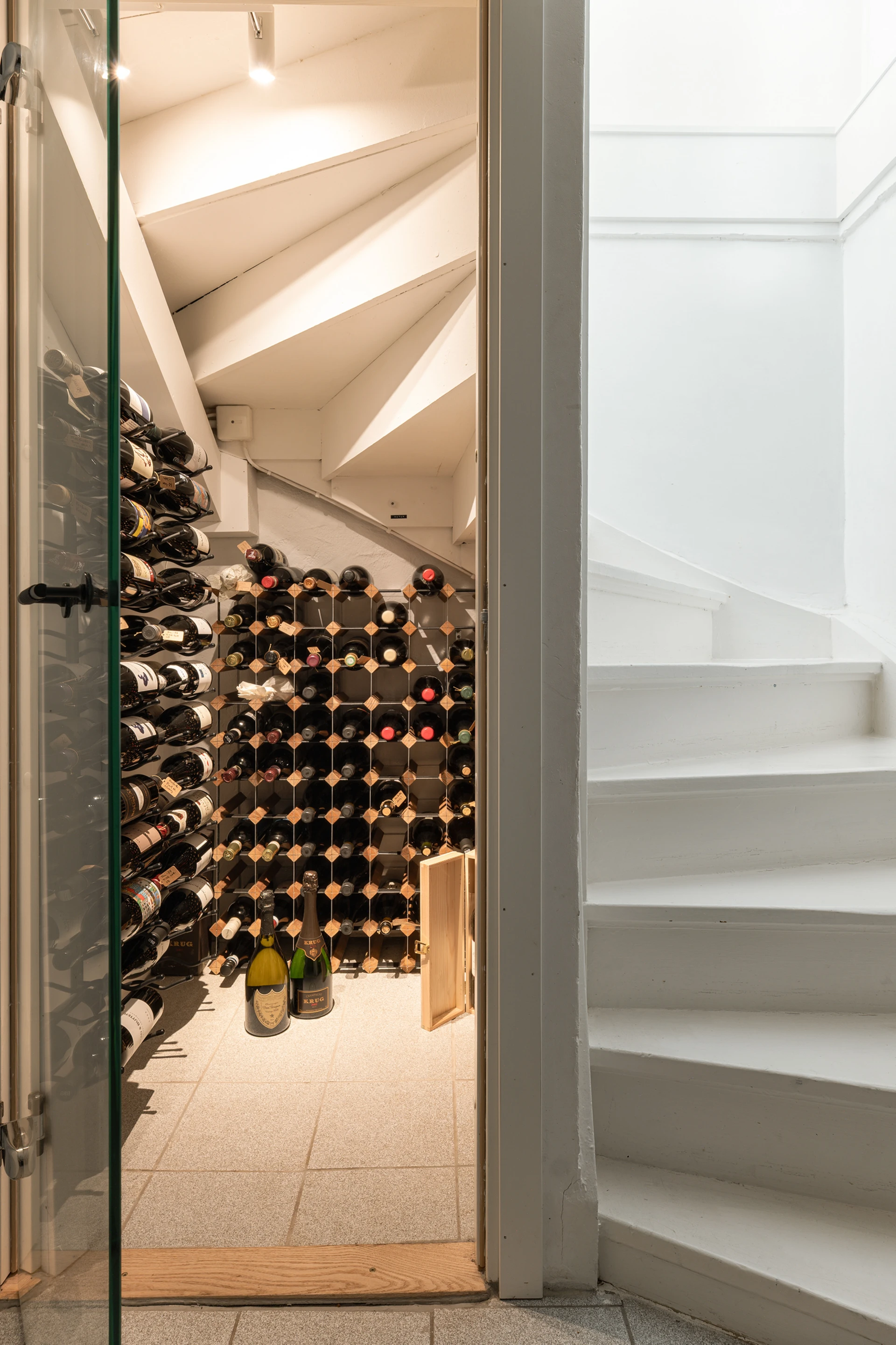 Källarplanet förenar det praktiska med det njutbara. Här finns ett stort badrum med dusch, hörnbadkar och husets bastu – en egen spa-oas för avkoppling året runt. I nära anslutning ligger ett stilfullt vinrum under trappan, inrett med glasdörr och stämningsfull belysning – en vacker detalj som förhöjer helhetsupplevelsen. På samma plan finns även tvättstugan med egen entré, generösa arbetsytor och en stor klädkammare som underlättar vardagen.
