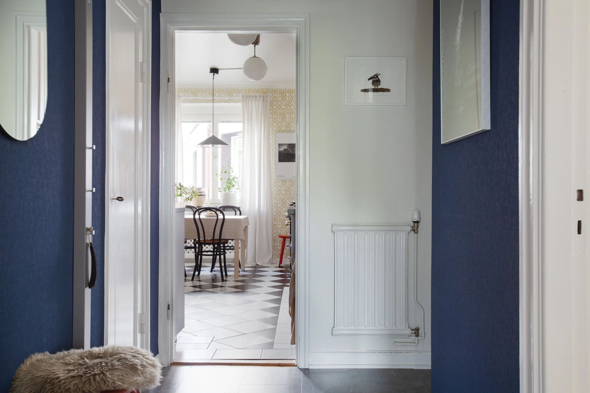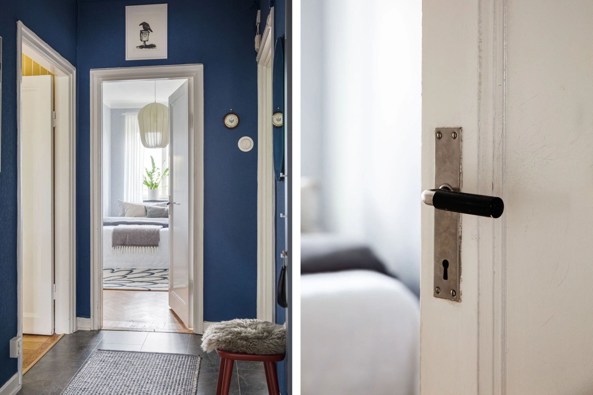 Laminatgolv och tapetserade väggar i mörkblå Caselio Linen. Här finns plats för avhängning samt förvaring i två garderober. Lägenheten är utrustad med säkerhetsdörr.