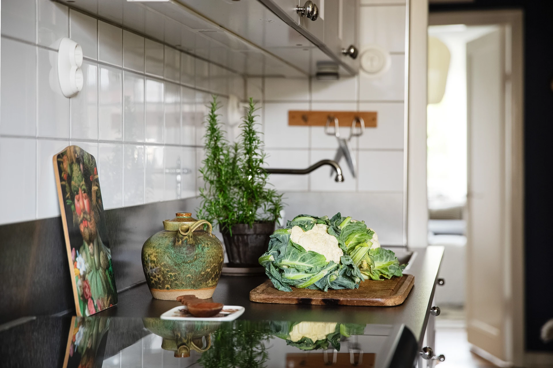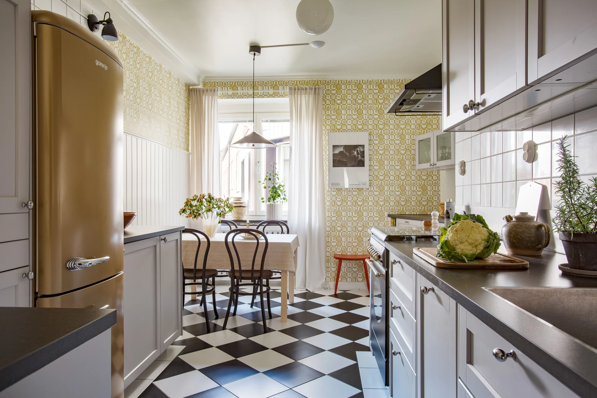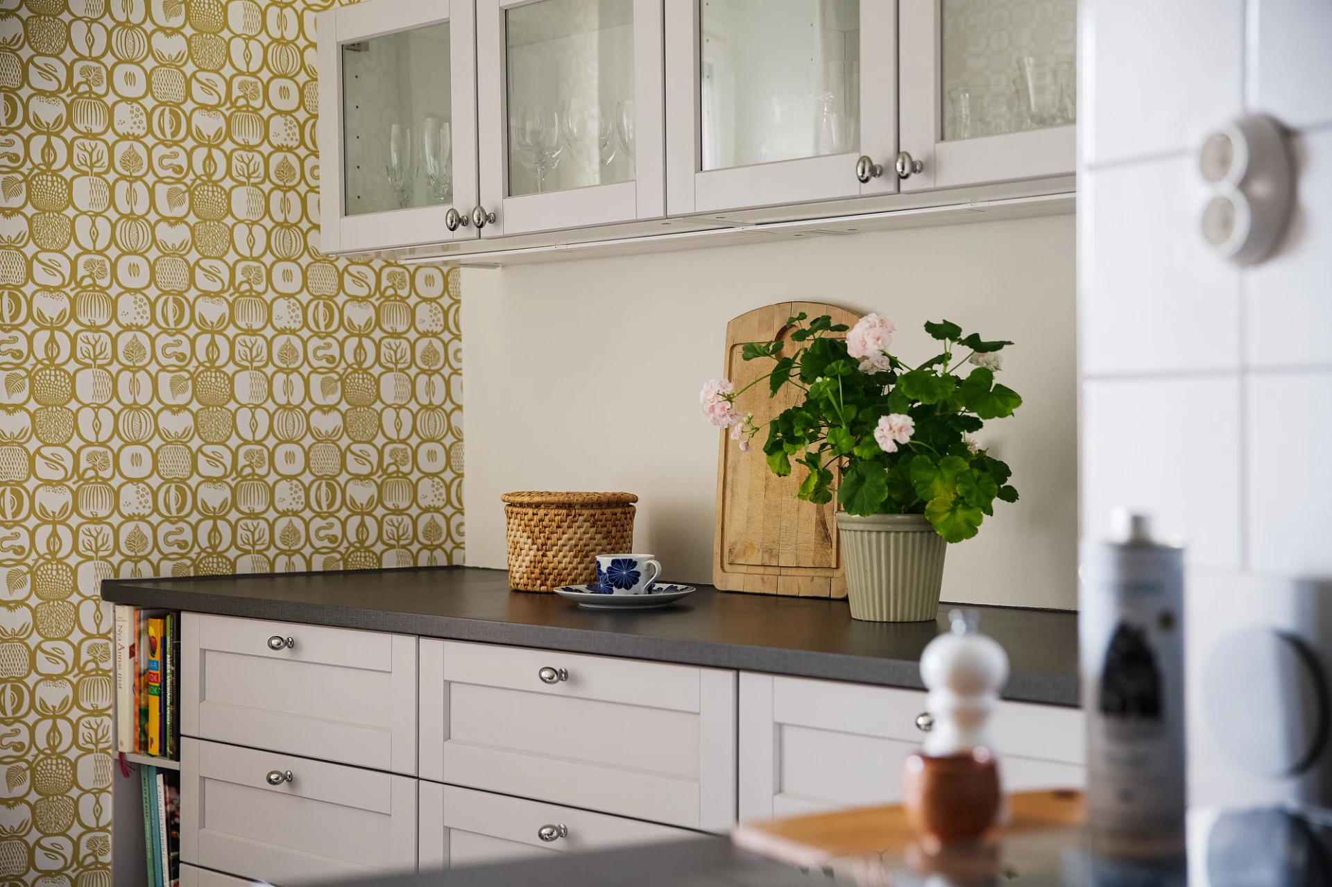 Klinkergolv med golvvärme och målade samt tapetserade väggar i Boråstapeter "Fruktlåda" av Stig Lindberg. Köksinredning i grått och ovanför bänkskivan i laminat sitter vitt kakel som belyses av spotlights med dimmerfunktion. Köket är utrustat med kombinerad kyl/frys, gasspis med elugn, köksfläkt och diskmaskin. Matplats för ca 6 personer.